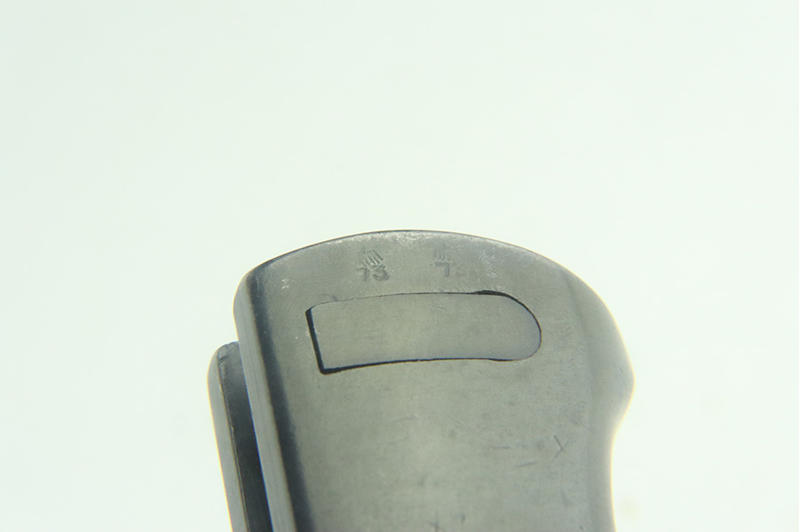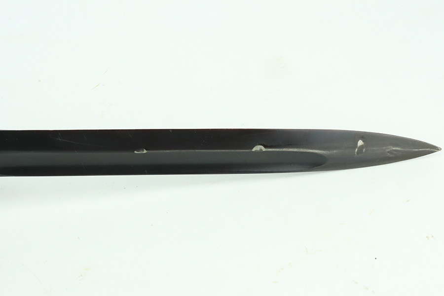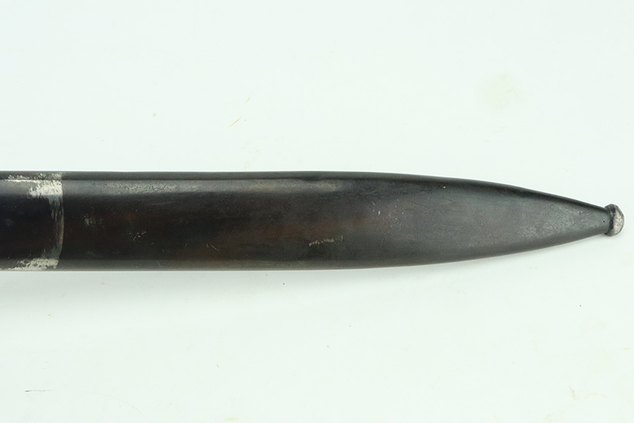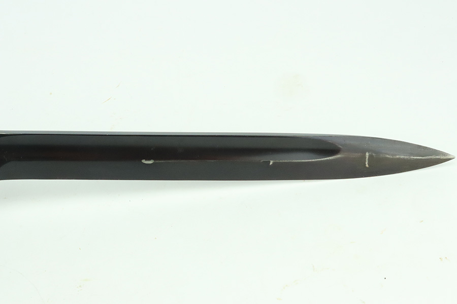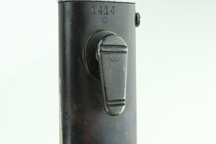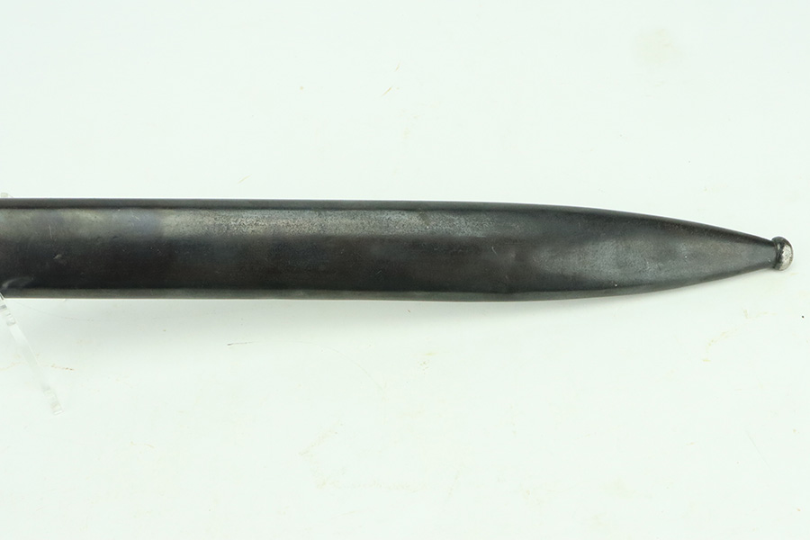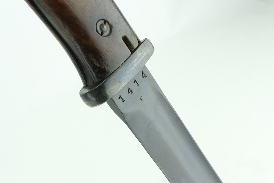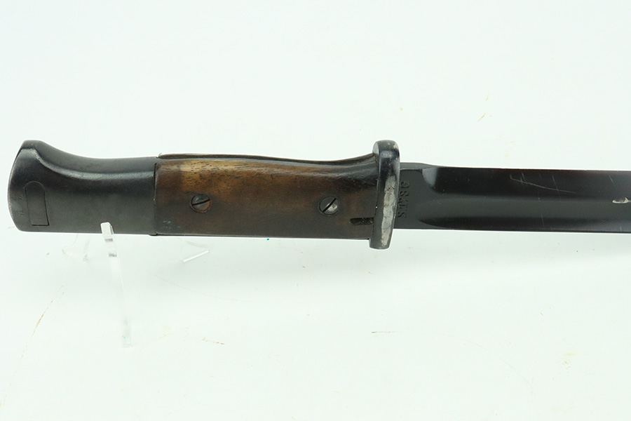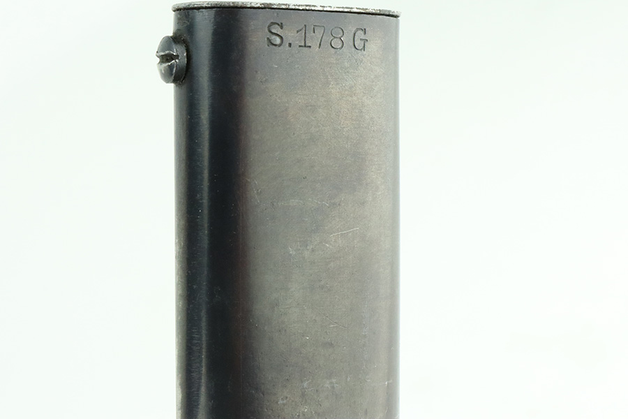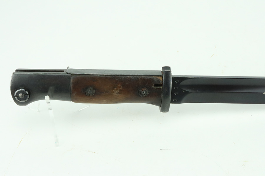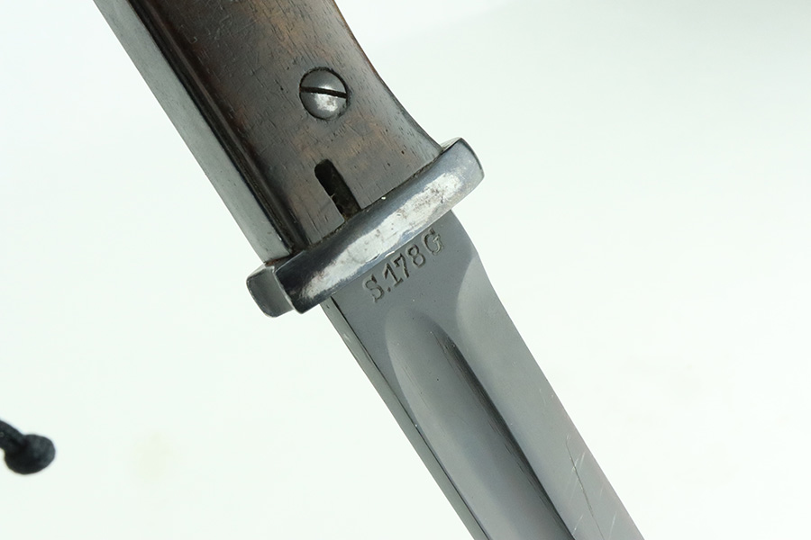 5/20/24 – This is a very nice example of an early “G Date” Mauser K98 bayonet, manufactured in 1935. Comes with its original matching-numbered scabbard. Both are “S.178G” marked. “Eagle 73” proofs on the handle. Fitted with wood grips. There is an area of wear on the scabbard and some small dots of discoloration on the blade. Tip was repaired at some point as it is slightly shorter than standard length.