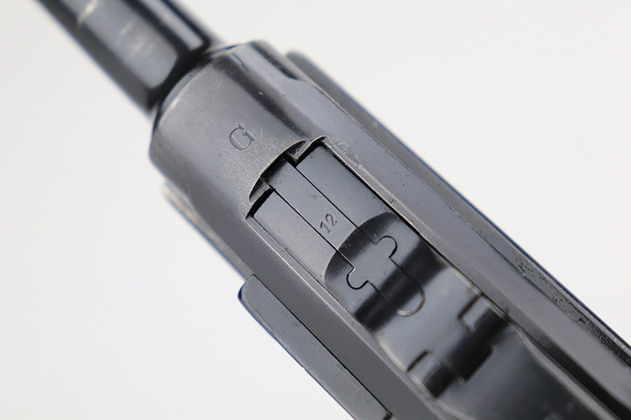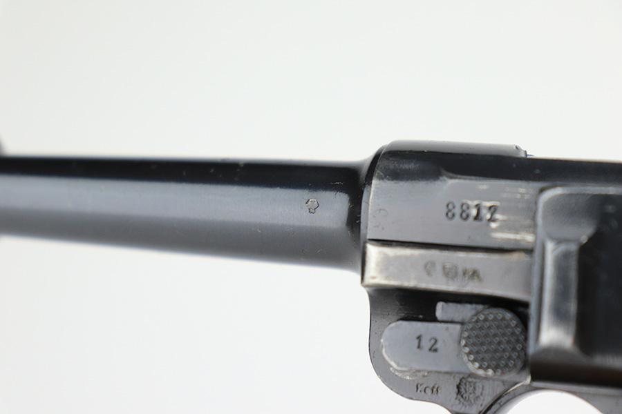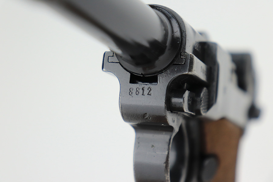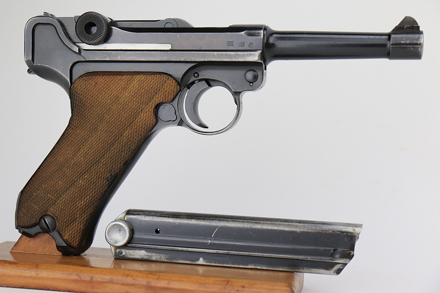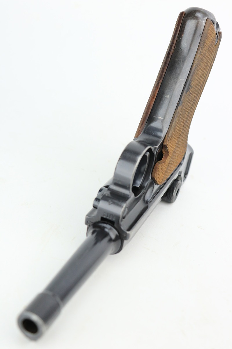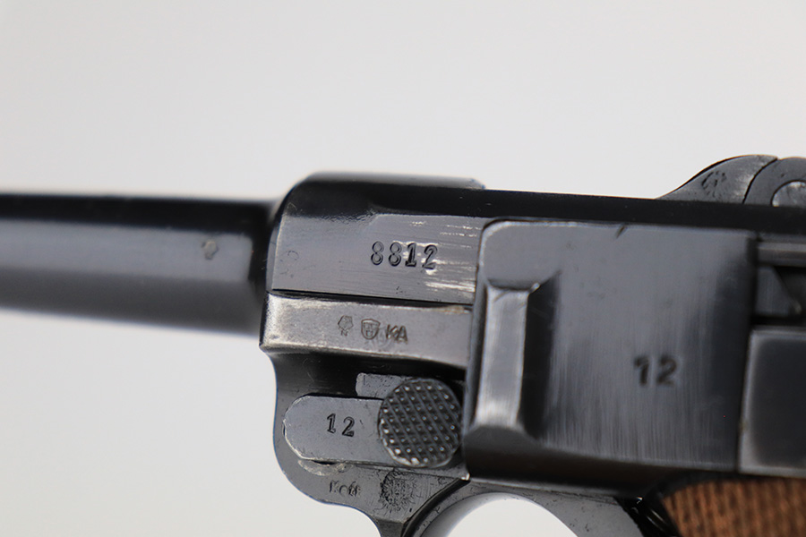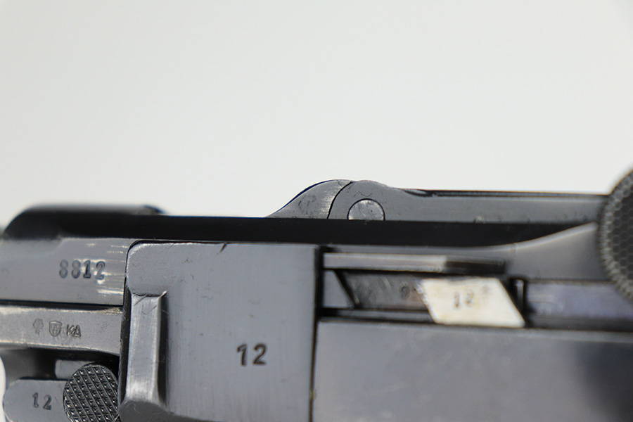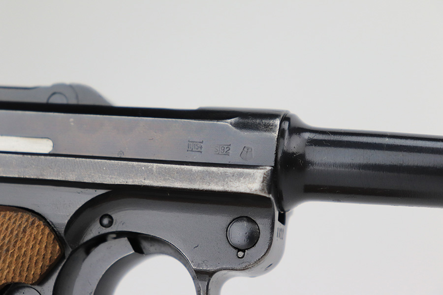 5/31/23 – This is a very nice example of a G Date Mauser Luger issued to the Nazi military in 1935. It is mostly matching, but the sear bar is mismatched, the firing pin is un-numbered, and the barrel is an un-numbered commercial replacement. There are East German police “sunburst” markings on the frame and some West German export markings throughout. The entire gun has been re-blued. There is thinning on the grip straps and minor wear around the muzzle and on some of the high edges. Some light streaks of wear on the barrel. Some tiny scratches on the left side of the frame. Some tiny pits on the front strap. Fitted with an excellent set of replacement wood grips. Comes with a matching police arsenal-numbered magazine. The bore has good rifling with minor freckling throughout.