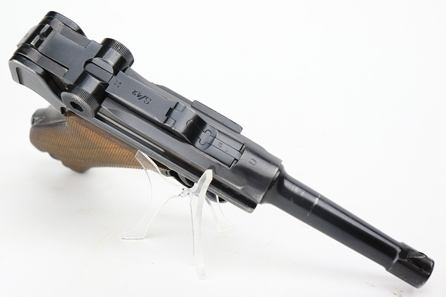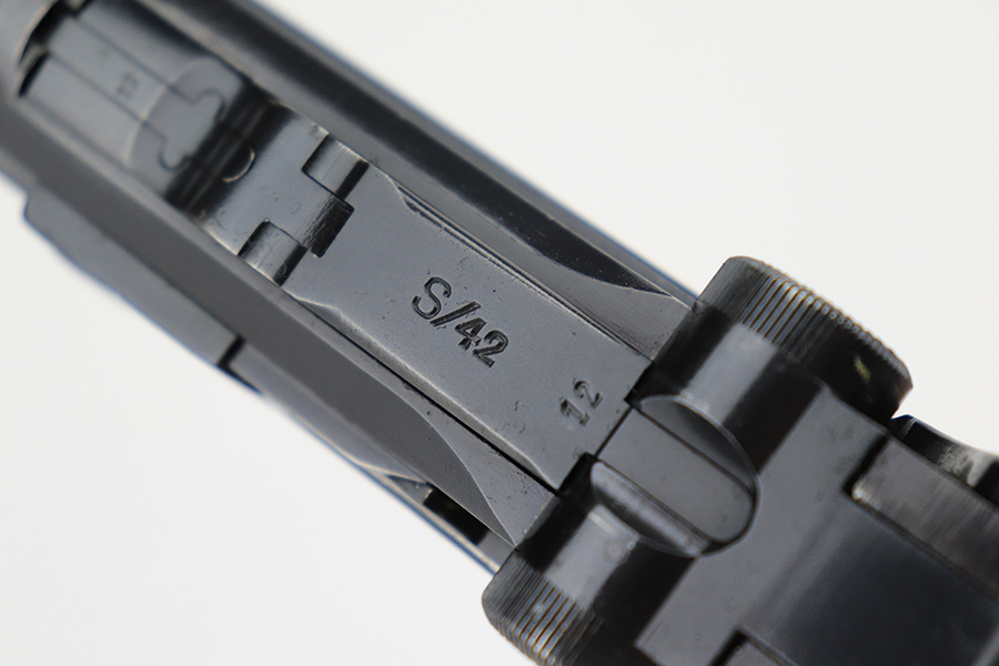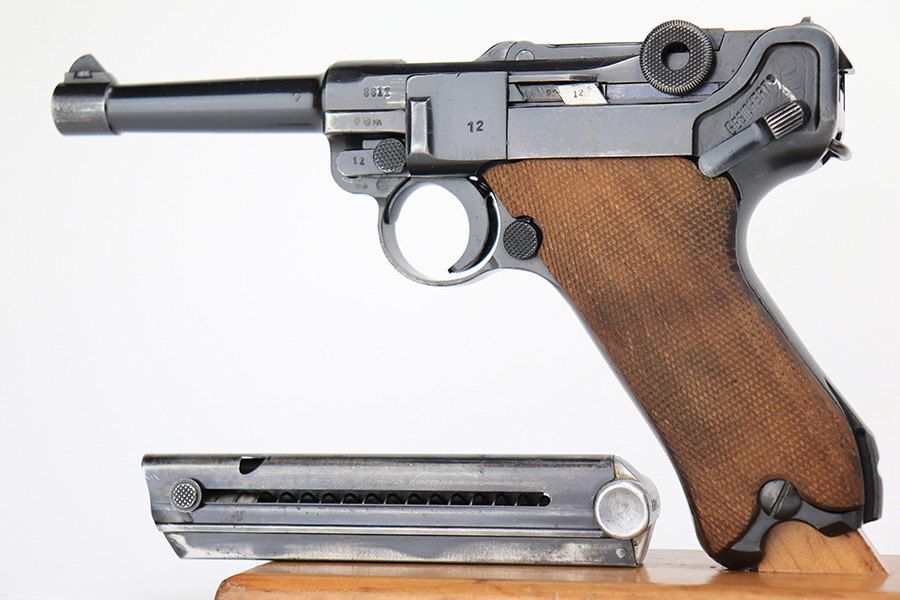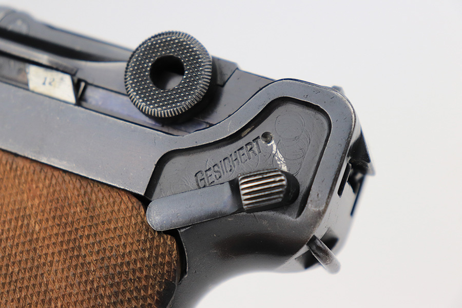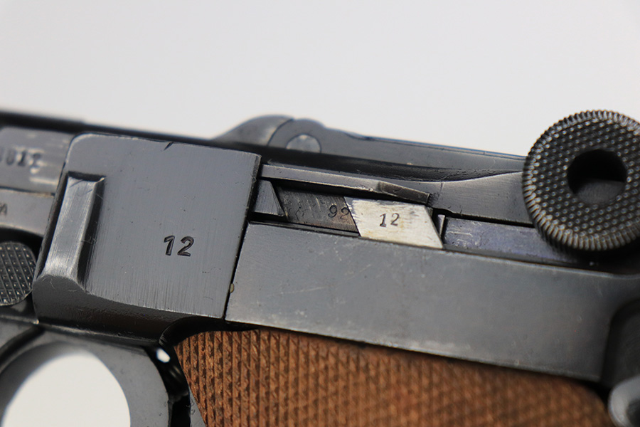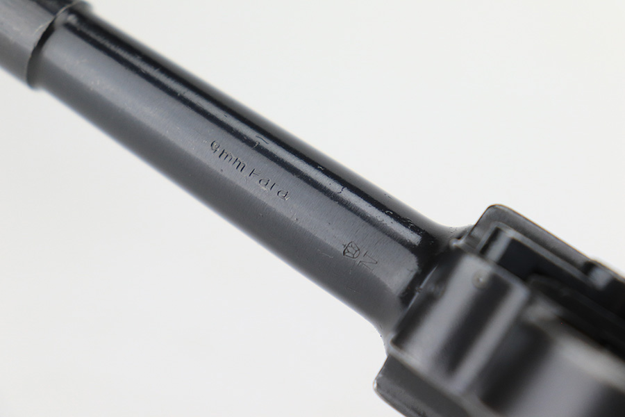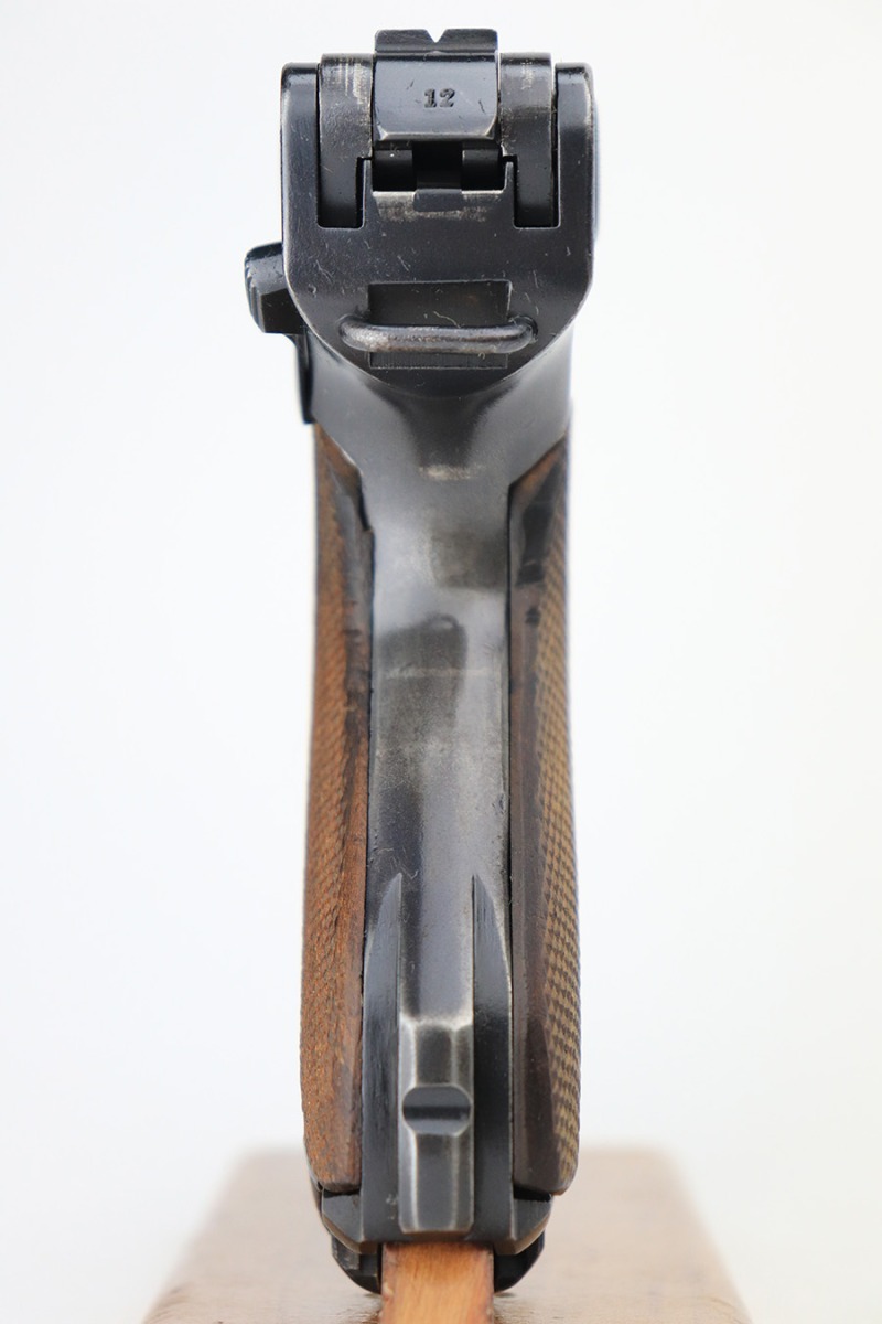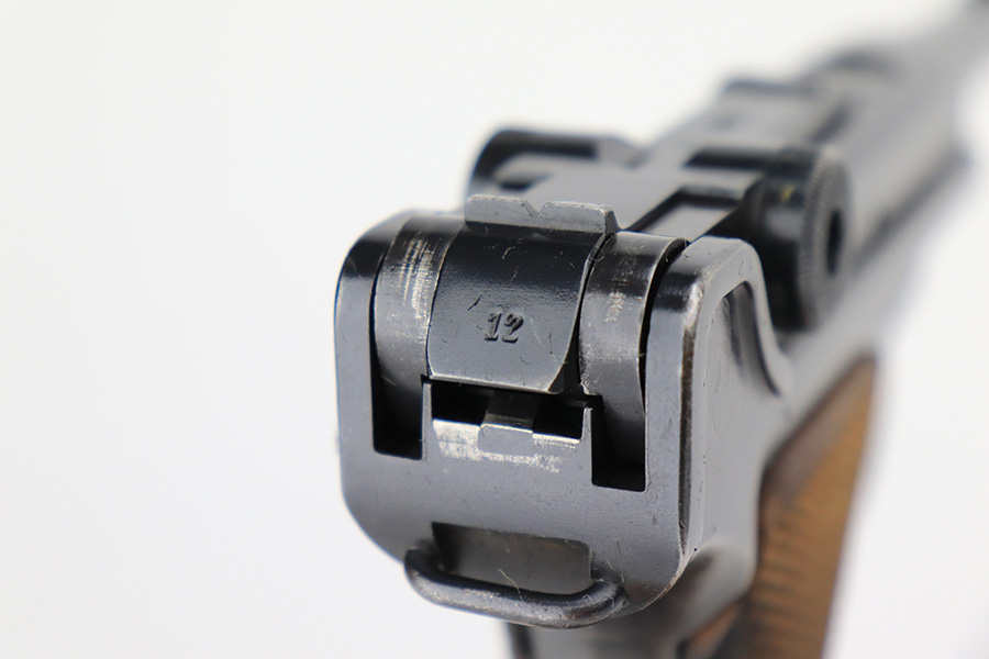 5/31/23 – This is a very nice example of a G Date Mauser Luger issued to the Nazi military in 1935. It is mostly matching, but the sear bar is mismatched, the firing pin is un-numbered, and the barrel is an un-numbered commercial replacement. There are East German police “sunburst” markings on the frame and some West German export markings throughout. The entire gun has been re-blued. There is thinning on the grip straps and minor wear around the muzzle and on some of the high edges. Some light streaks of wear on the barrel. Some tiny scratches on the left side of the frame. Some tiny pits on the front strap. Fitted with an excellent set of replacement wood grips. Comes with a matching police arsenal-numbered magazine. The bore has good rifling with minor freckling throughout.