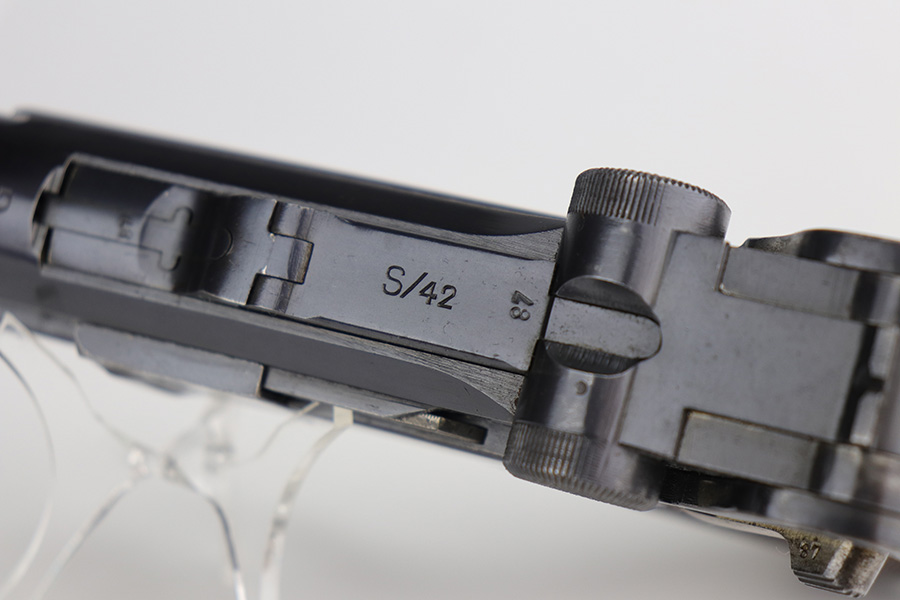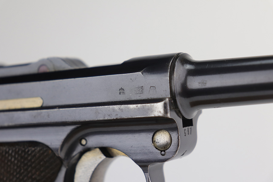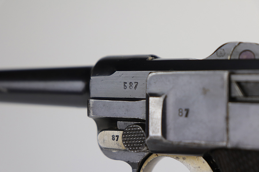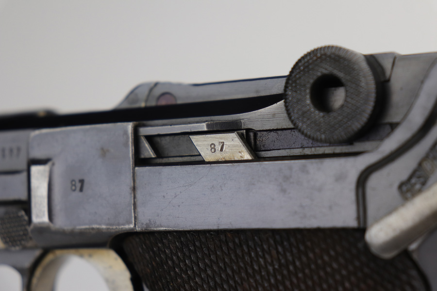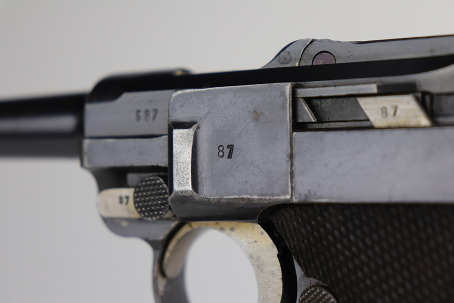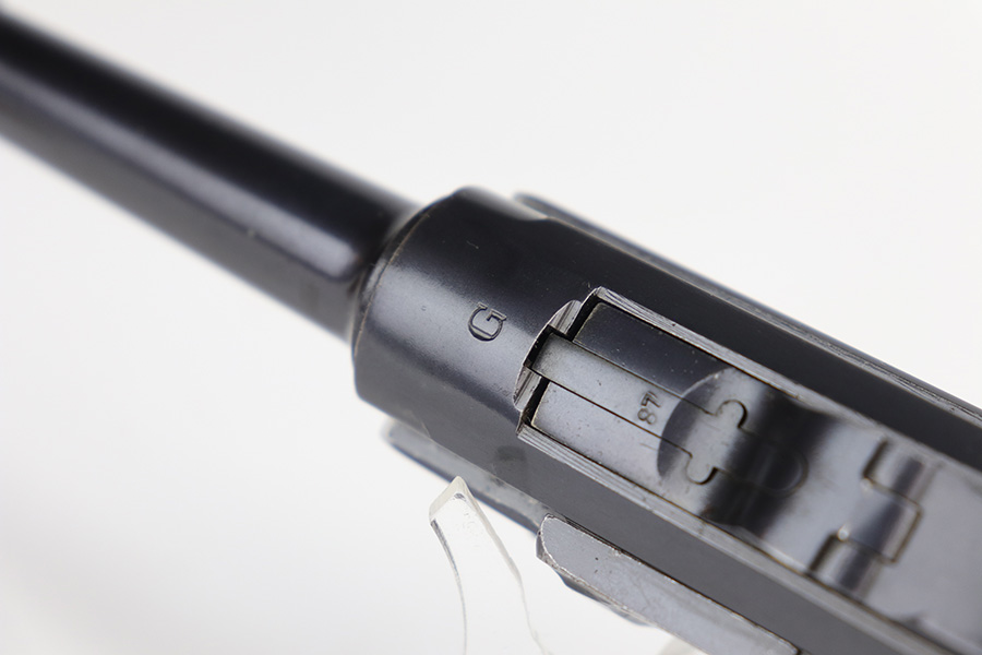 10/28/21 – This is an all matching and original Mauser Luger from 1935 with “G” date code on receiver, along with military acceptance proofs. These were made at a time when Germany was still trying to hide military arms production, so dates were coded with the letter G in 1935. It has about 92-93% of the original blue remaining, with edge wear on sideplate, left side of barrel, right side rail and bottom of front strap. Original straw rates at about 60%. Strong, shiny bore with minor signs of age and use. Nice, unmarked grips. WW2 original but mismatched magazine.