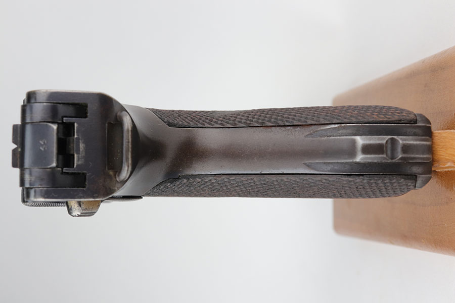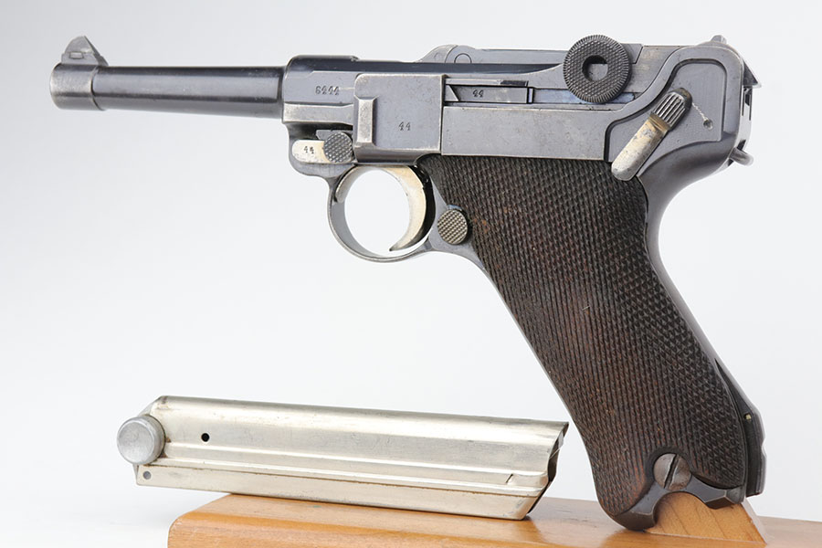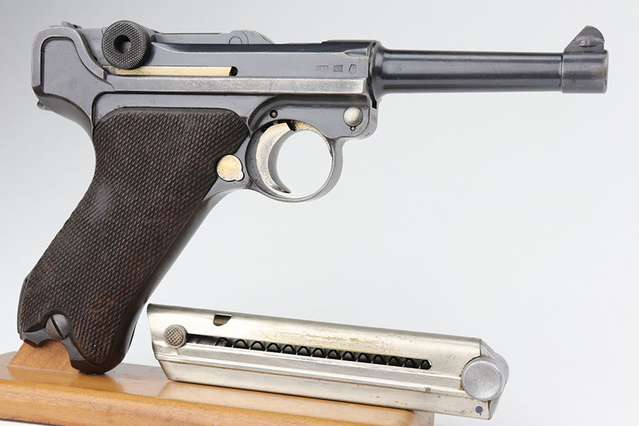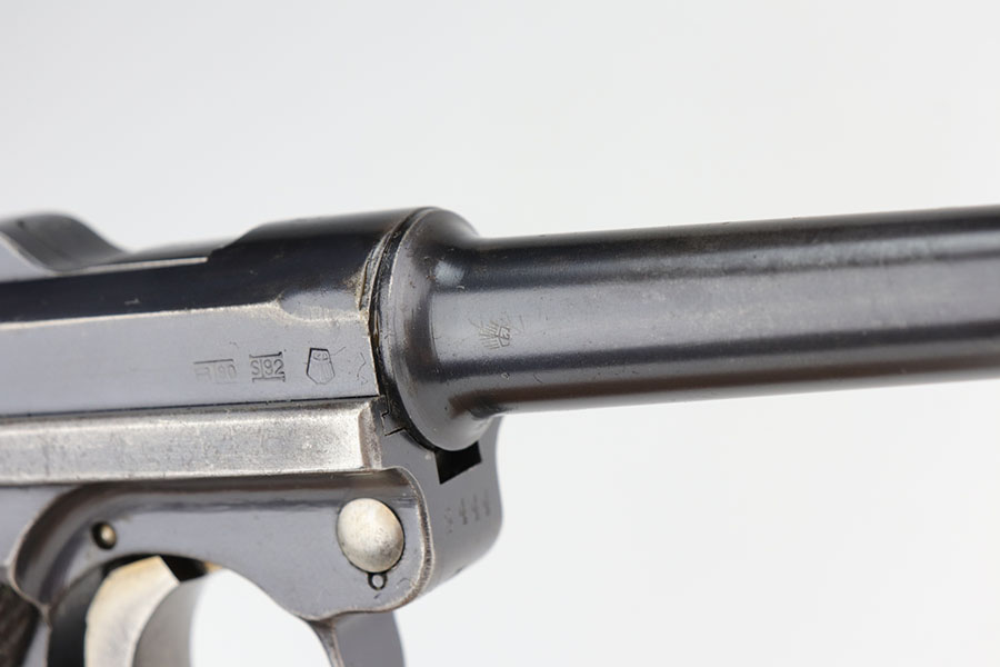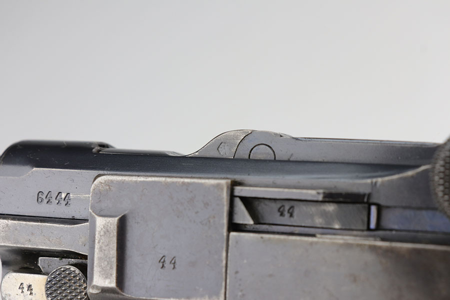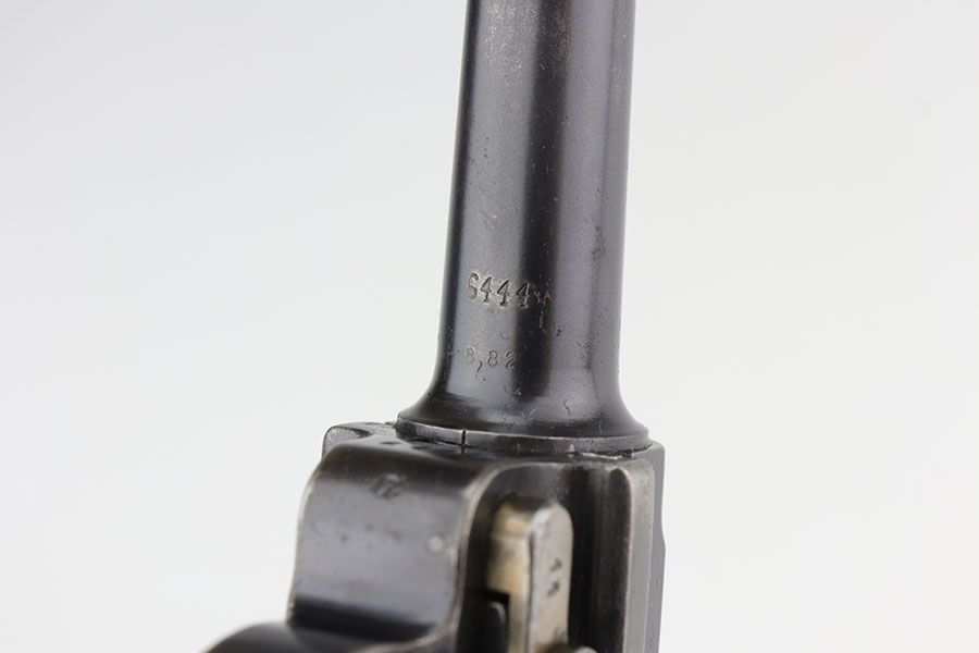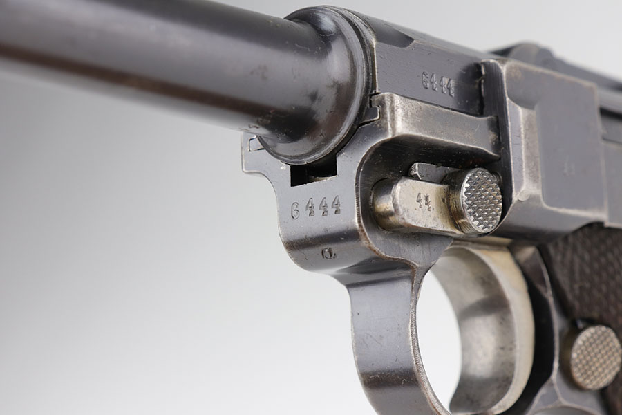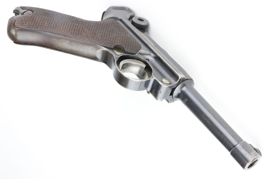 4/23/21 – This is a matching and original G Date Mauser Luger, including the original magazine. The bluing is original but has various areas of thinning, most notably on the straps. Decent original straw on the small parts. Period original, unmarked grips. Some smoothing on each panel. Unfortunately, there is a chip or small broken piece on one end of the ejector. Strong, clean bore.