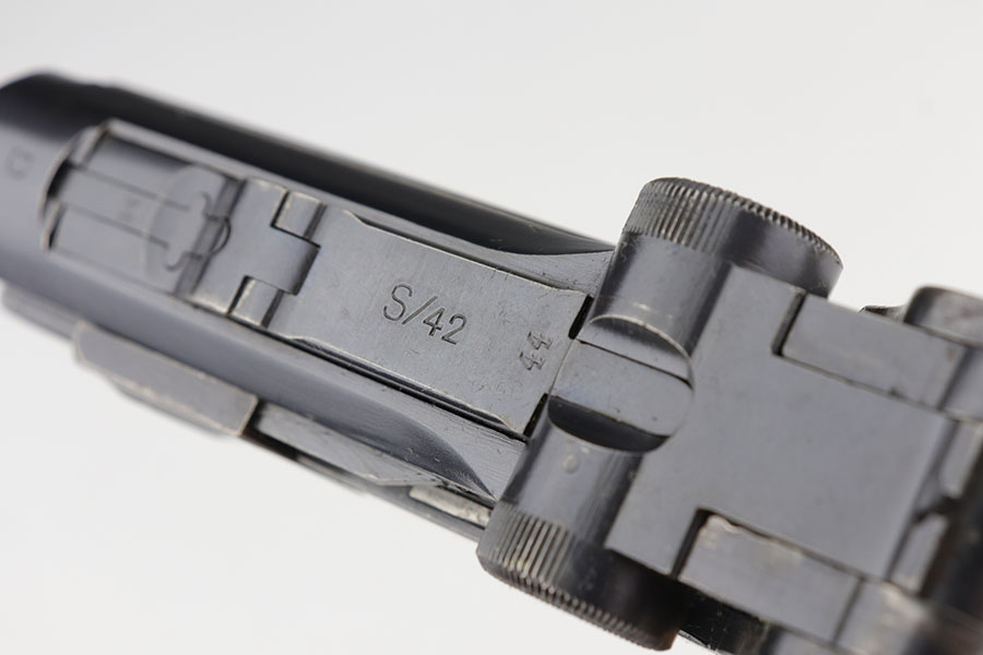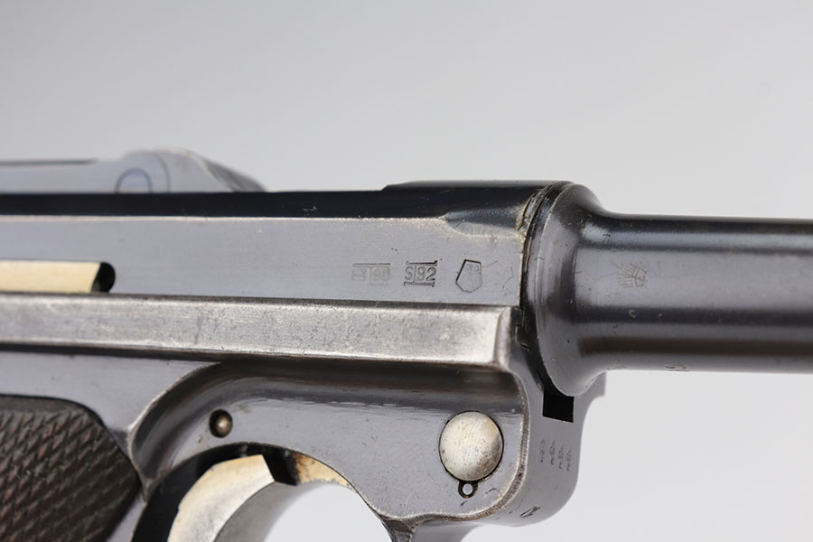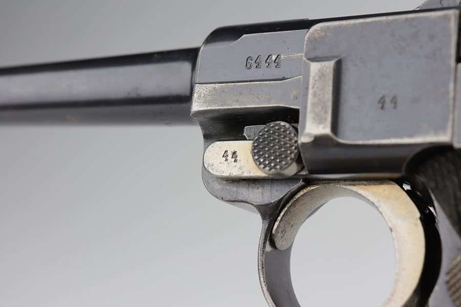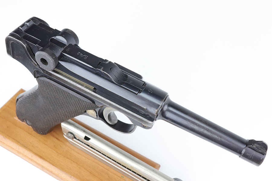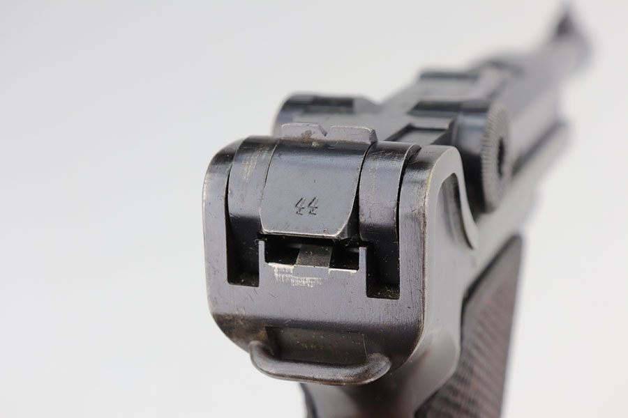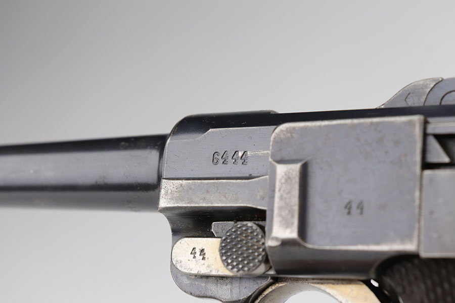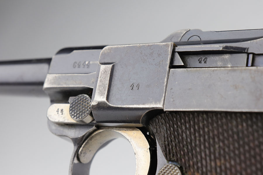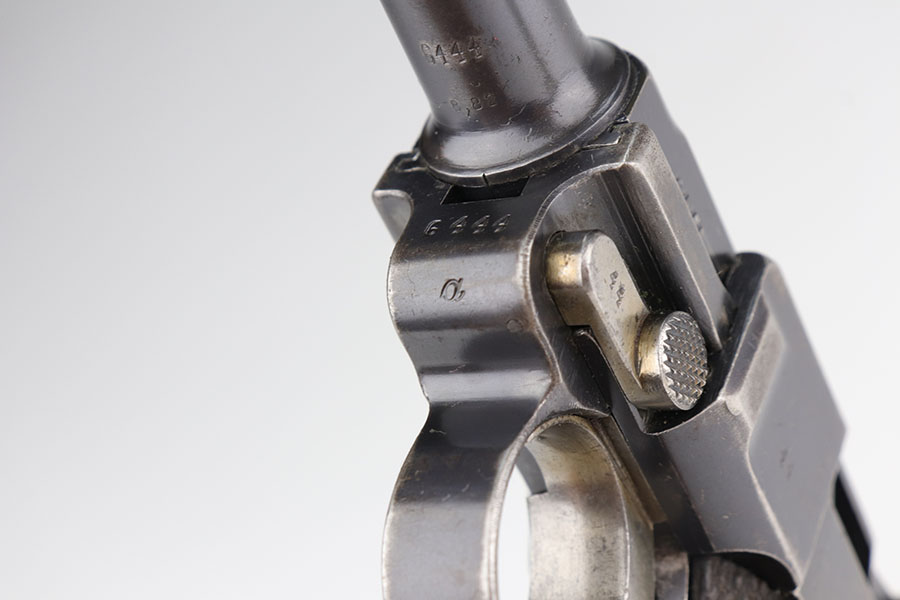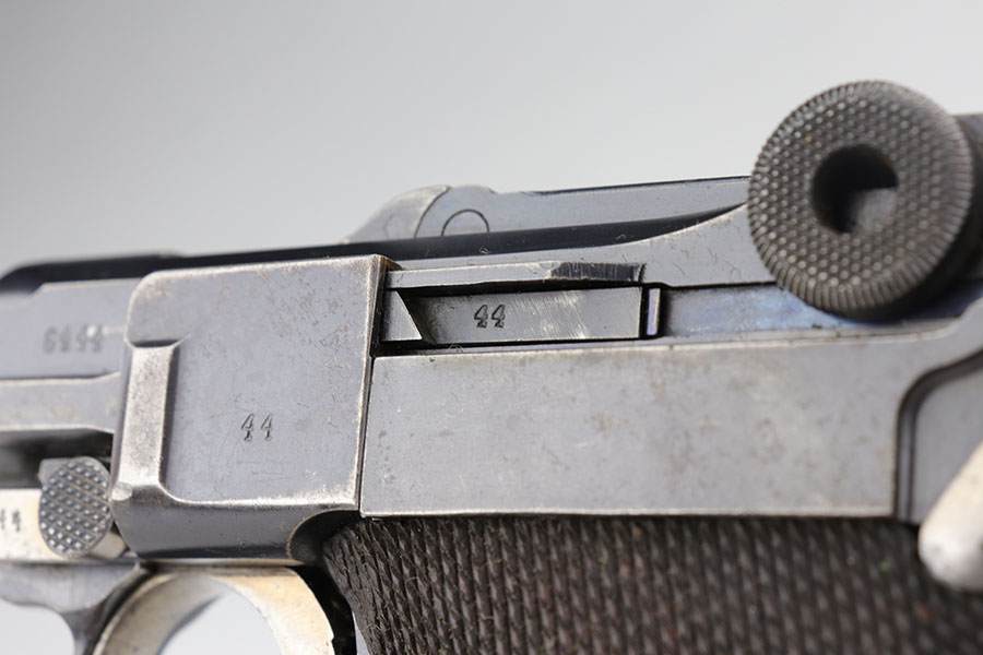 4/23/21 – This is a matching and original G Date Mauser Luger, including the original magazine. The bluing is original but has various areas of thinning, most notably on the straps. Decent original straw on the small parts. Period original, unmarked grips. Some smoothing on each panel. Unfortunately, there is a chip or small broken piece on one end of the ejector. Strong, clean bore.