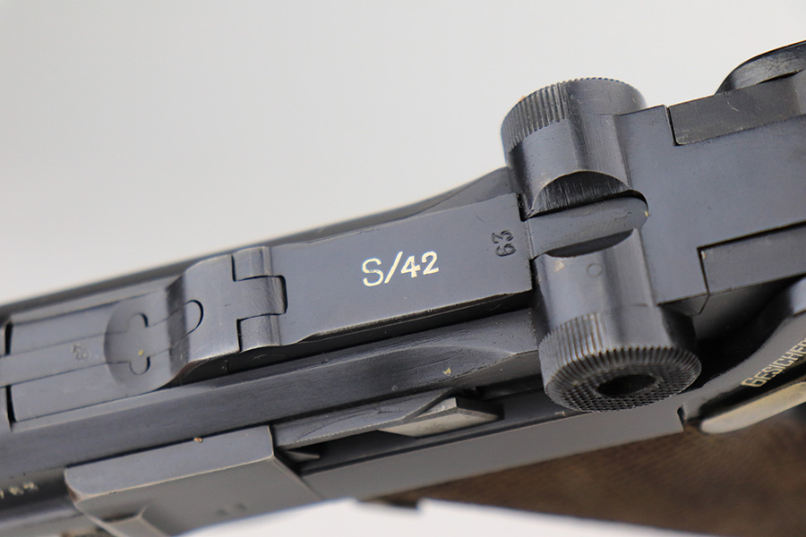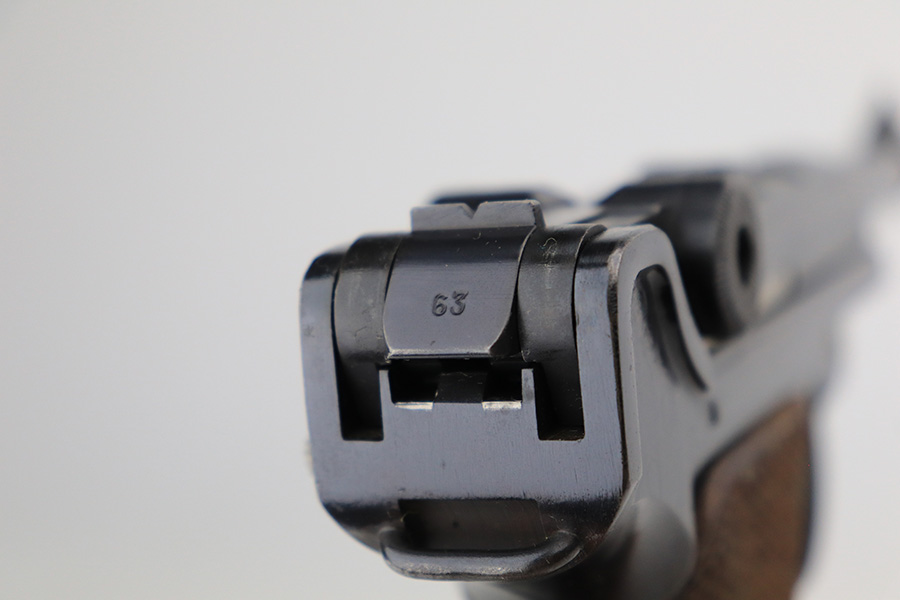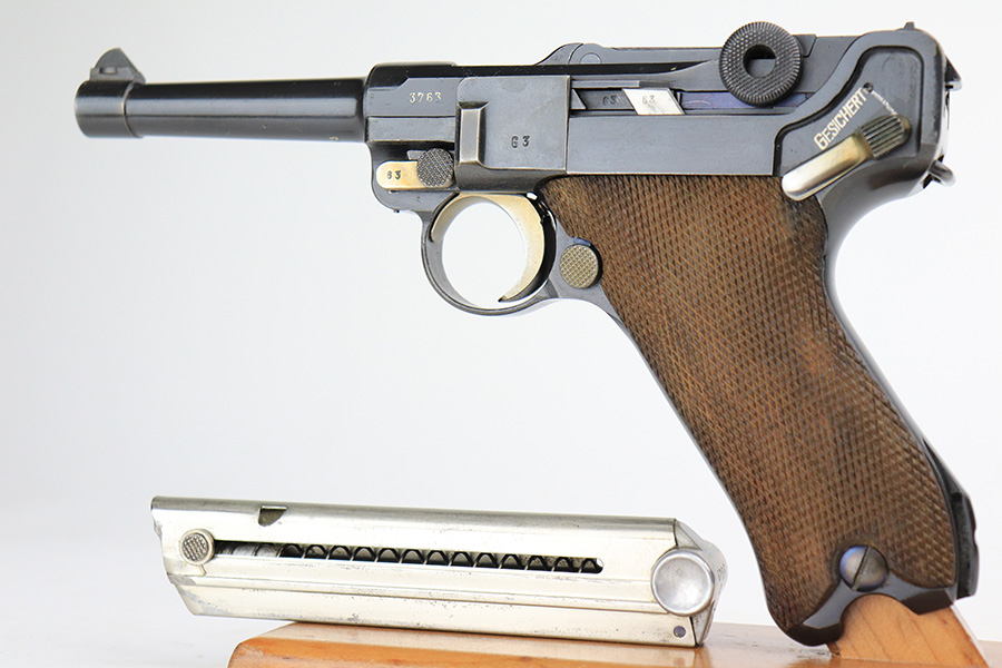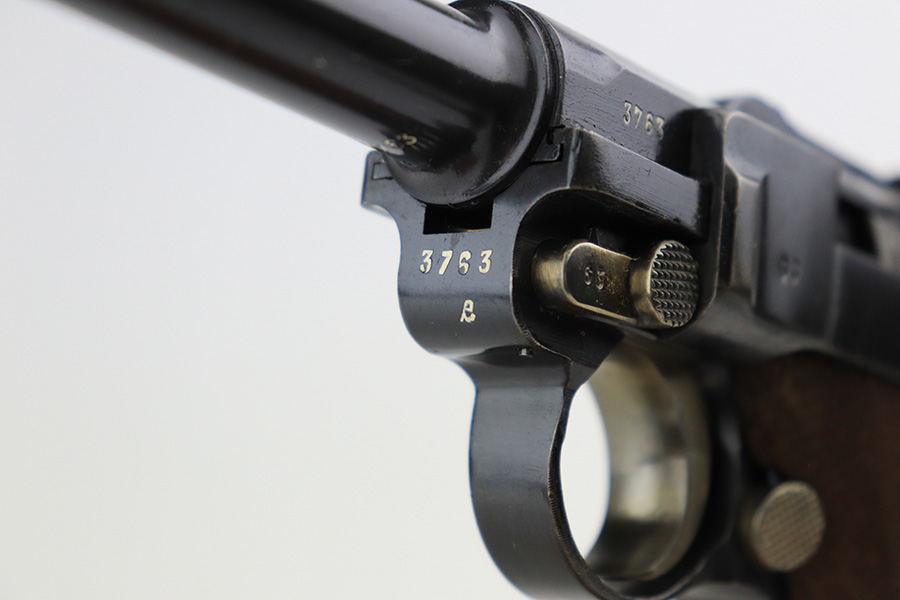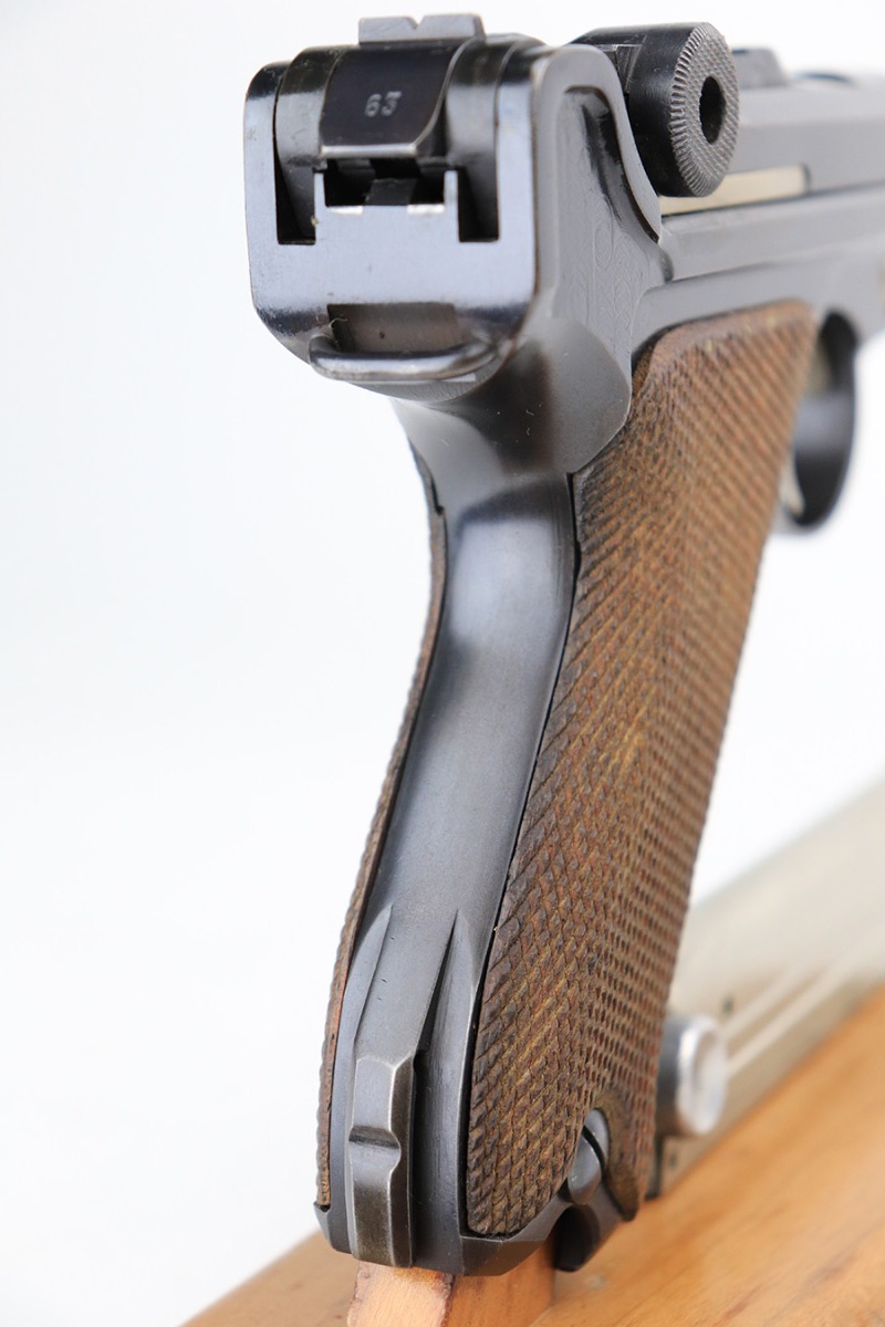 6/7/22 – This is a beautiful example of a matching and original G Date Mauser Luger with one of the original magazines. It has about 97-98% of the original blue with no major finish loss to point out, just a little on the sideplate and muzzle. Excellent bore, just a hint of frost. Sharply checkered, unmarked grips. Factory numbered matching magazine.