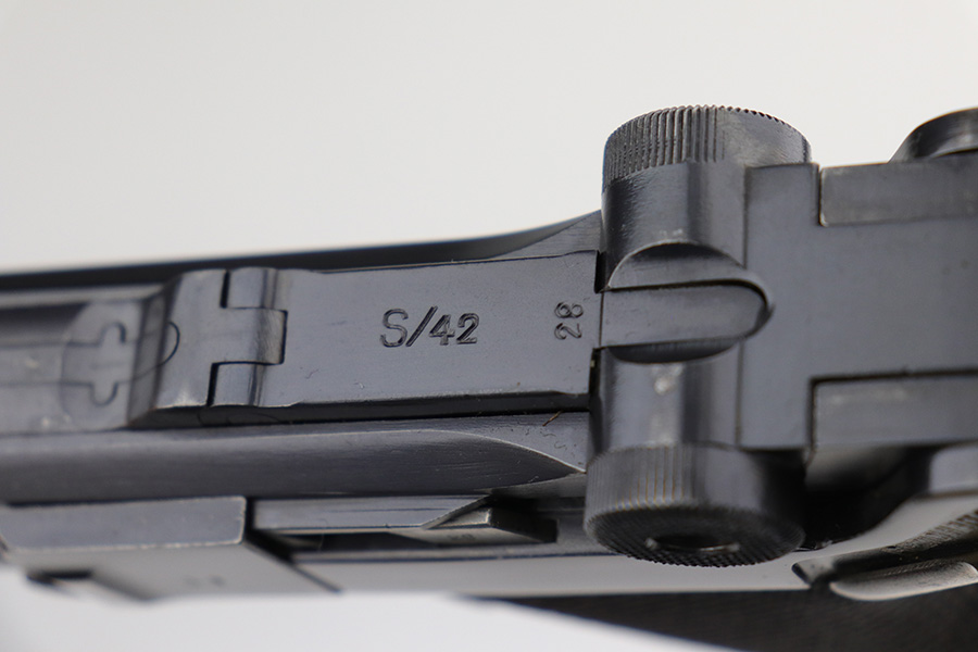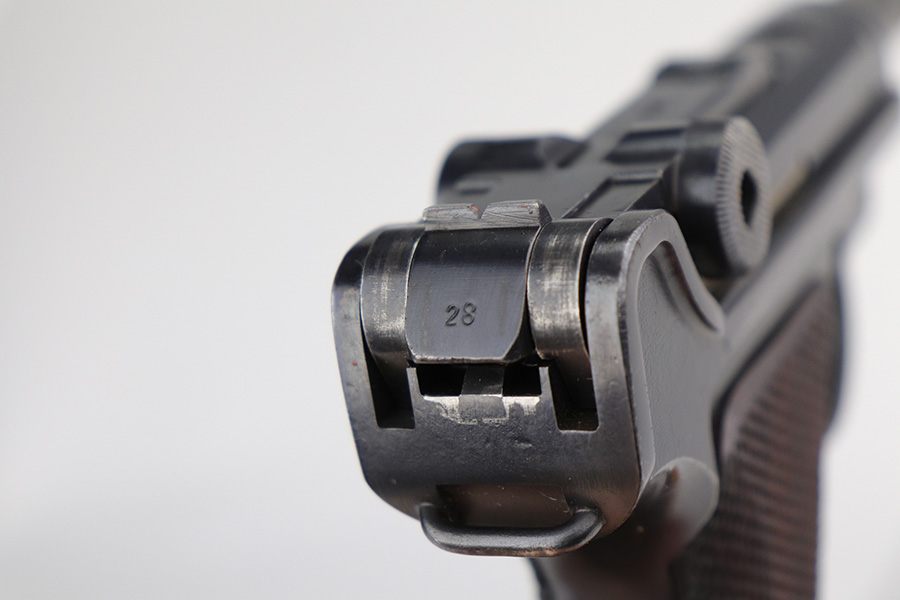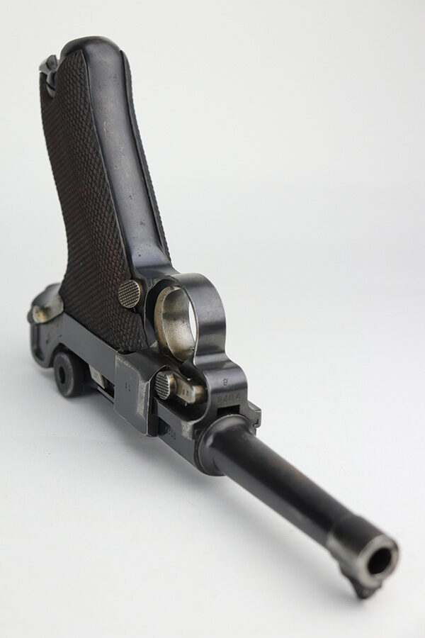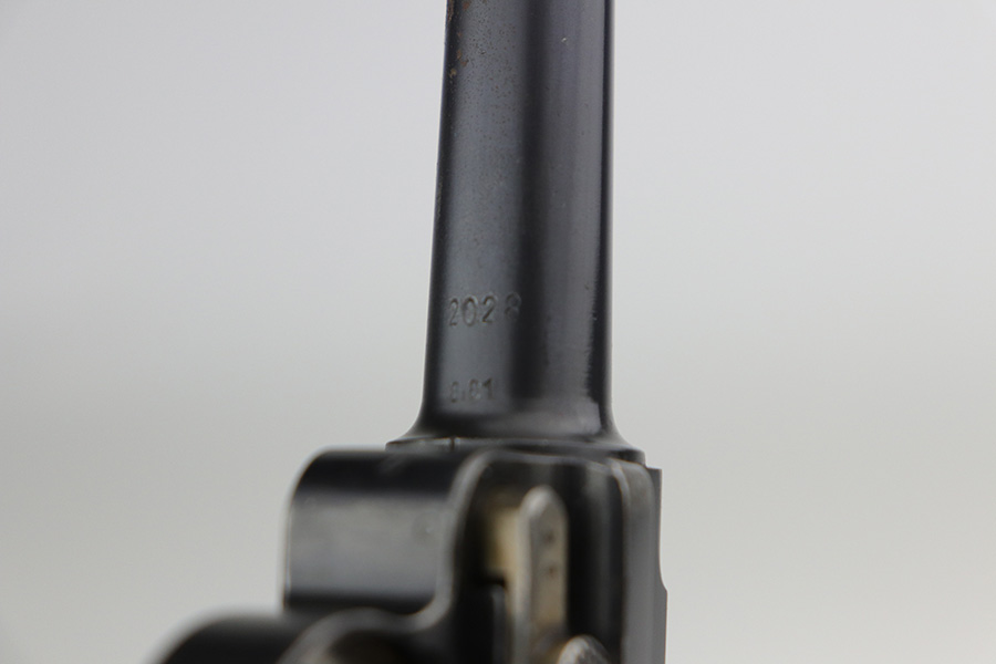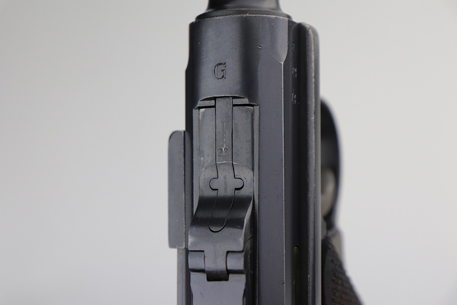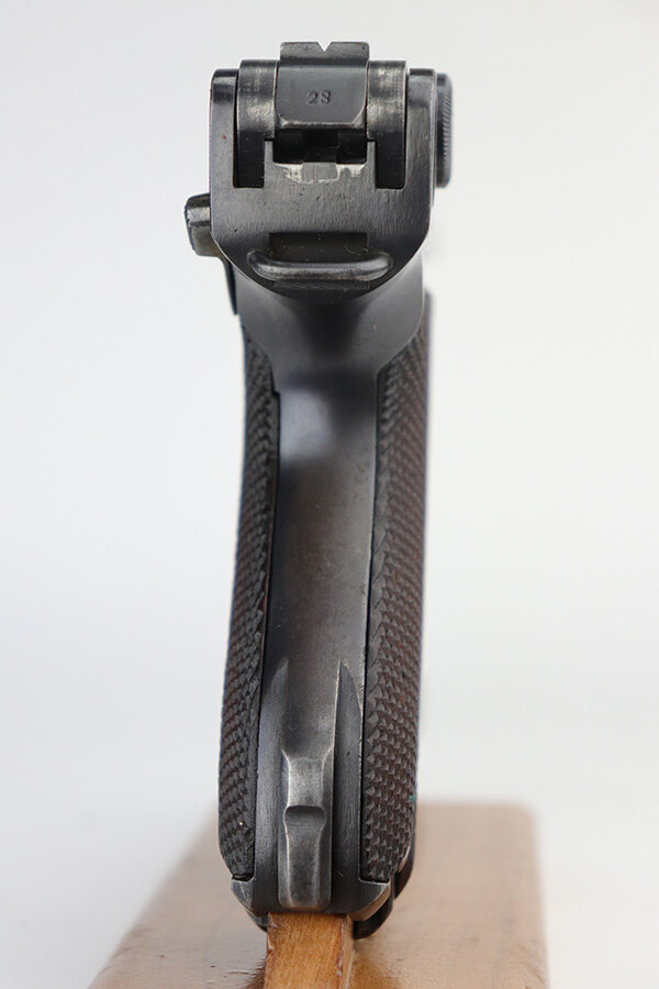 9/24/21 – This is a very nice example of a “G Date” Mauser Luger issued to the Nazi military in 1935. It is all matching and has the proper “Eagle 63” military proofs. It has retained about 94-95% of its original finish. While there isn’t a ton of actual finish loss, there are areas of surface rust and minor pitting around the muzzle and on the barrel. Wear around the muzzle, side plate, side rails, and very minor thinning on the straps. Spotty oxidation on the straps. Comes with excellent un-numbered grips. The bore has decent rifling with very minor pin-pricking throughout.