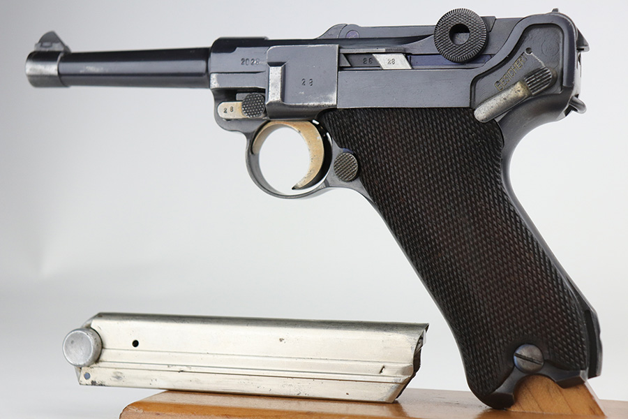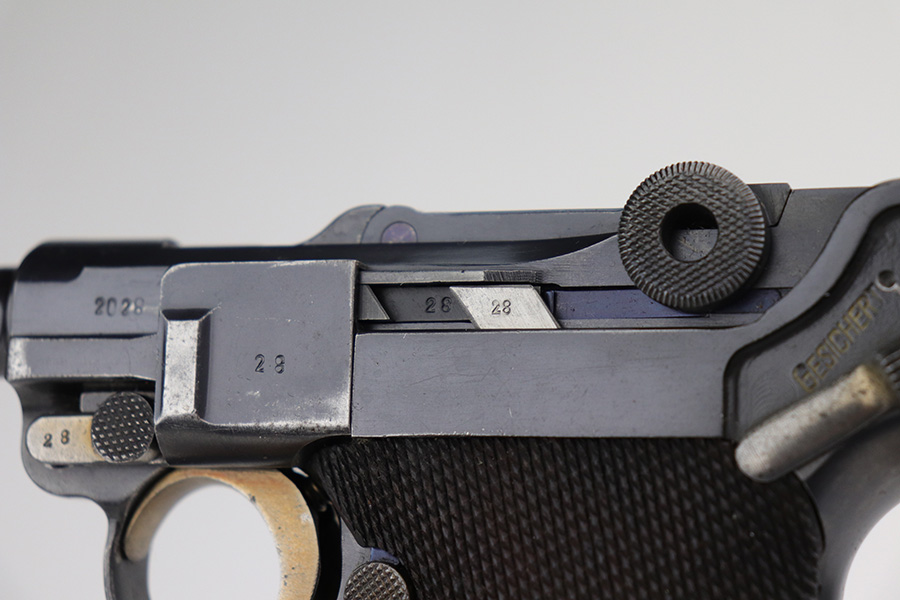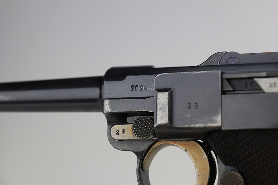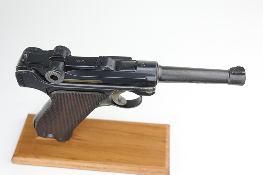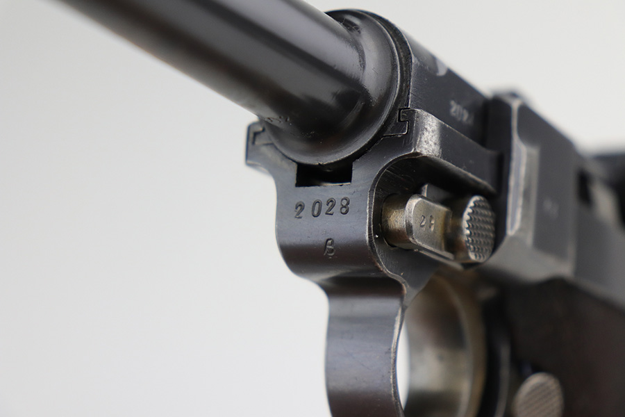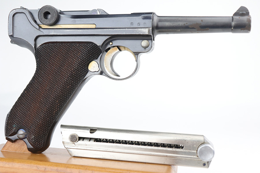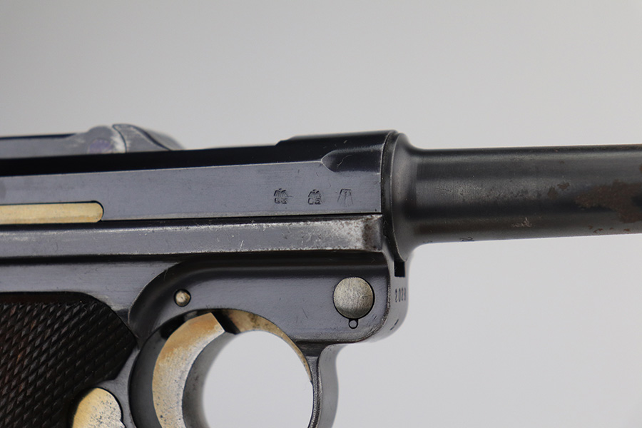 9/24/21 – This is a very nice example of a “G Date” Mauser Luger issued to the Nazi military in 1935. It is all matching and has the proper “Eagle 63” military proofs. It has retained about 94-95% of its original finish. While there isn’t a ton of actual finish loss, there are areas of surface rust and minor pitting around the muzzle and on the barrel. Wear around the muzzle, side plate, side rails, and very minor thinning on the straps. Spotty oxidation on the straps. Comes with excellent un-numbered grips. The bore has decent rifling with very minor pin-pricking throughout.