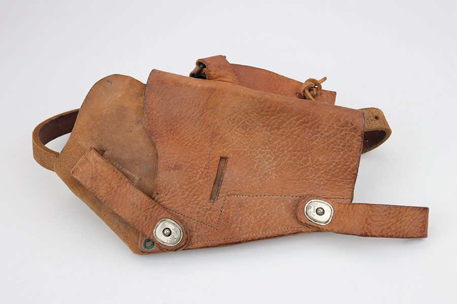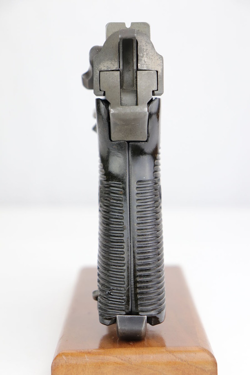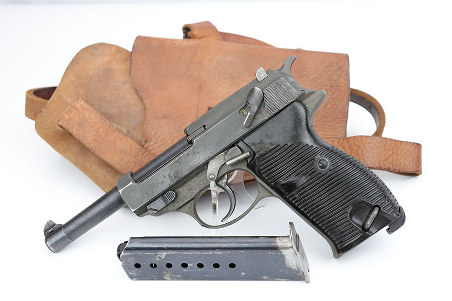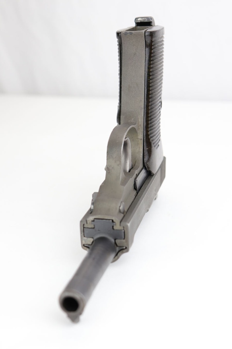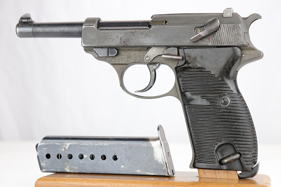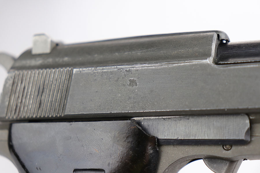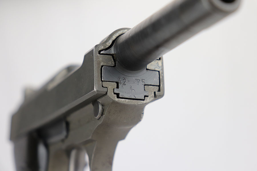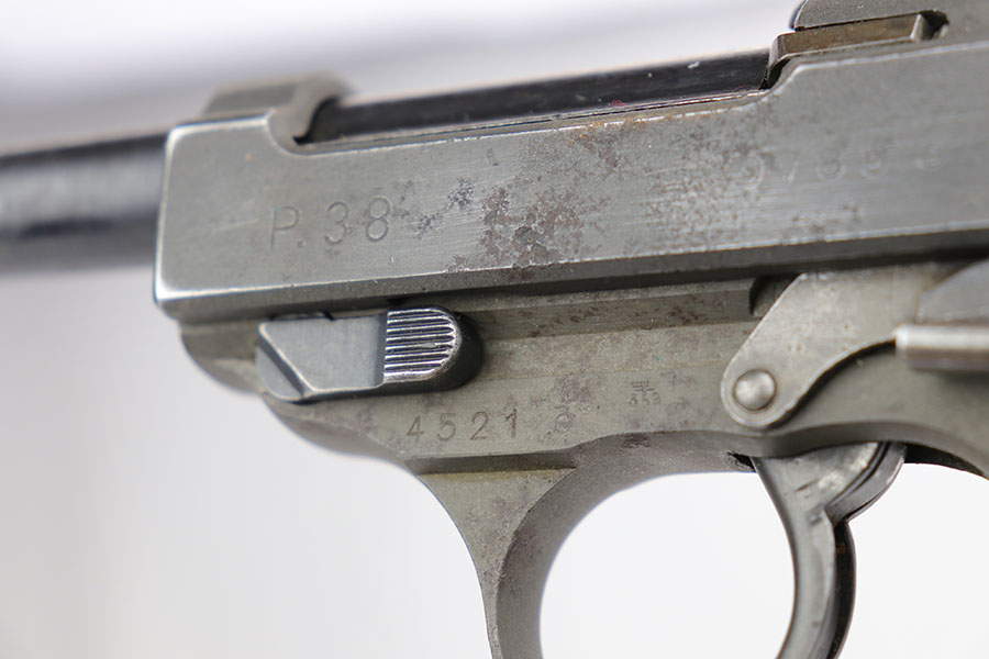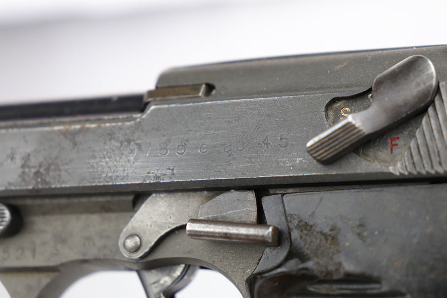 4/3/20 – This is a very late, end-of-war production Walther P.38 pistol that we believe was put together by G.I.’s at the end of WW2 when the allies took over the Walther factory. This explains why the pistol has a mis-matched slide and barrel. The condition is congruent throughout the gun though which tells us this has been together for some time. The slide and frame are both phosphate, and the barrel is blued. Walther never phosphated their guns, so we again suspect this was the work of a G.I. after putting this together in the factory. The barrel is interestingly waffen WaA76 stamped from the CZ factory (subcontractor), which explains why it is not of the same finish as the other parts. The right side of the slide only has one proof stamp as well, meaning it didn’t fully pass factory inspection. Generally, the finish is rough with considerable wear, especially on the left side of the pistol. The bore however is in minty condition. Functions properly and has late-war durafol grips. Included with this pistol is a G.I. put together WW2 era holster (very fitting for a pistol like this). This gun would make a fantastic shooter and even better conversation piece. The internals are very clean.