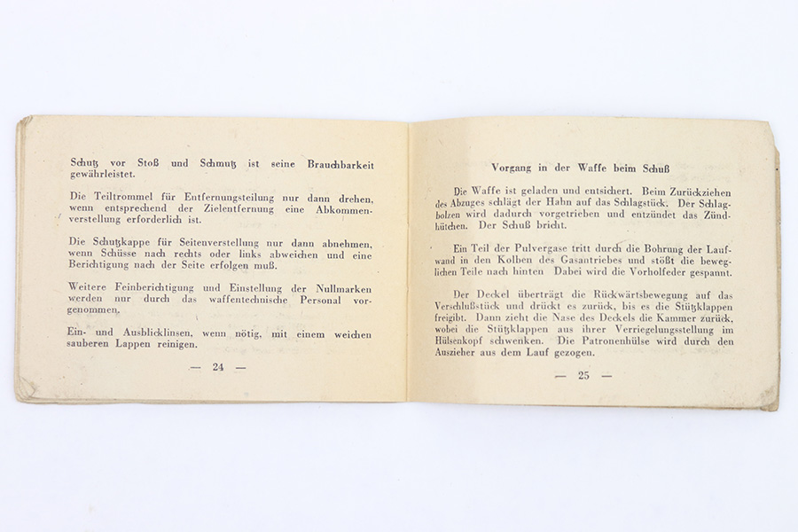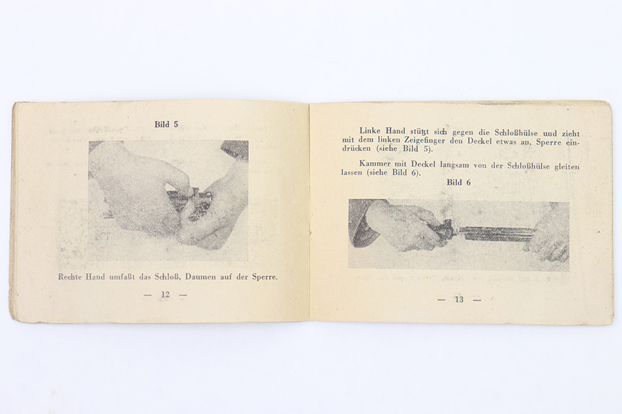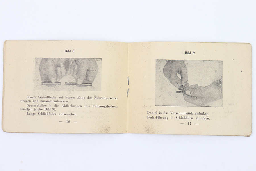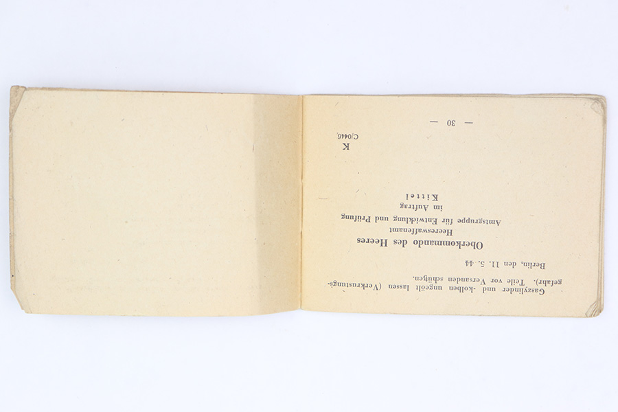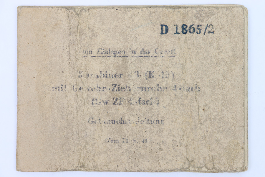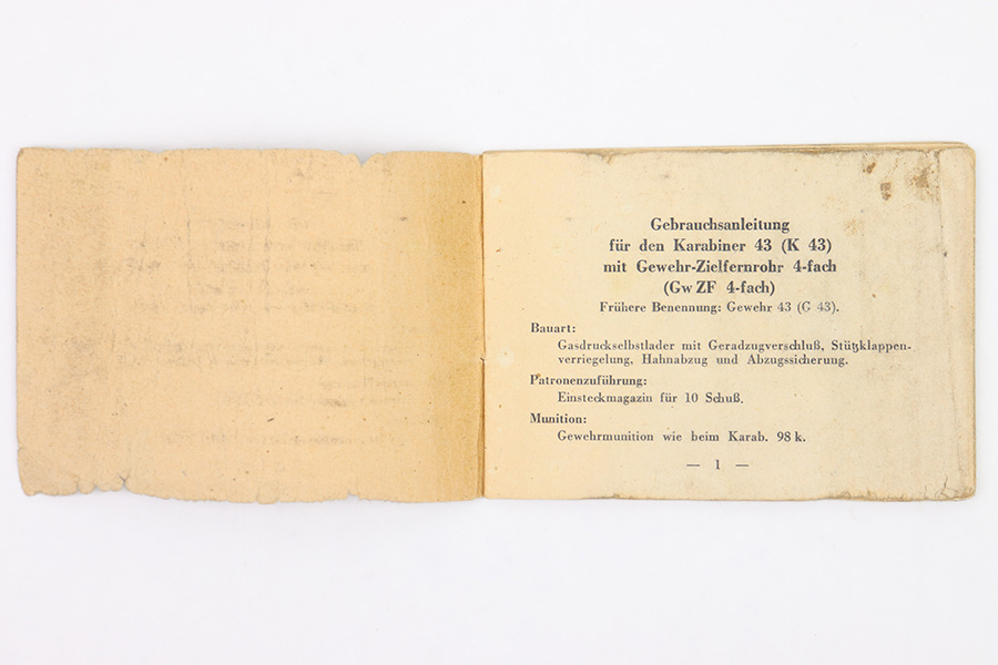 9/20/22 – This is an original 1944 dated buttstock manual for the G43 or K43 rifle. The manual is worn and aged, as shown, but still completely intact. All pages are held intact by a staple that has minimal rust and patina. The pages are slightly tattered along the edges but are all still legible with black and white images.