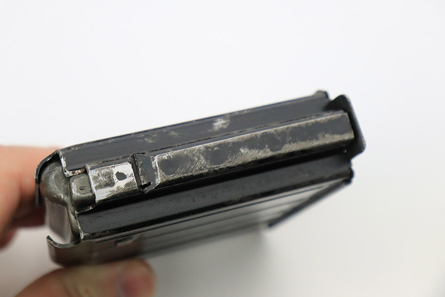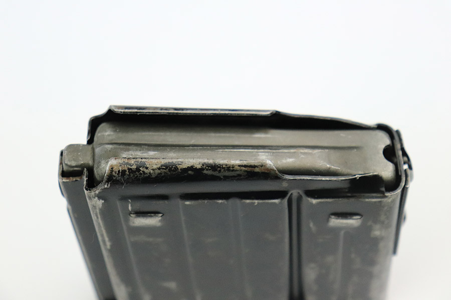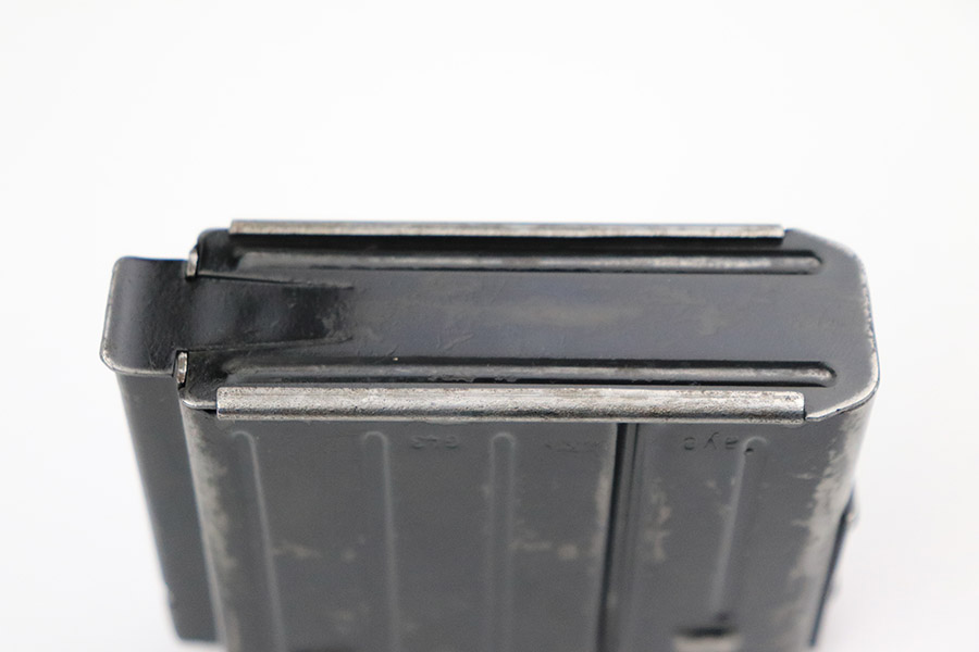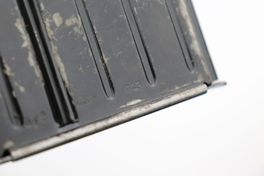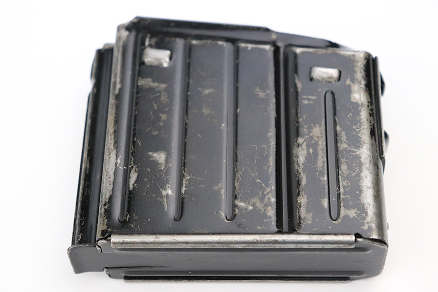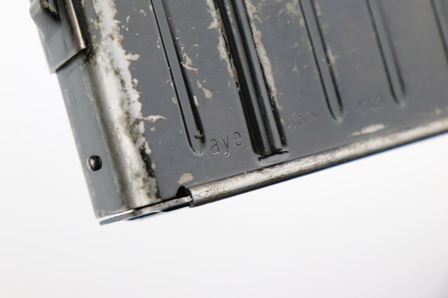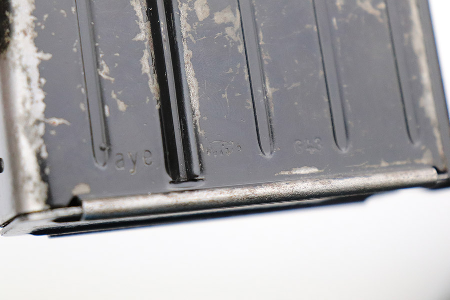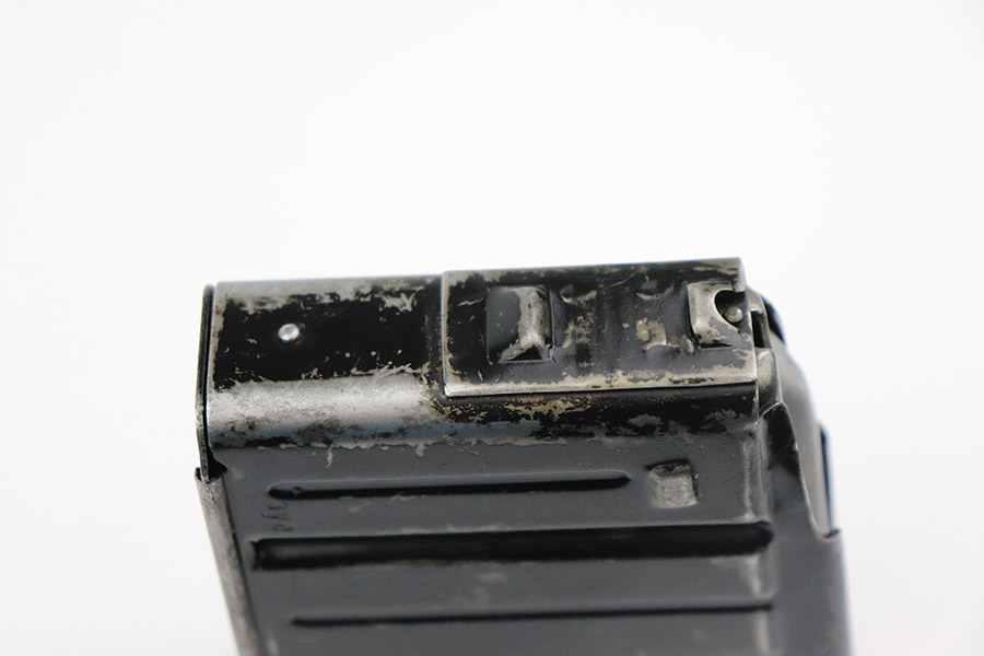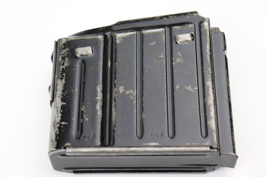 10/24/22 – This is a great example of an original G43 magazine from WW2. The metal has retained a majority of its original black finish and is great condition overall. There is finish loss throughout but concentrated on the front edges of the magazine. The left-hand side is maker marked “aye”, waffen proofed, and “G43” stamped toward the base. This magazine should also function in a K43 rifle. The spring is strong and fully functional. Overall, a great example of a G43/K43 magazine.