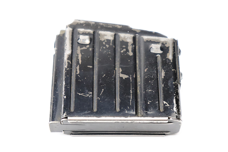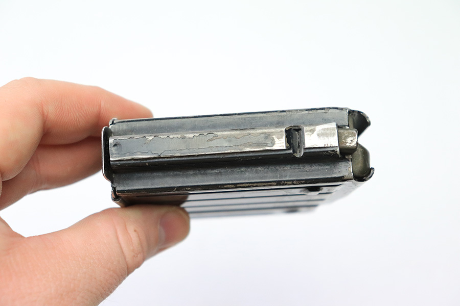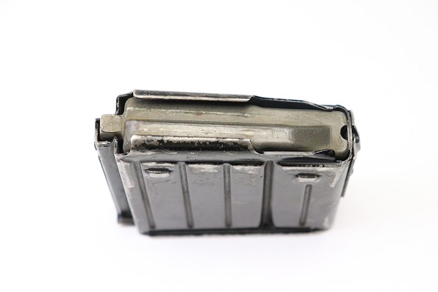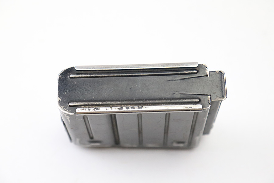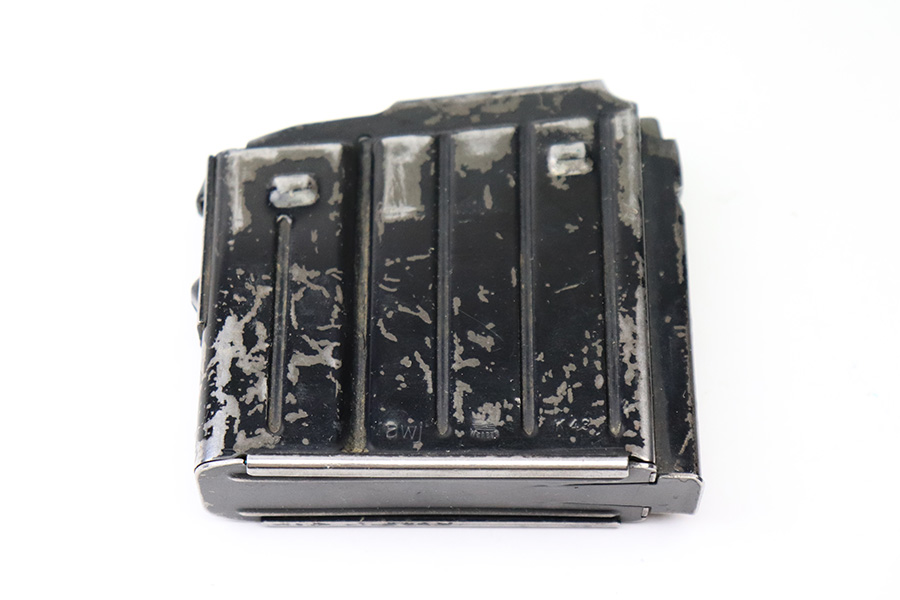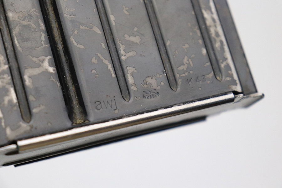 6/7/22 – This is an original G43 / K43 magazine from WW2. The magazine still has most of the black painted finish in tact. There’s some mild patina and finish loss throughout. One side of the magazine is maker stamped, waffen proofed, and stamped “K43”. The spring is strong and functional.