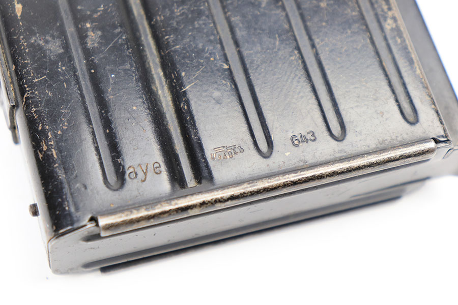 2/12/21 – This is an original WW2 era G43 or K43 magazine. The black painted finish is in great shape overall with most of the finish in tact. Some minor wear but this is normal. Fully functional and properly stamped.