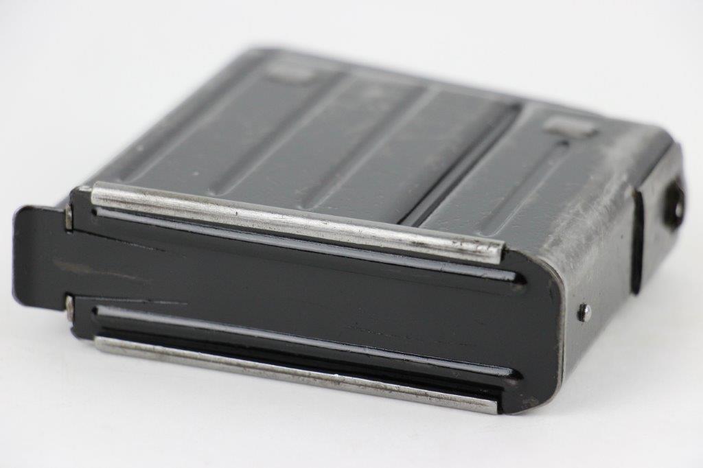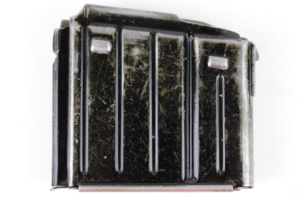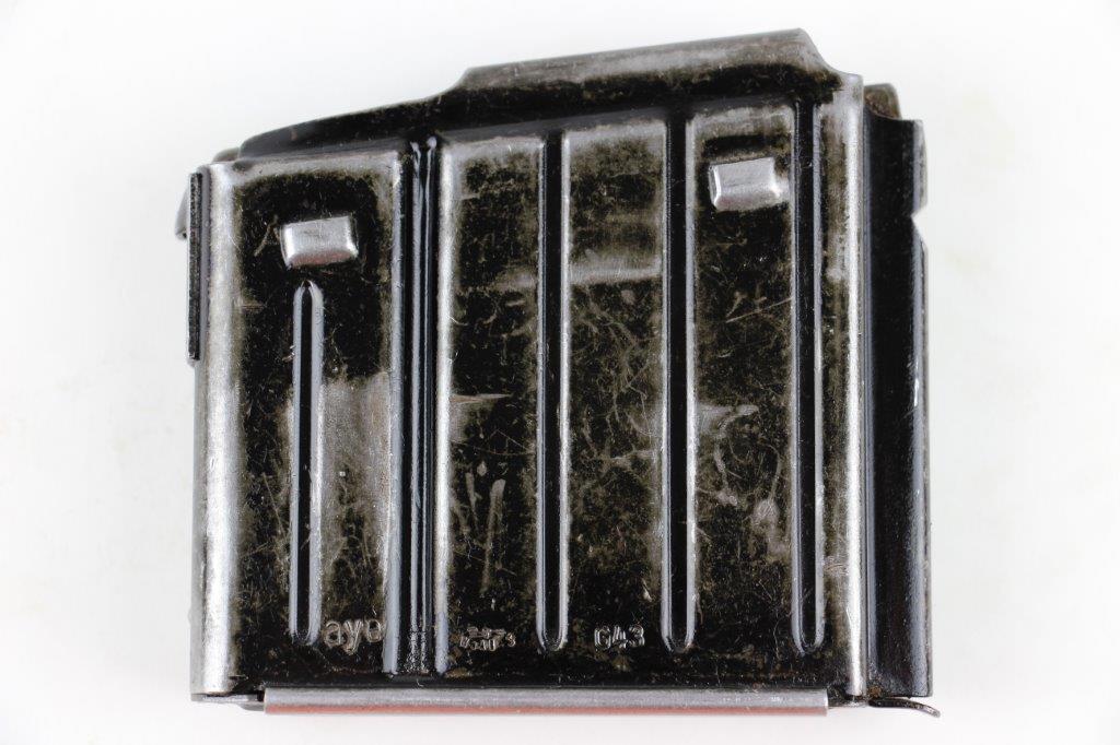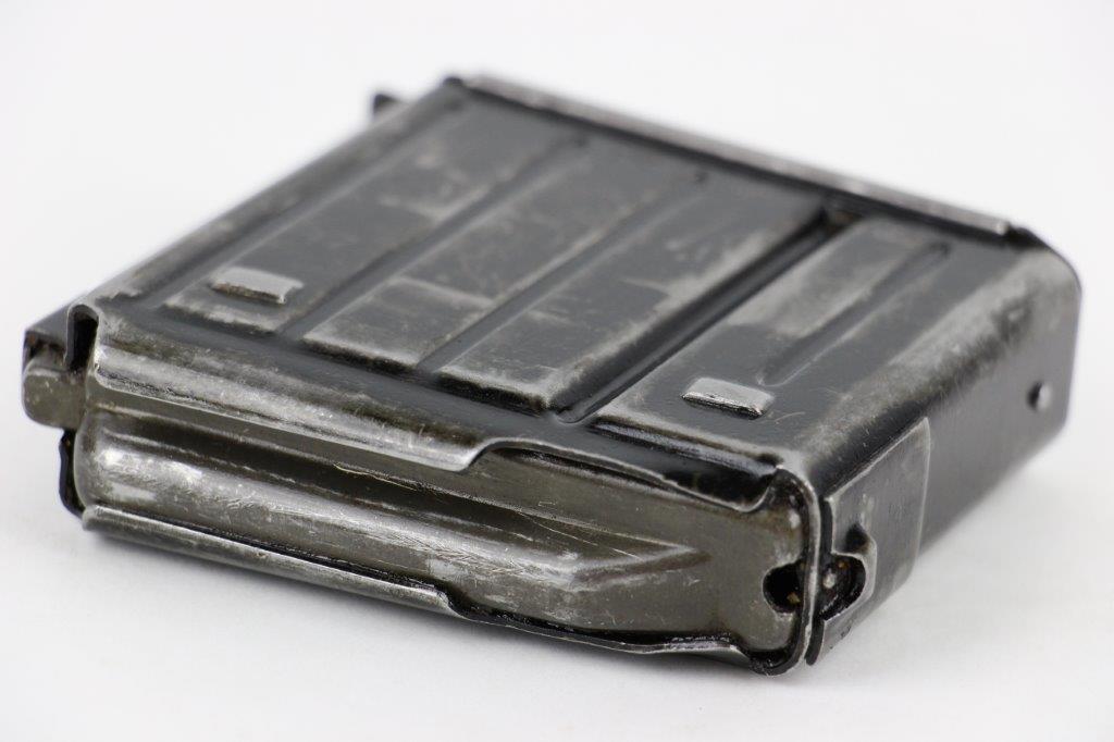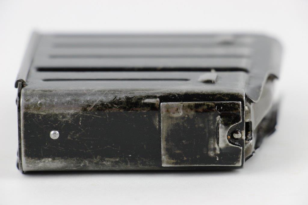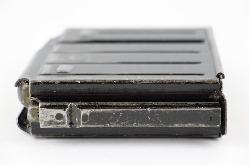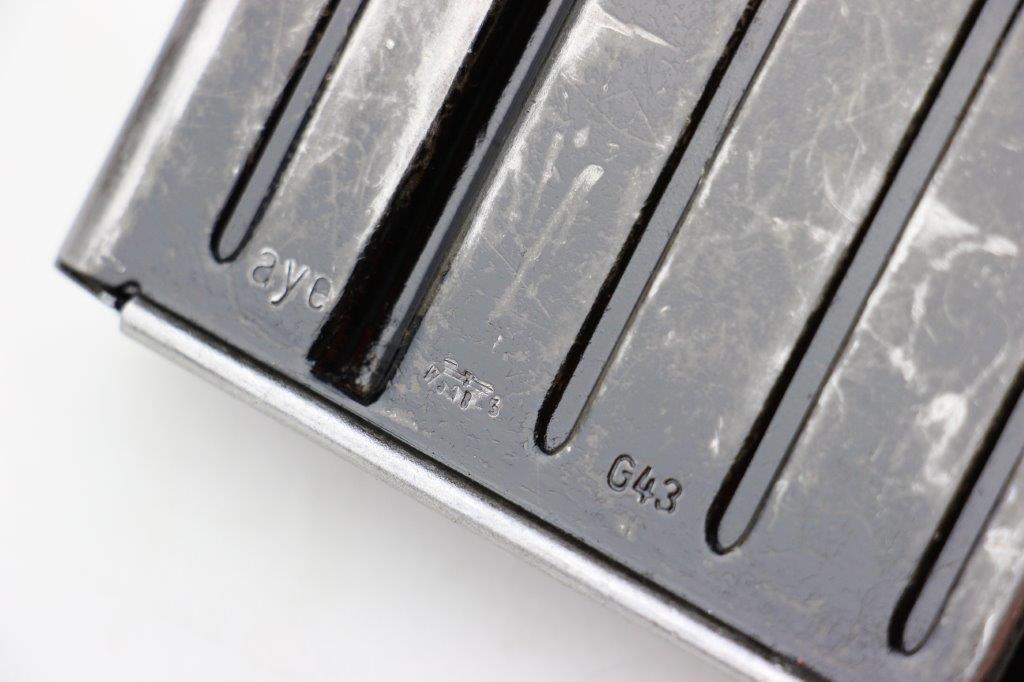 7/9/24 – This is a WW2 original G43 Rifle magazine. The magazine has all original blued finish with natural surface scratches, light patina and mild finish loss throughout. No rust or pitting and a strong, fully functional spring. The magazine is properly waffen proofed, “G43” stamped, and maker stamped “aye” by Olympia Büromaschinenwerke A.G..