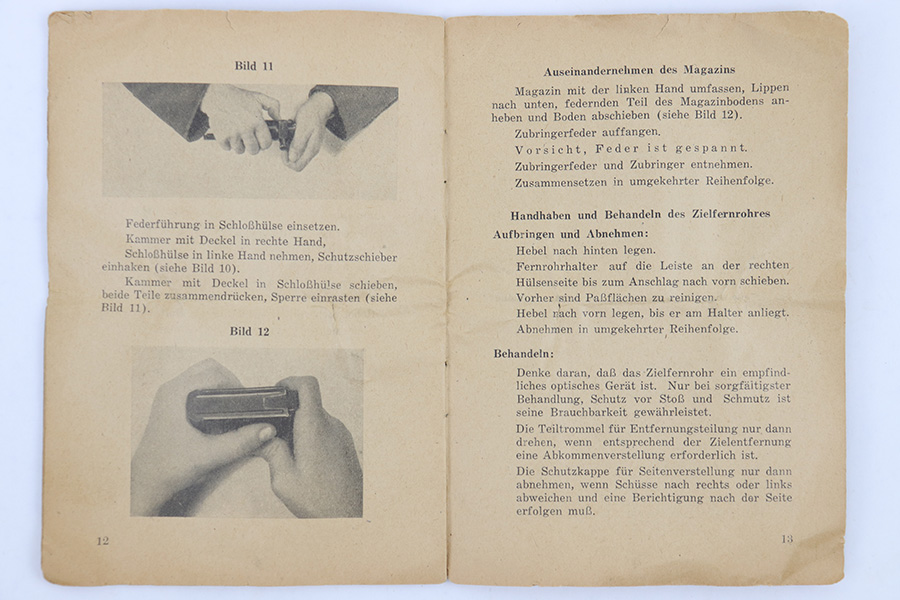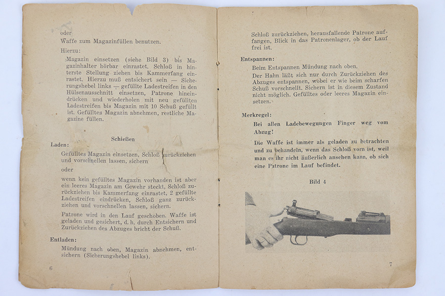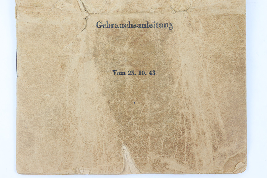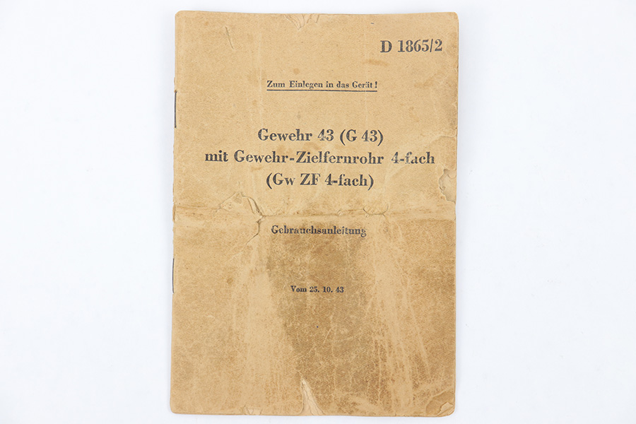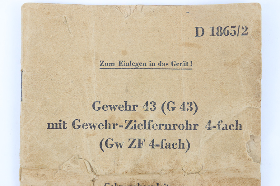 4/6/23 – This is an original 1943 dated G43 rifle manual. This field manual would have been carried in the buttstock or soldier’s uniform. The manual covers field stripping the rifle and shows the accessories paired with the rifle, including magazine pouch, sling, and ZF 4 scope. The pages are worn and yellowed, in fragile overall condition but still completely intact.