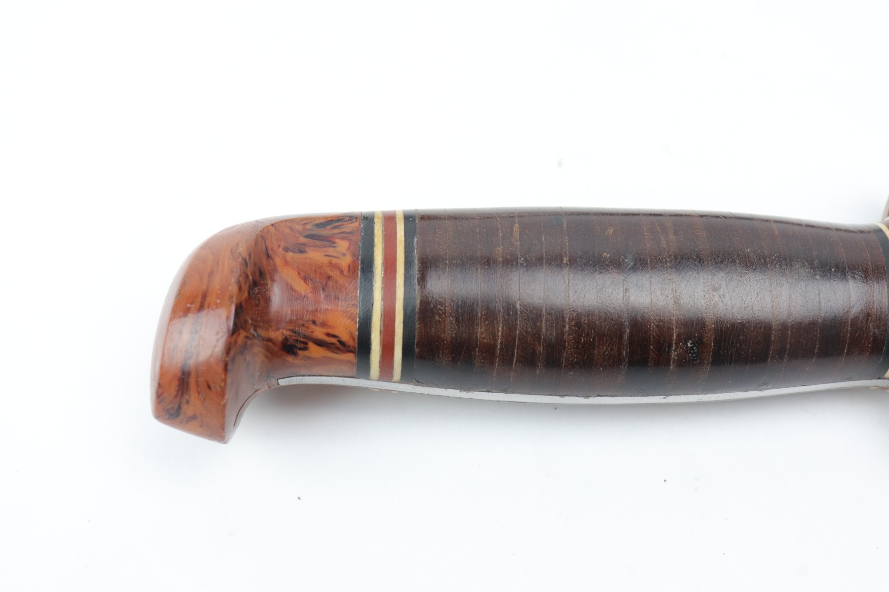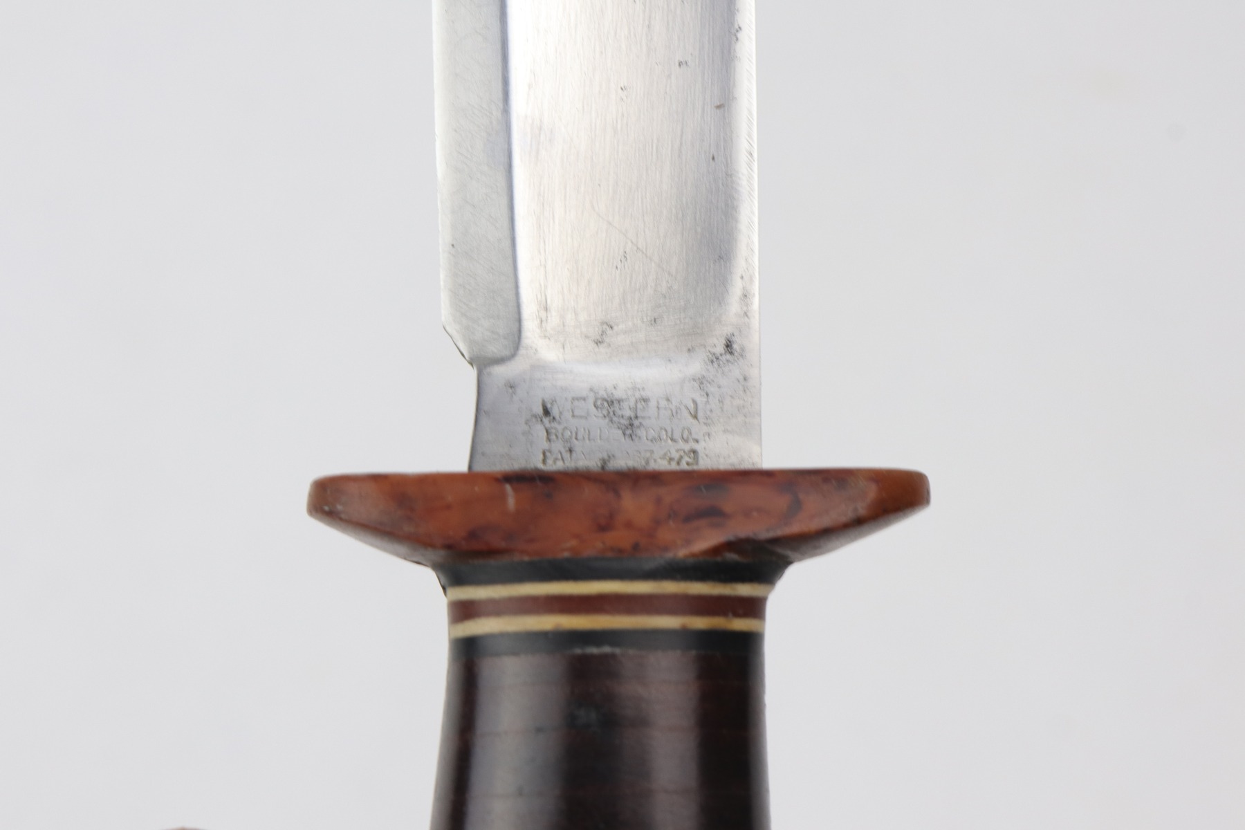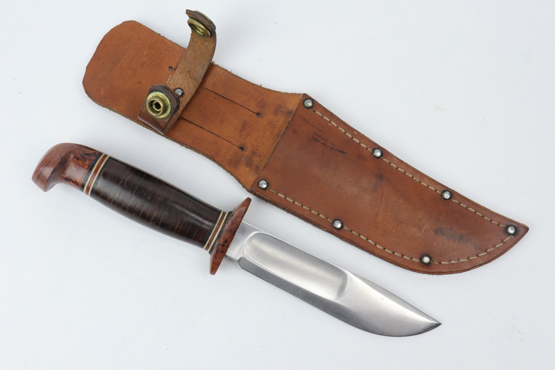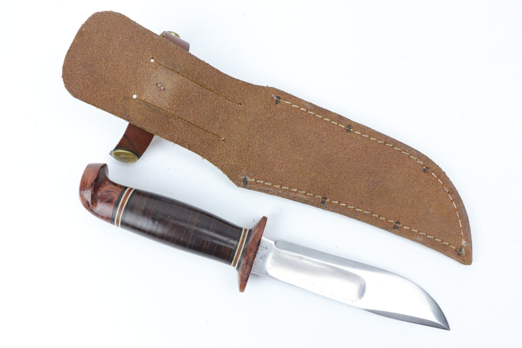 9/14/20 – This is a World War Two Western G46-5 knife, aka the ‘Baby Shark’. The leather sheath is original. The guard and pommel are made of durable plastic. There are signs of sheath wear due to age and use.