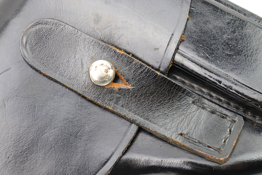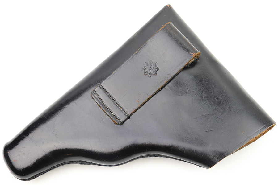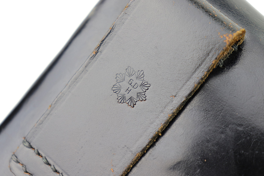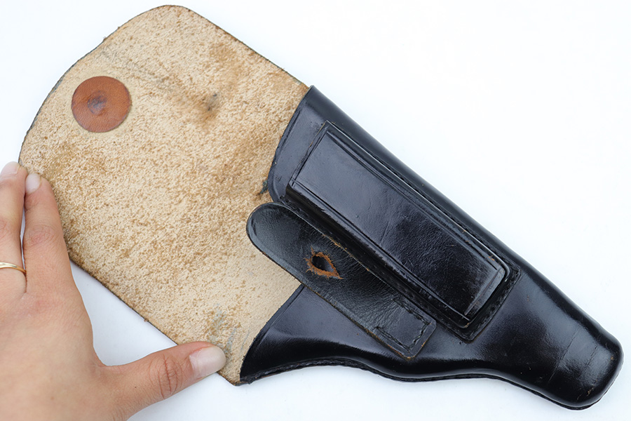 3/8/23 – This is an original WW2 production holster by Gebruder Dewald and Hachenburg (GDH). Maker stamped on the back belt loop, with no other markings. Our research found that these of often paired with Sauer 38h pistols, but this holster would be suitable for most similar sized 7.65mm pistols. Nice black leather and stitching throughout with some mild surface wear and clean interior leather.