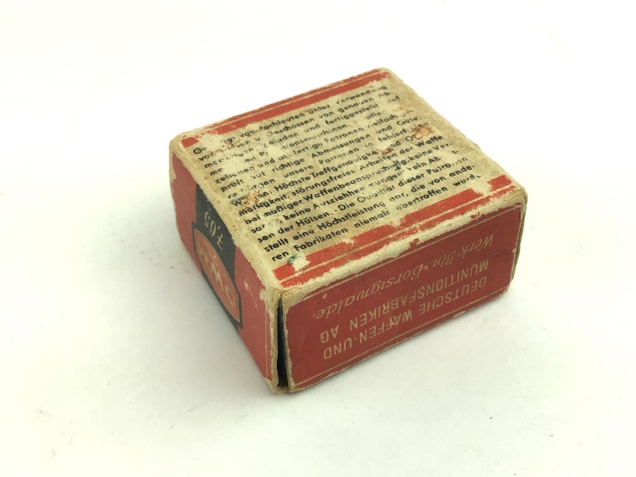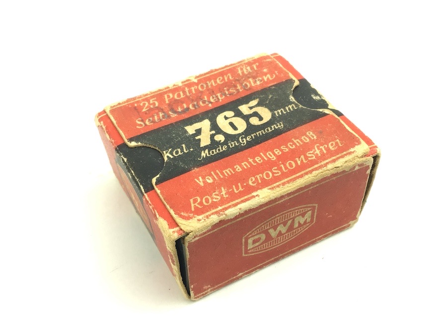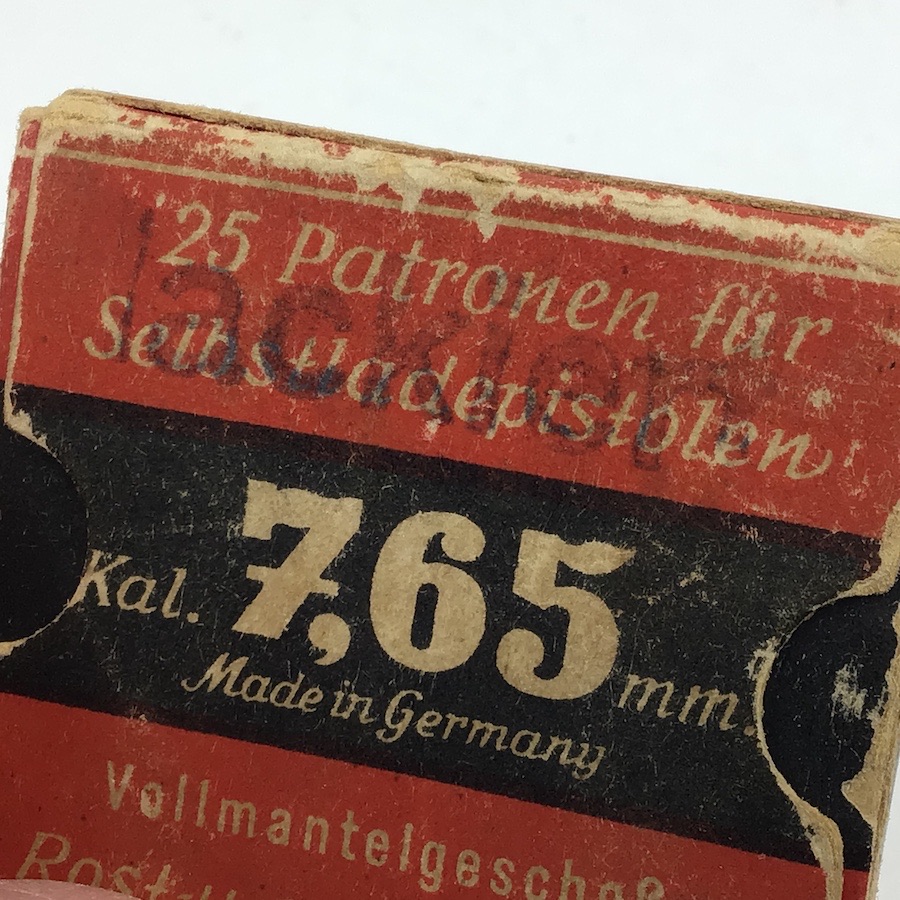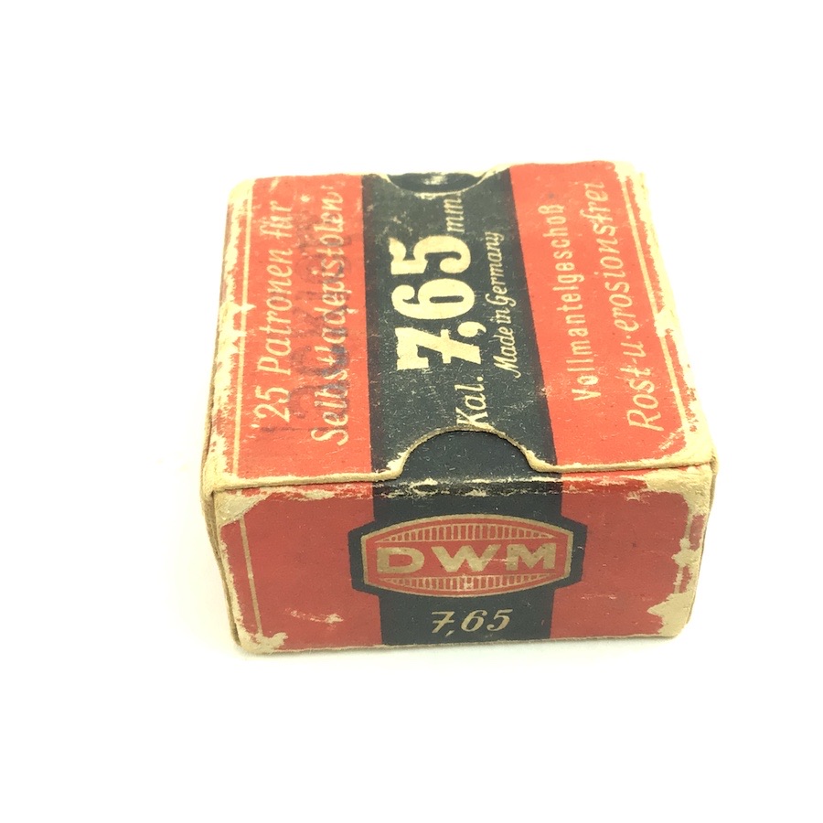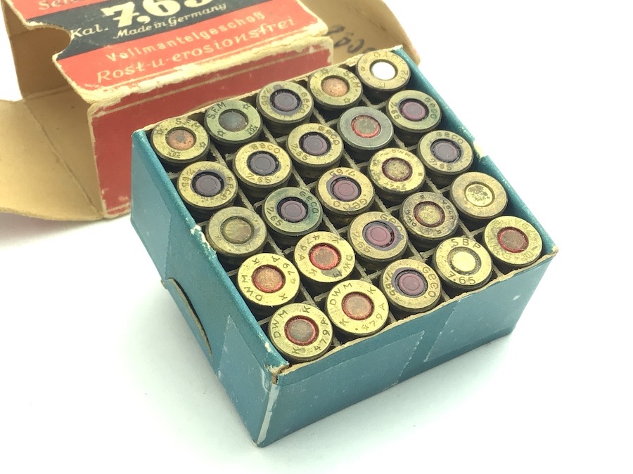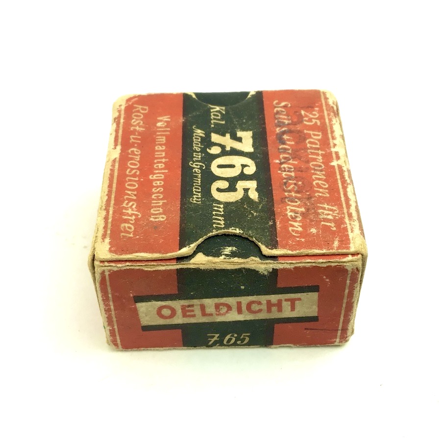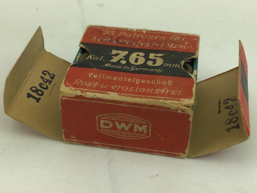 4/7/22 – Original and great condition. WWII era 7.65mm ammunition. The box is intact and good condition with bright colors. The cartridges are mixed manufacturers. Head stamped mostly DWM and GECO. Still a nice collectors item.