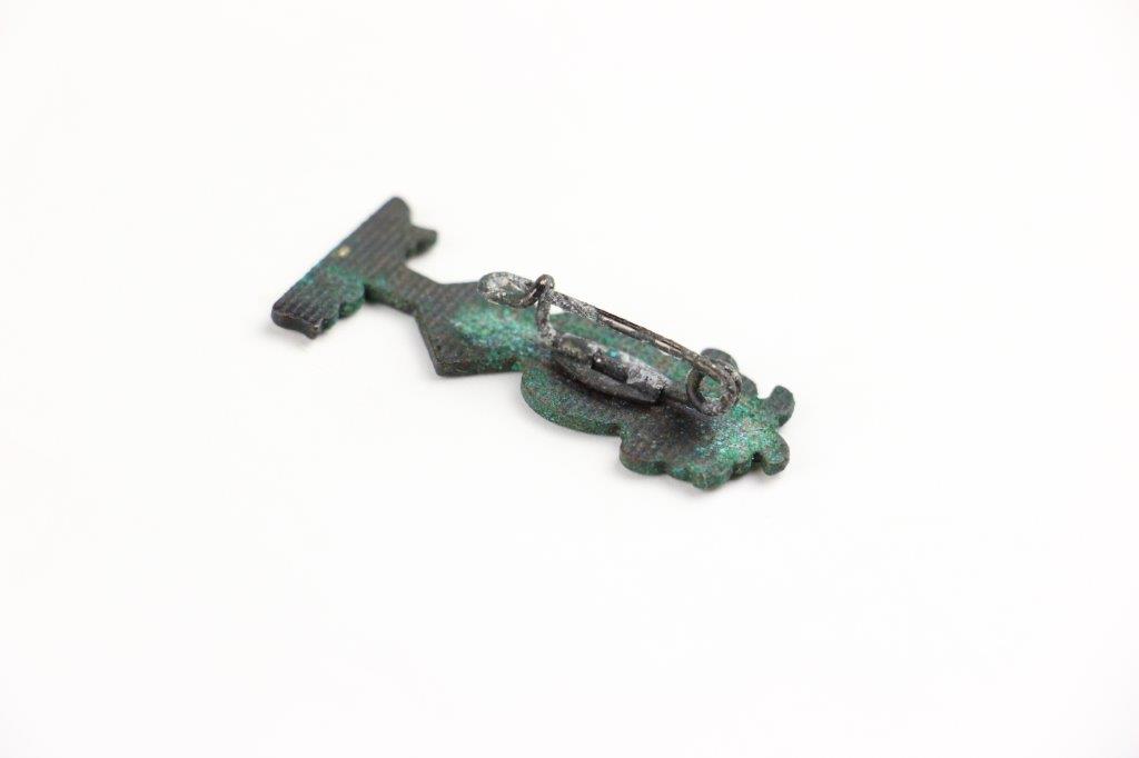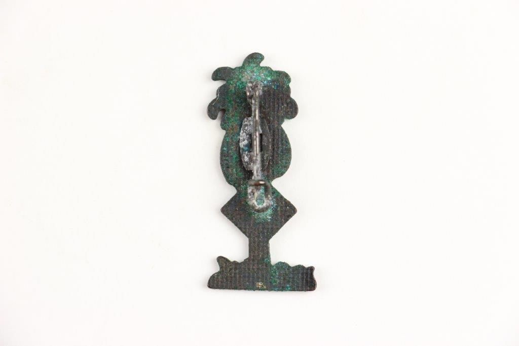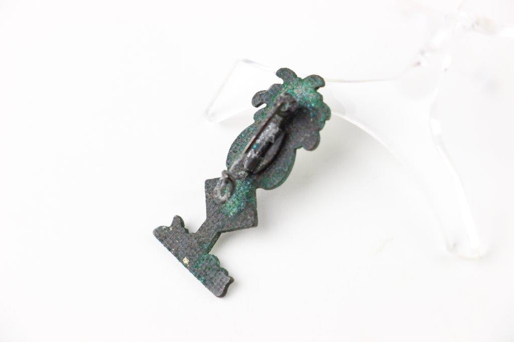 7/17/24 – This is an original WW2 German Afrika Korps (DAK) Uniform Lapel Pin. The pin is in very good overall condition with honest wear and some mild verdigris and patina from age. Excellent enamel white and black paint with no cracking or chips. The reverse has no markings or stamps, and has a fully functional pin. Mild patina throughout the backside, as shown. Measures 3.5cm tall and about 1.5cm wide at the base.