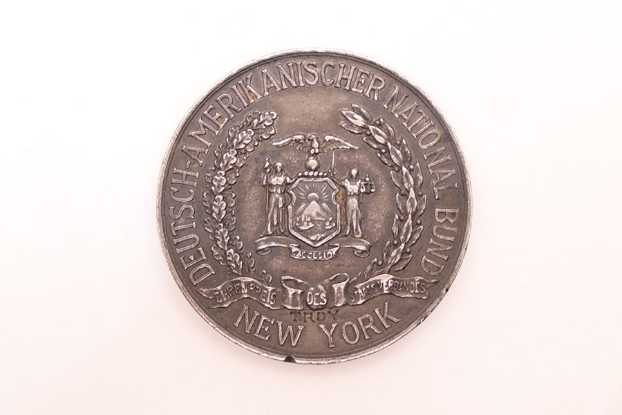 11/11/20 – German American National Bund Honor Prize for New York State. 1.6” diameter. The National German-American Alliance – Deutschamerikanischer National-Bund, was a federation of ethnic German associations in the United States founded in Philadelphia on October 6, 1901, whose mission was to “promote and preserve German culture in America”, and at the peak of its growth, around 1916, had a membership of approximately 2.5 million people. In an atmosphere of rising anti-German sentiment, the Bund’s outspokenness against prohibition, its stance for neutrality during World War I, and its support of Germany, especially its practice of raising money for German war relief, led to its charter being revoked in 1918, following a Senate investigation. Congress passed a bill to revoke the charter in July, and President Wilson signed the measure into law on August 31.