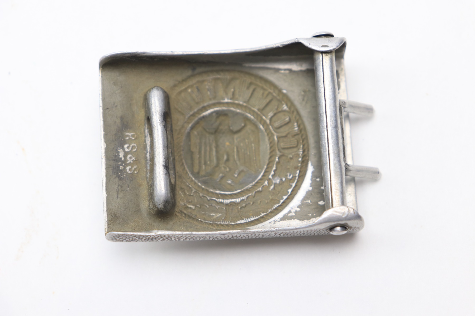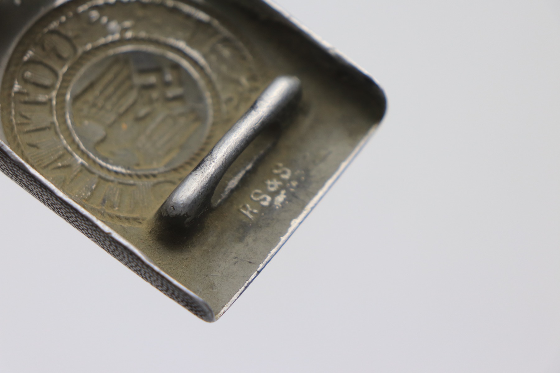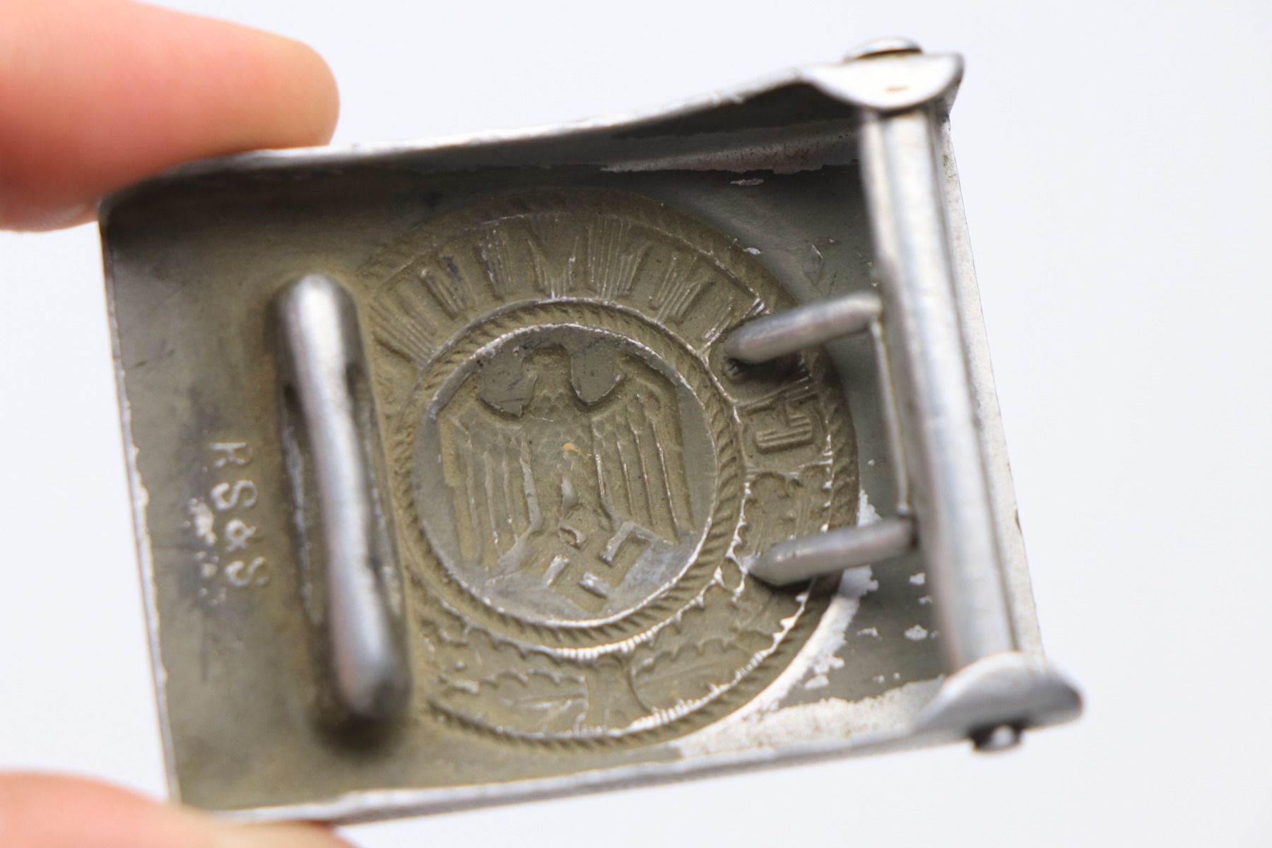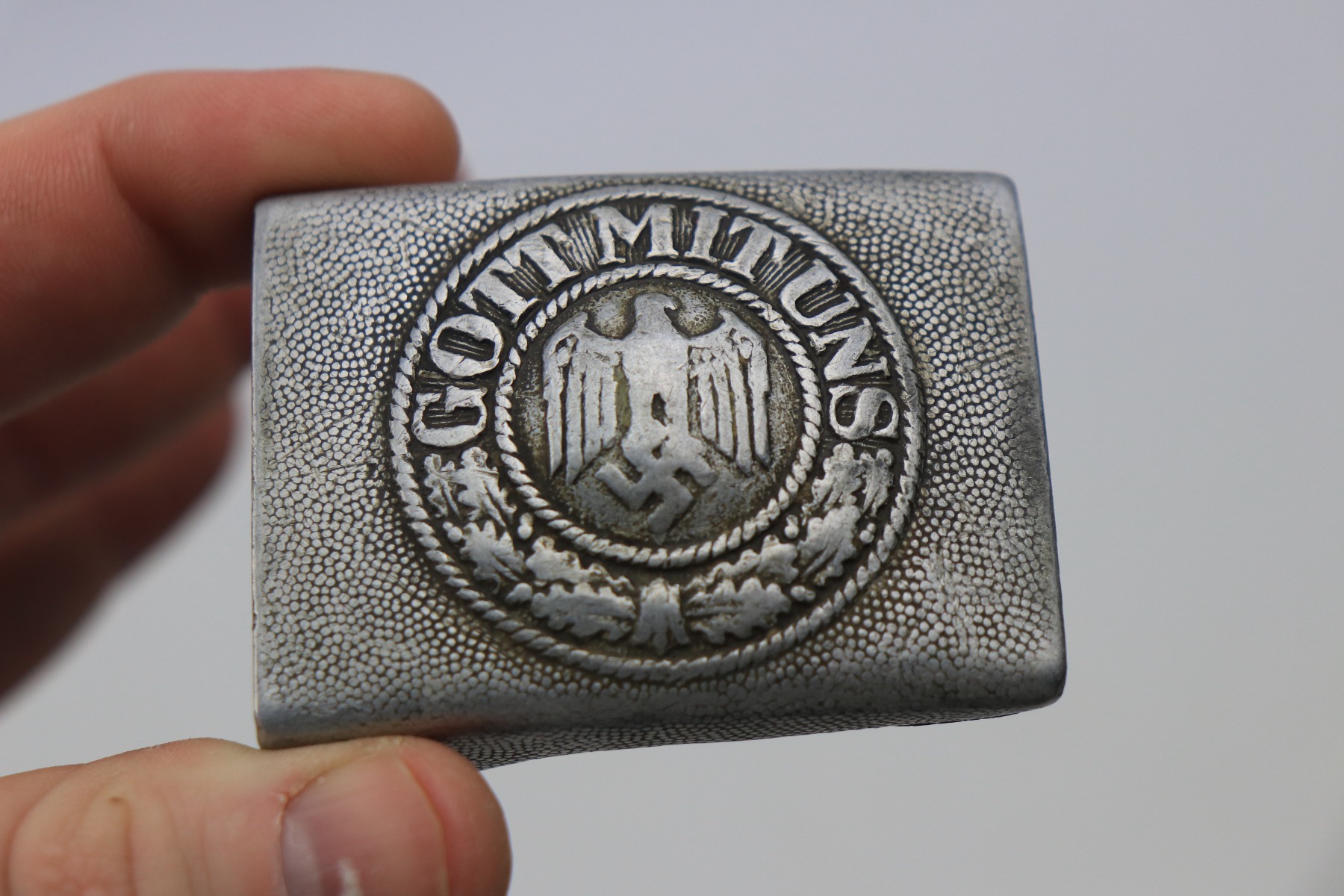 1/31/22 – This is an original wartime production German Army belt buckle from WW2. The buckle is aluminum construction with patina and surface wear throughout the front. Most of the finish is gone, except for on the reverse there’s still some olive green paint evident. The reverse also shows a maker stamp by R.S.&S.