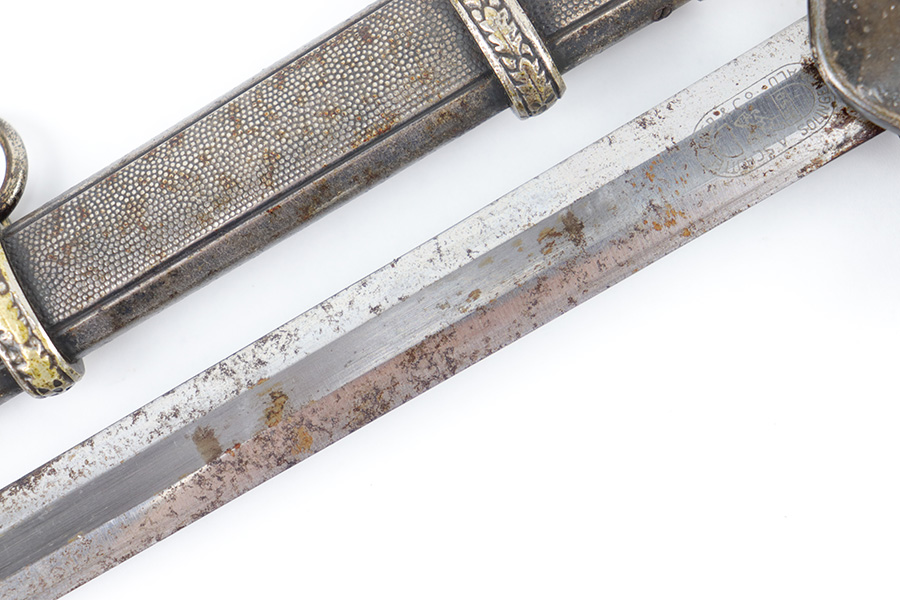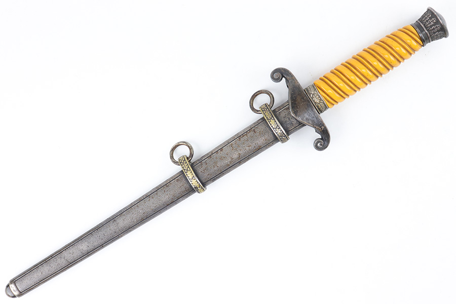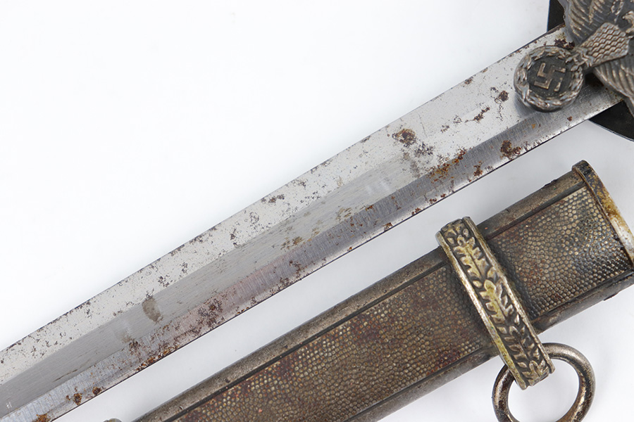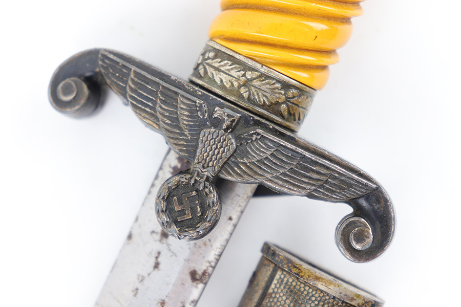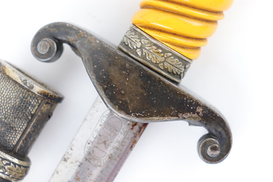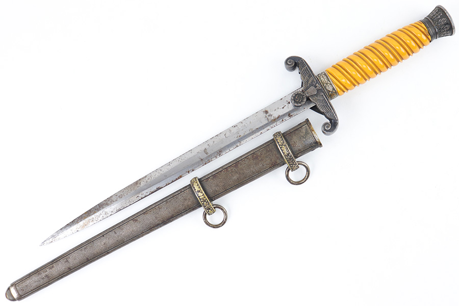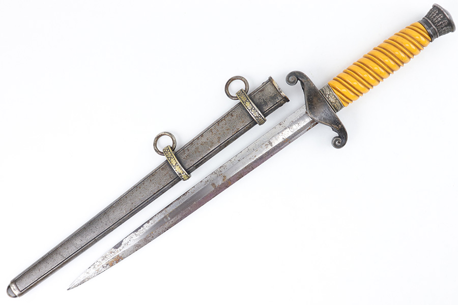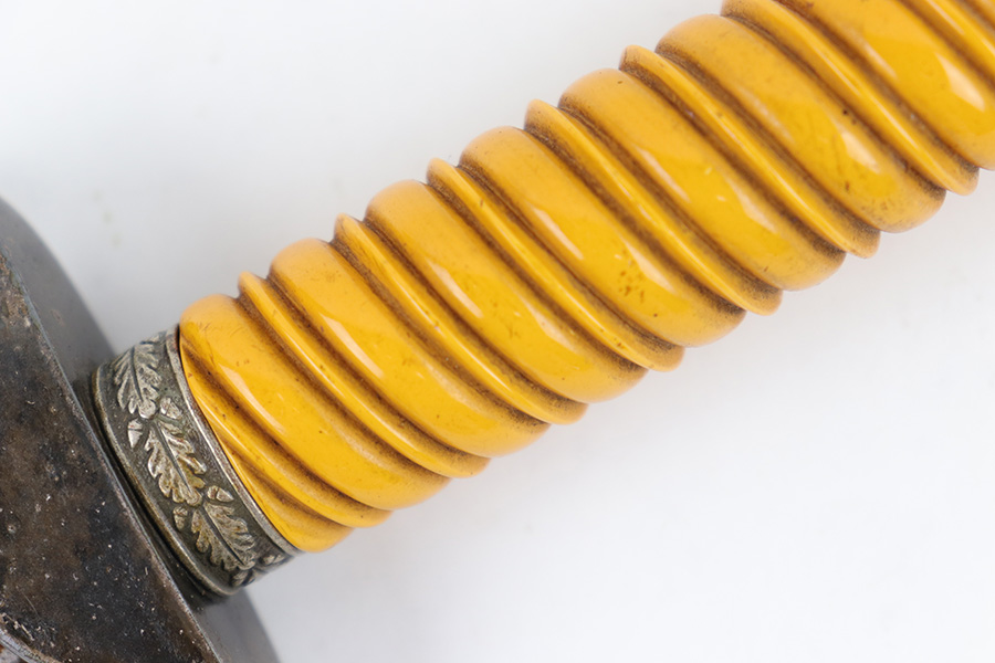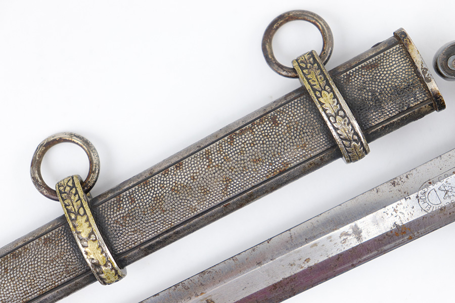 5/31/23 – This is an original WW2 production German Army Officer’s dress dagger. The dagger is in good condition, but has dark surface patina and discoloration throughout the blade. There’s also some mild surface scratching and scabbard rub wear. The edges are unsharpened, but the tip has a very minor chip. Maker marked at the base of the blade as shown. The hand guard and pommel both retain some of the original finish, and show high edge wear and typical surface patina throughout. The bakelite handle has no cracks or chips, but there are a few small scuffs and signs of aging. Comes with an original scabbard in great overall condition with some dark surface patina.
