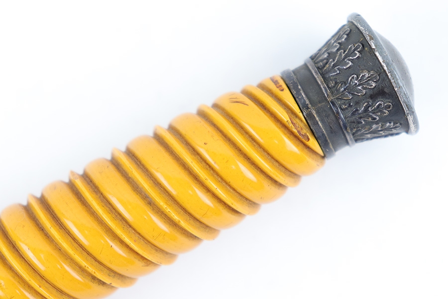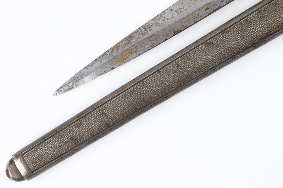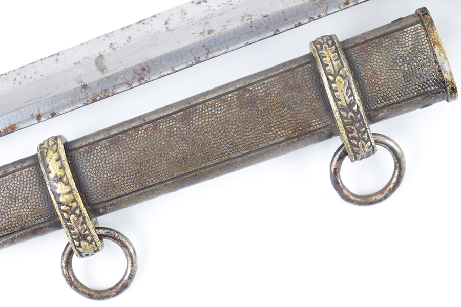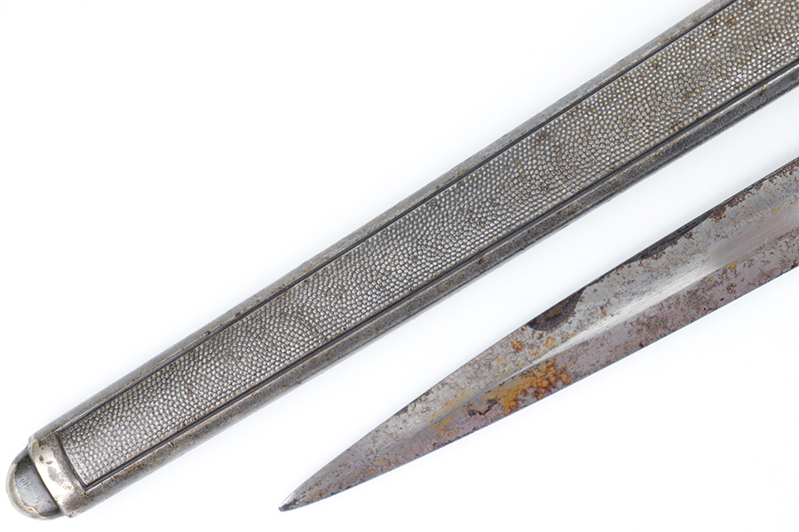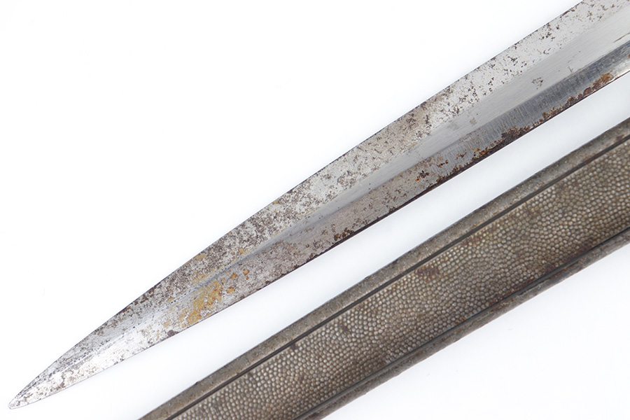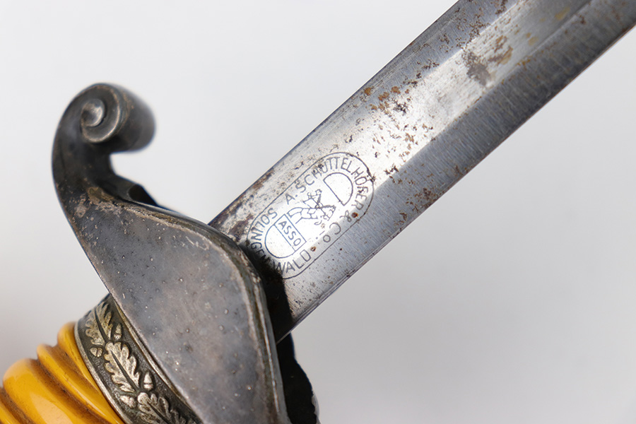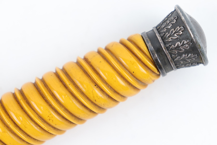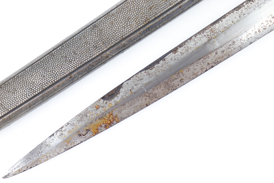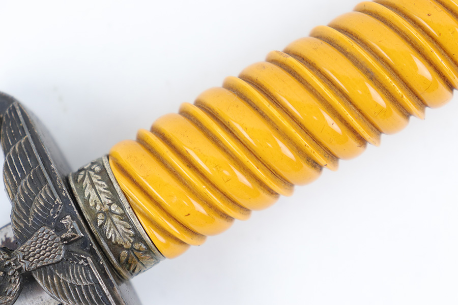 5/31/23 – This is an original WW2 production German Army Officer’s dress dagger. The dagger is in good condition, but has dark surface patina and discoloration throughout the blade. There’s also some mild surface scratching and scabbard rub wear. The edges are unsharpened, but the tip has a very minor chip. Maker marked at the base of the blade as shown. The hand guard and pommel both retain some of the original finish, and show high edge wear and typical surface patina throughout. The bakelite handle has no cracks or chips, but there are a few small scuffs and signs of aging. Comes with an original scabbard in great overall condition with some dark surface patina.