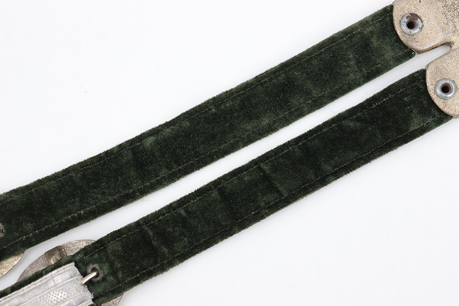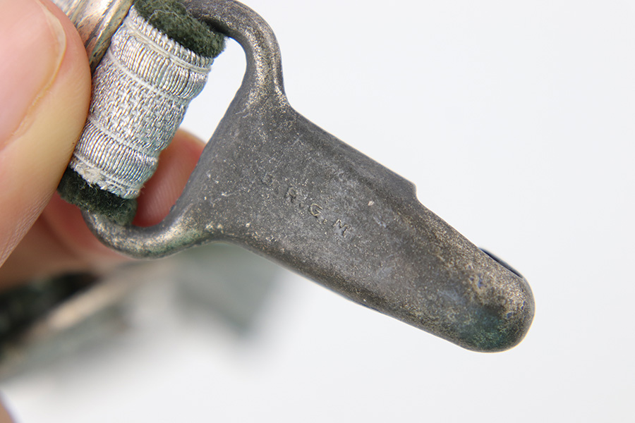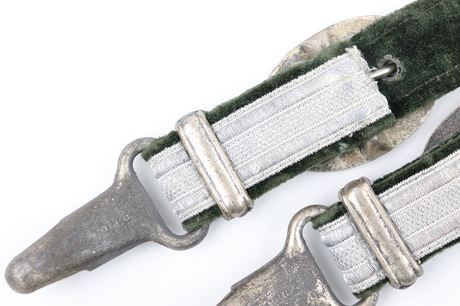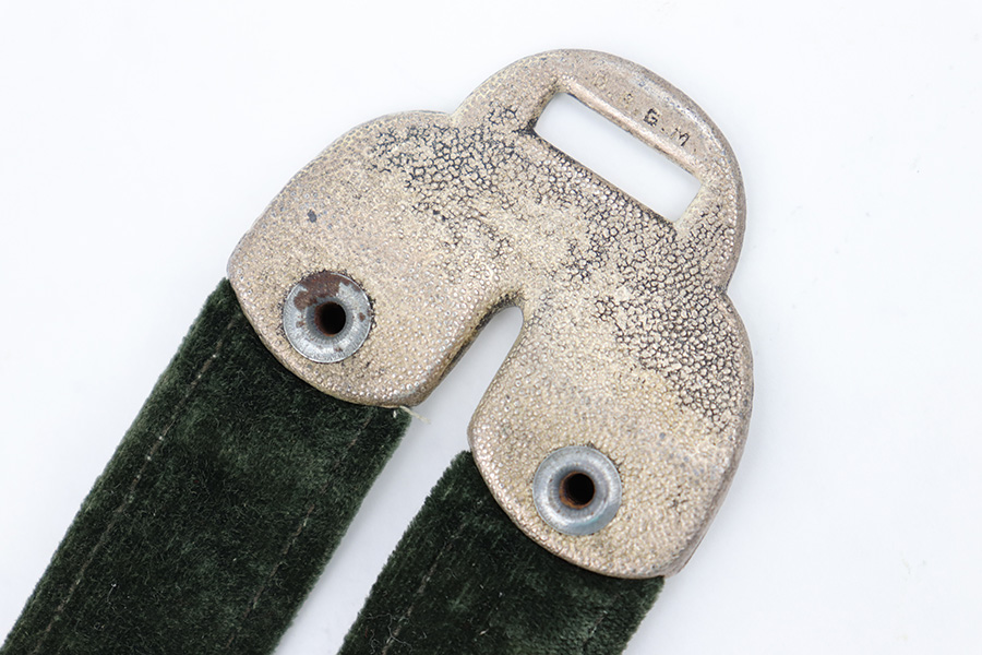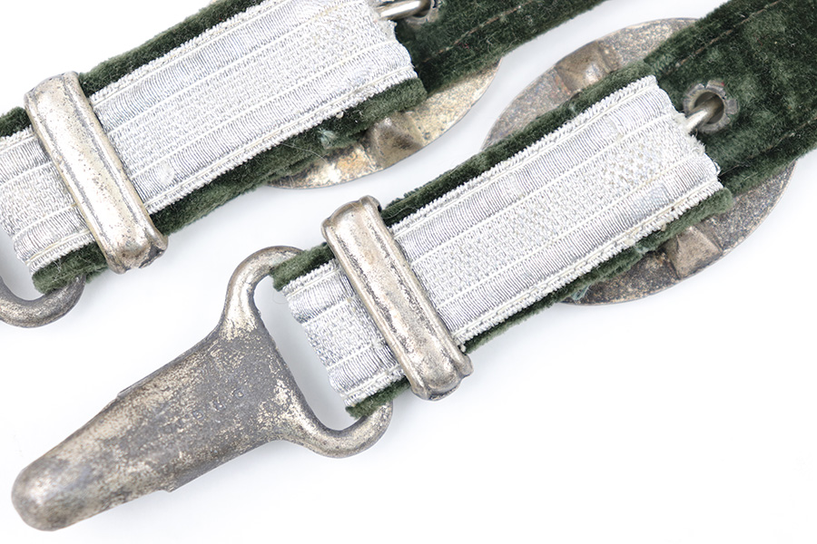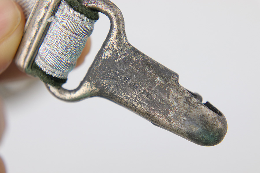 6/27/23 – This is an original WW2 German Army Dagger hanger. The hanger is in near-excellent condition with very clean silver threading and green velvet underside. There’s no fraying or discoloration on the chords. The metal fittings have some light surface tarnishing and mild discoloration. The fittings are all non-magnetic except for the two rivets on the belt-attaching end, and the buckle fixtures. The loops and hooks are non-magnetic. The dagger clips are D.R.G.M. stamped, as well as the belt hanger piece.