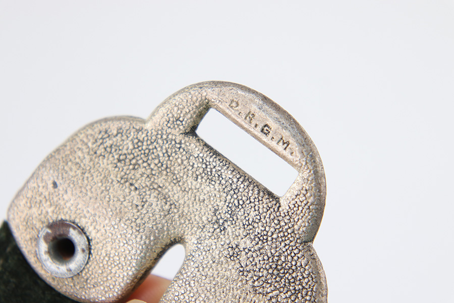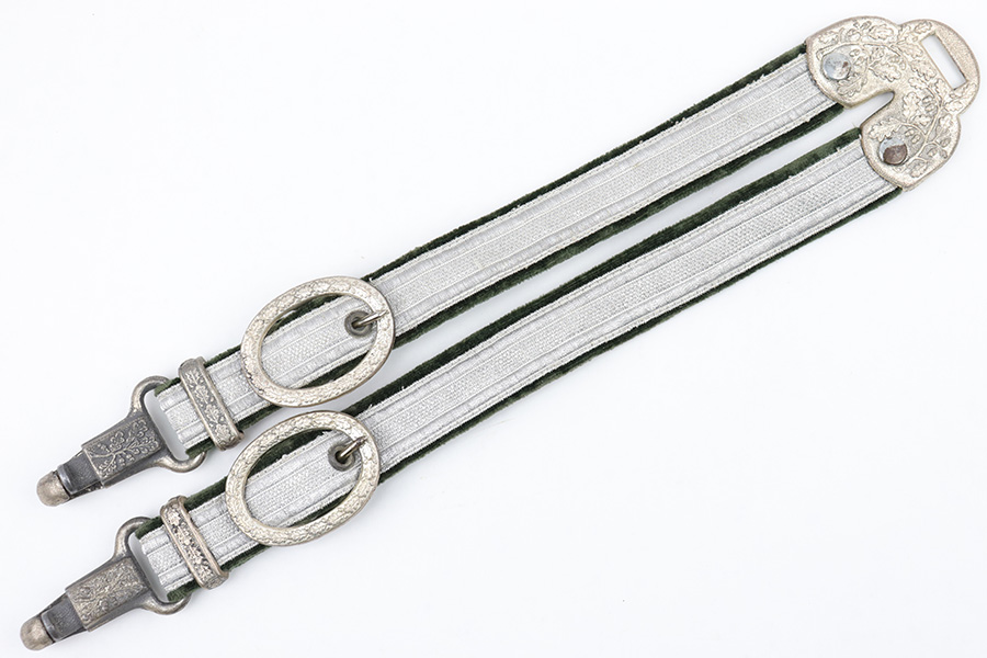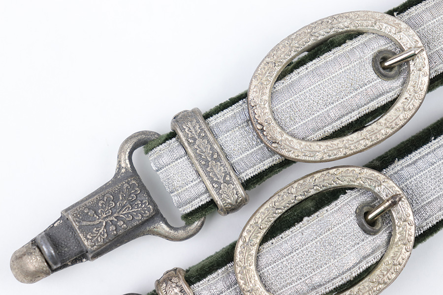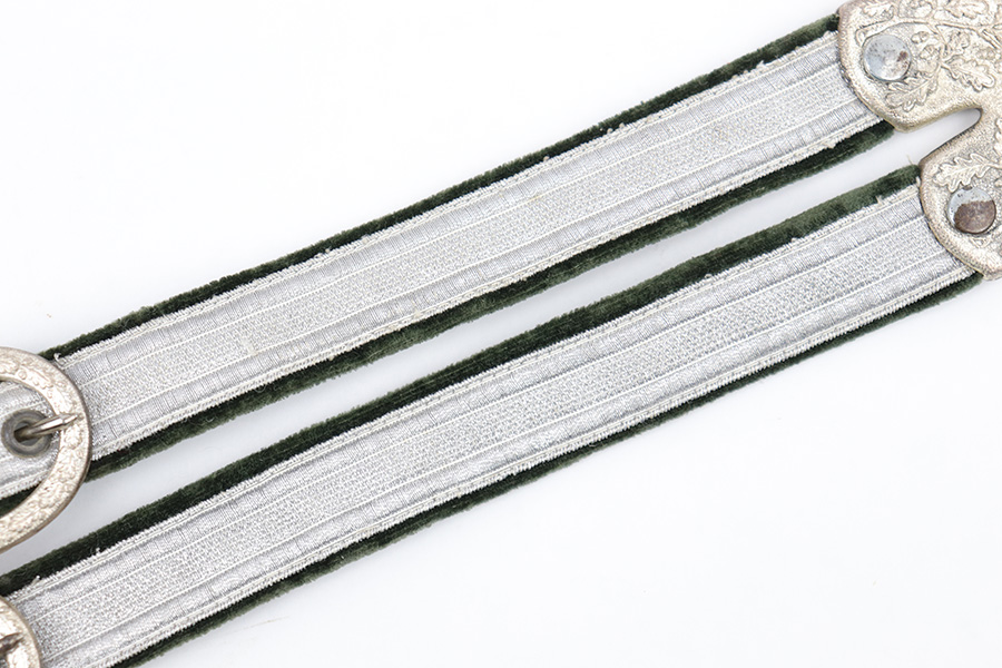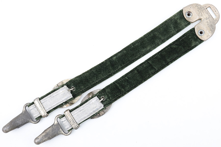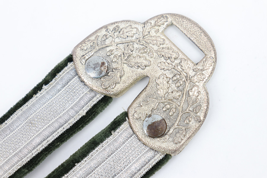 6/27/23 – This is an original WW2 German Army Dagger hanger. The hanger is in near-excellent condition with very clean silver threading and green velvet underside. There’s no fraying or discoloration on the chords. The metal fittings have some light surface tarnishing and mild discoloration. The fittings are all non-magnetic except for the two rivets on the belt-attaching end, and the buckle fixtures. The loops and hooks are non-magnetic. The dagger clips are D.R.G.M. stamped, as well as the belt hanger piece.