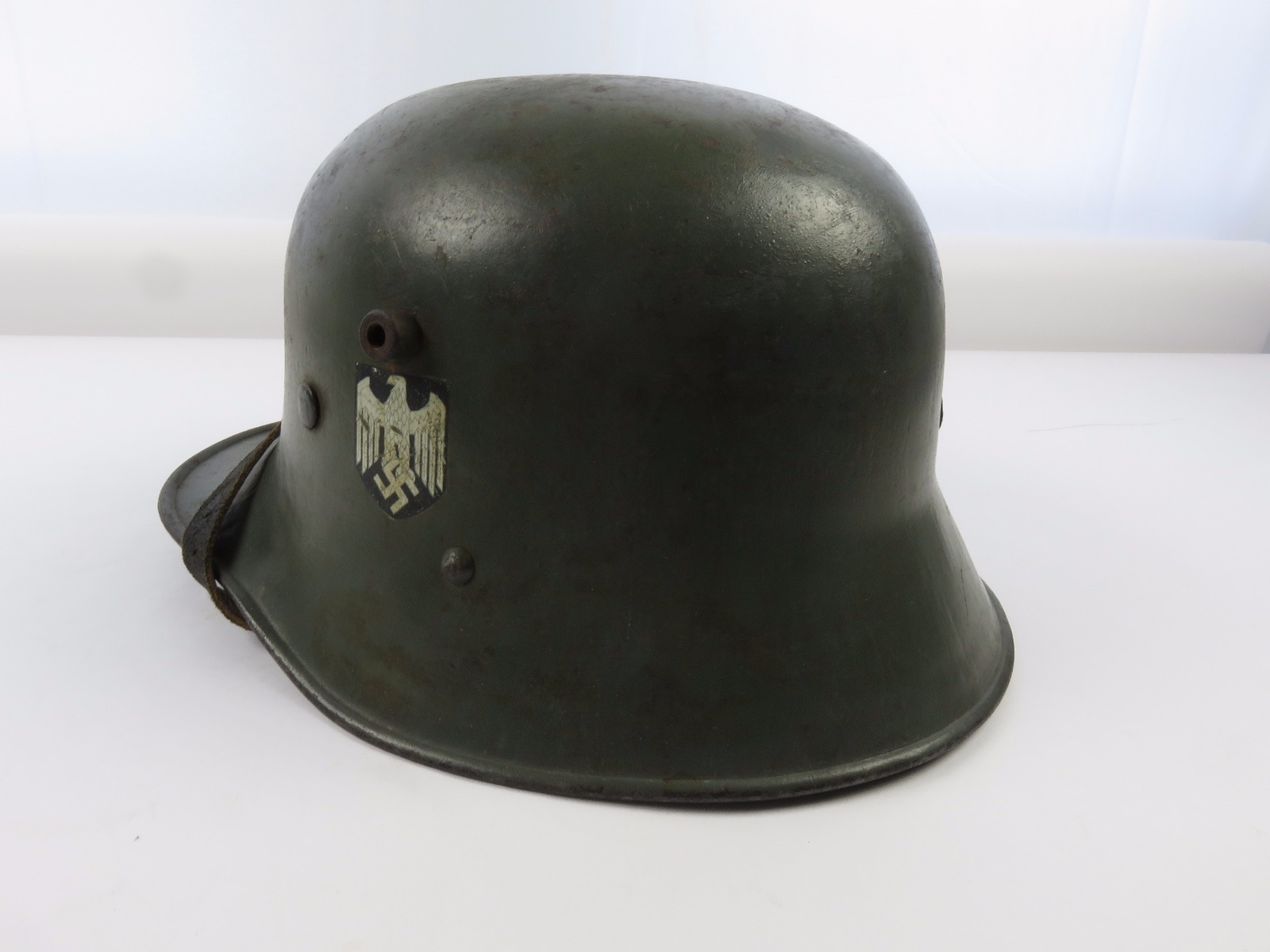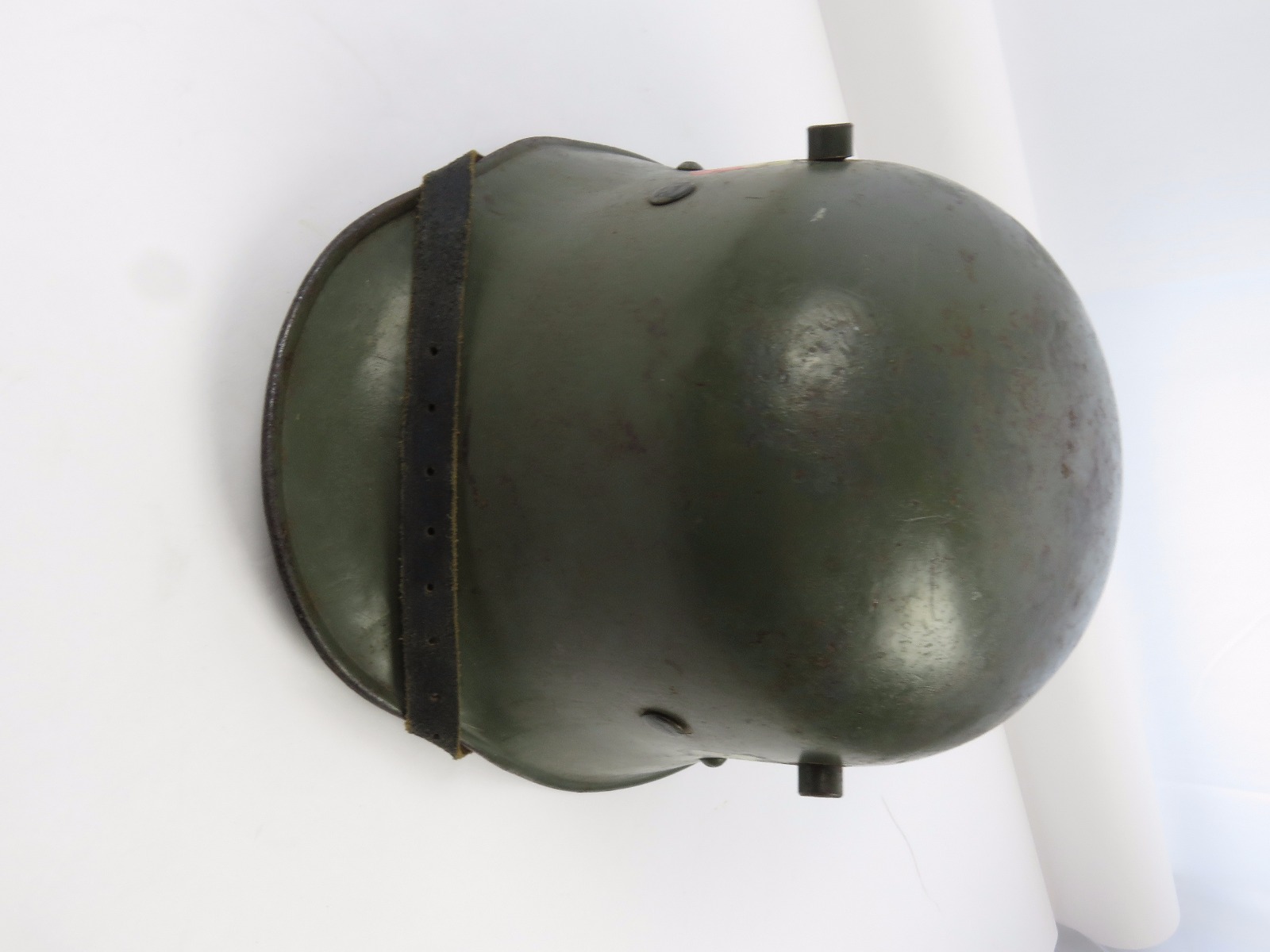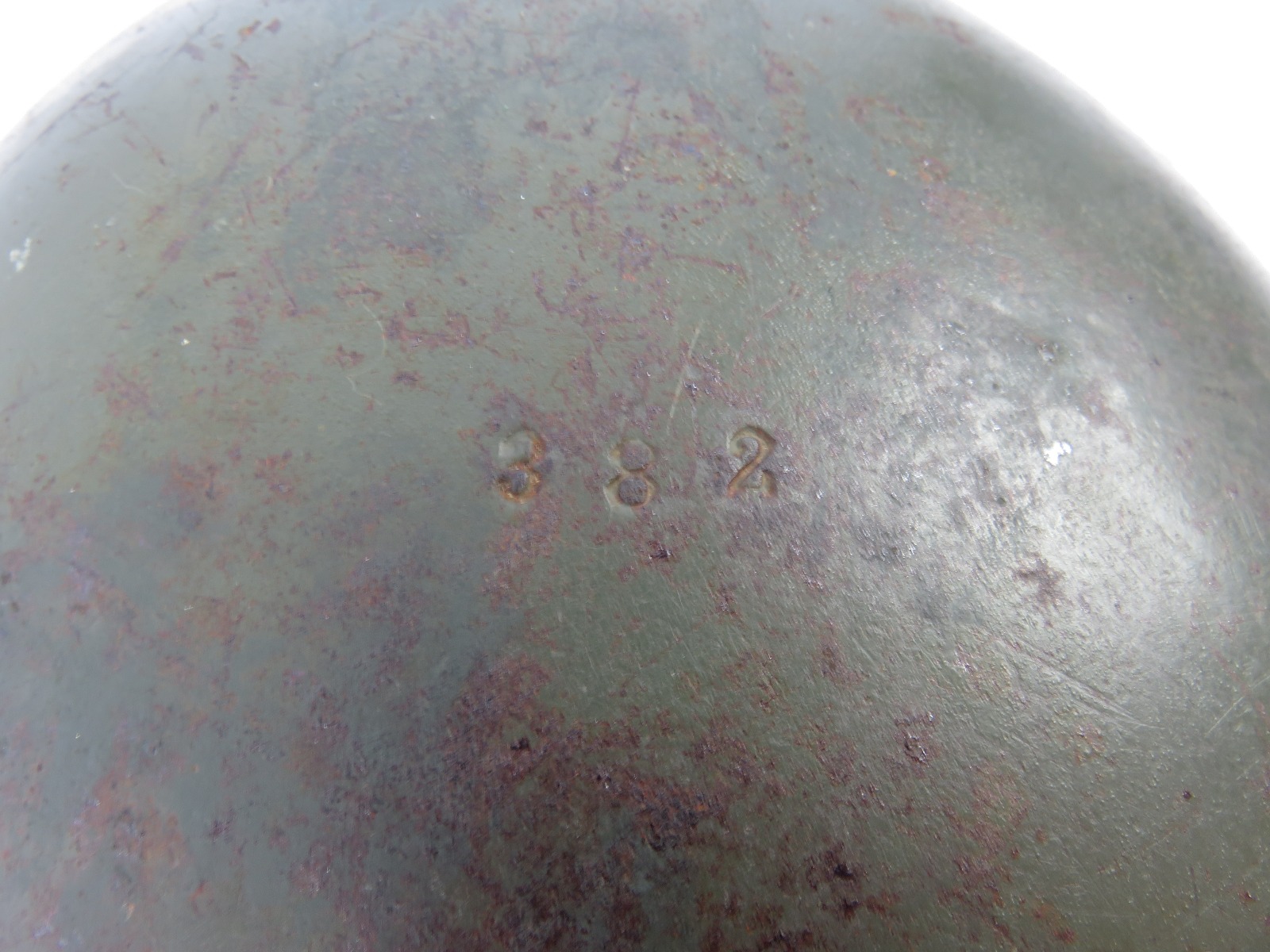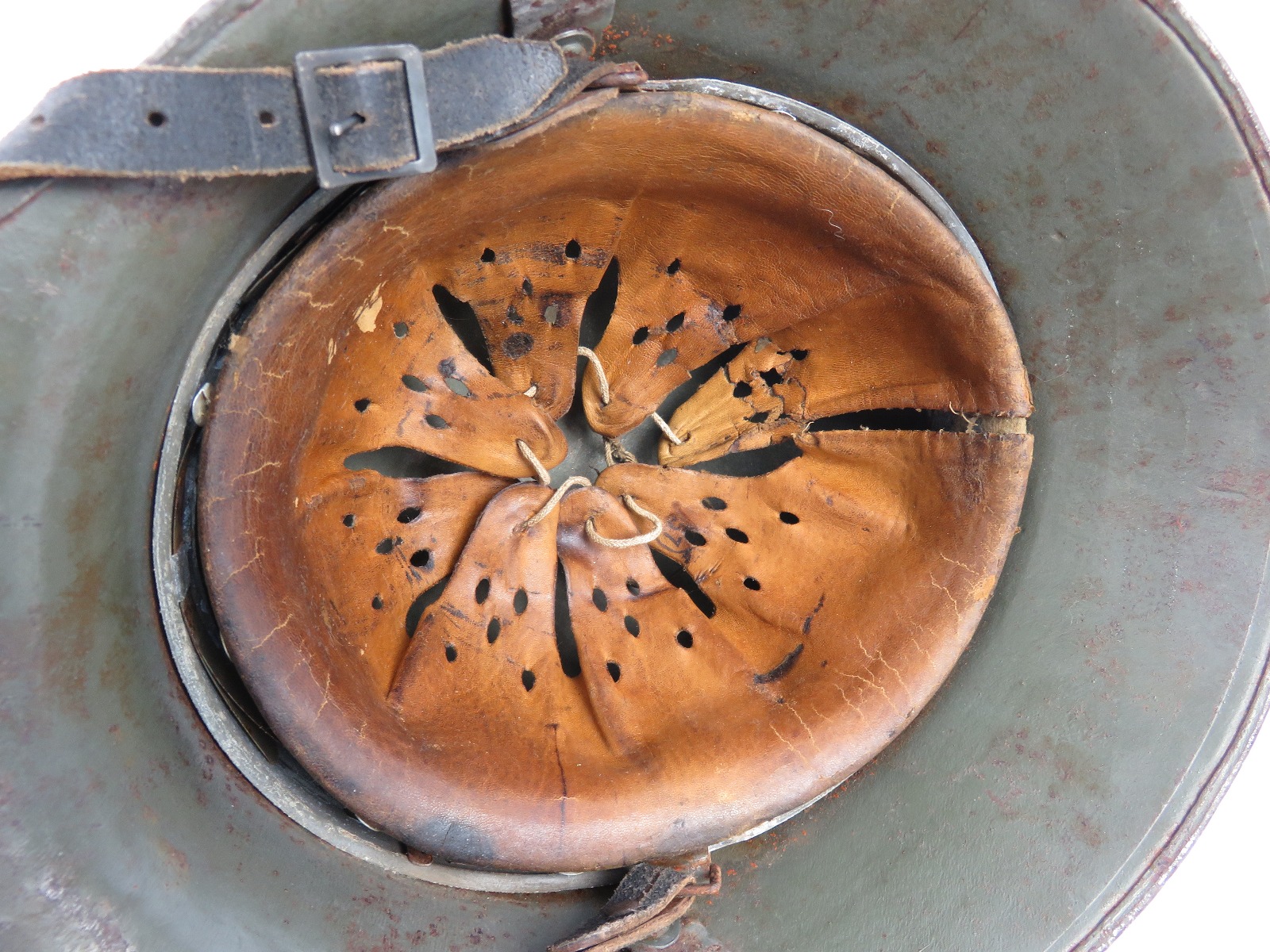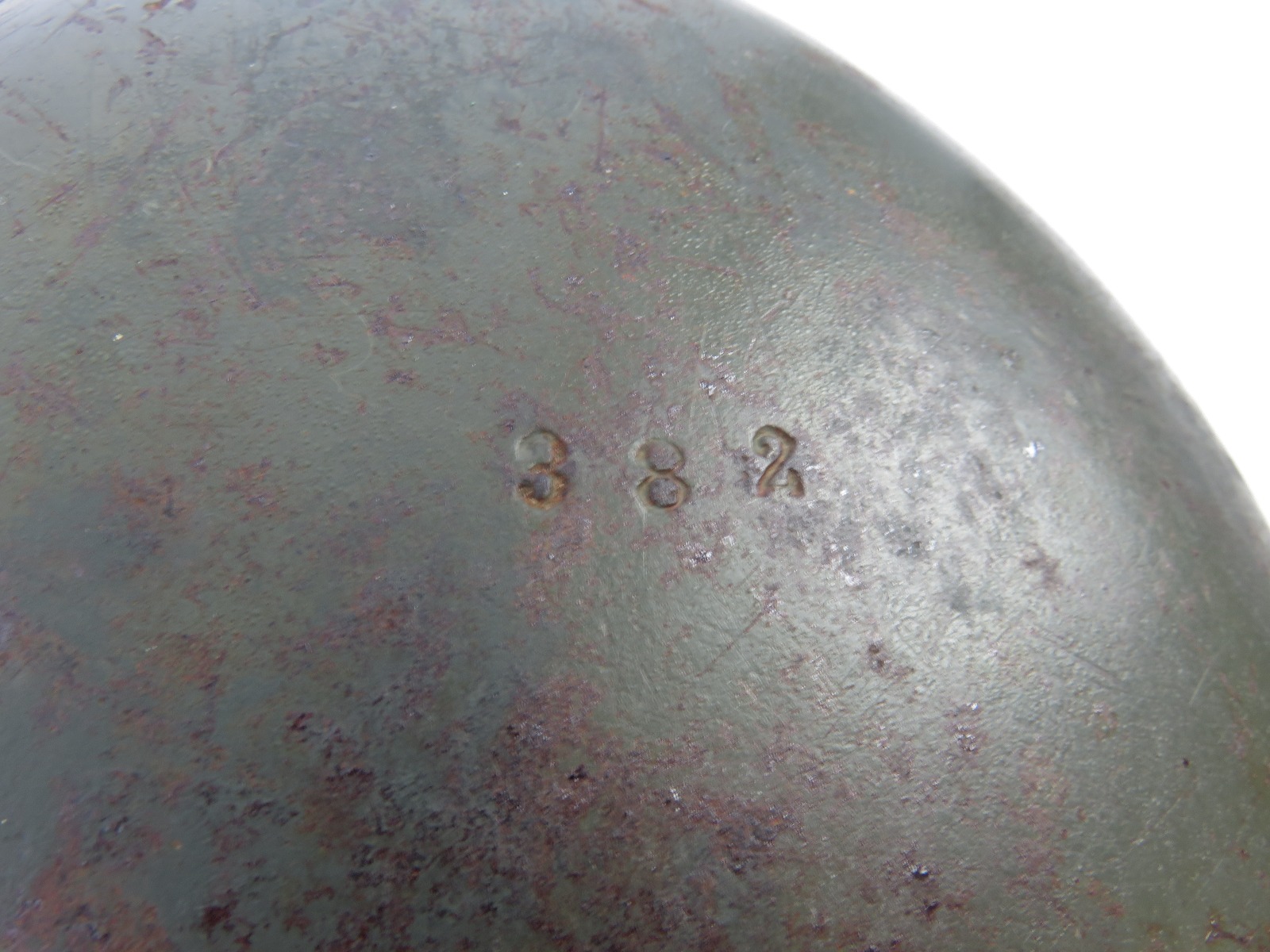 6/21/17 – This is an original, early WW2 double decal German military helmet. The helmet has early WW1 “lugs” on each side of the helmet. These lugs were used to attach a face-sheild for military troops in the first World War. However, soldiers didn’t like the weight and clunky feel of these metal face masks, so they quickly got rid of that and new helmets were lacking these lug nuts. This helmet was later reissued after WW1 for use during WW2. The helmet has a decal on either side, which is another early feature. The paint is also an early “apple green” color which is a lighter shade of green than later helmets. The top of this helmet is stamped “382”. The paint has some normal wear and spotty discoloration, but this is “good” wear that helps prove the authenticity of the paint and metal. The decals are original paint as well with minimal chipping or paint loss. The interior lining is worn, but completely in tact and original.