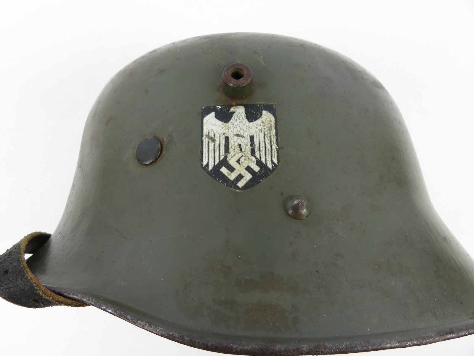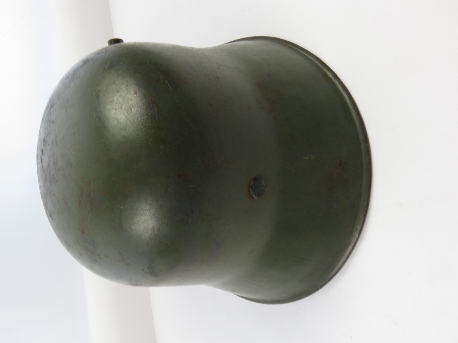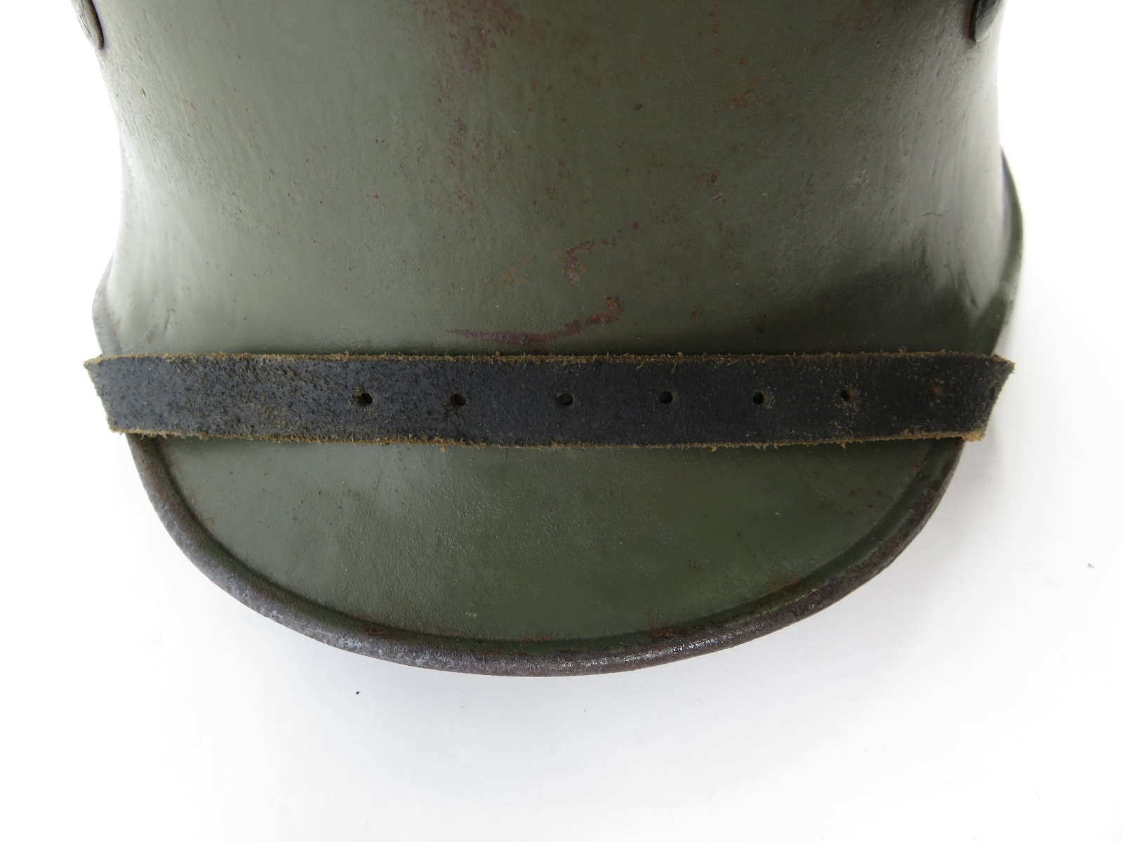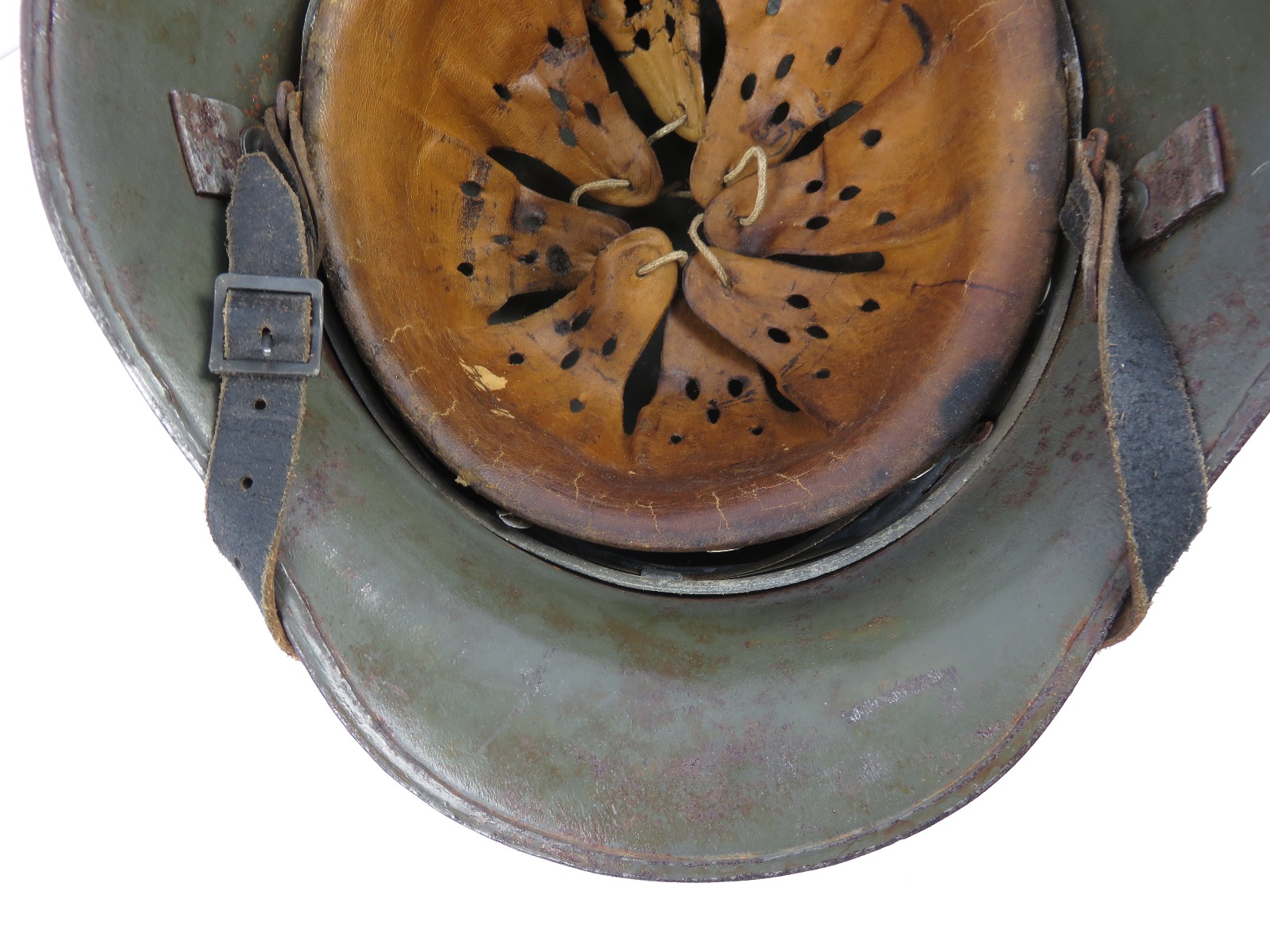 6/21/17 – This is an original, early WW2 double decal German military helmet. The helmet has early WW1 “lugs” on each side of the helmet. These lugs were used to attach a face-sheild for military troops in the first World War. However, soldiers didn’t like the weight and clunky feel of these metal face masks, so they quickly got rid of that and new helmets were lacking these lug nuts. This helmet was later reissued after WW1 for use during WW2. The helmet has a decal on either side, which is another early feature. The paint is also an early “apple green” color which is a lighter shade of green than later helmets. The top of this helmet is stamped “382”. The paint has some normal wear and spotty discoloration, but this is “good” wear that helps prove the authenticity of the paint and metal. The decals are original paint as well with minimal chipping or paint loss. The interior lining is worn, but completely in tact and original.