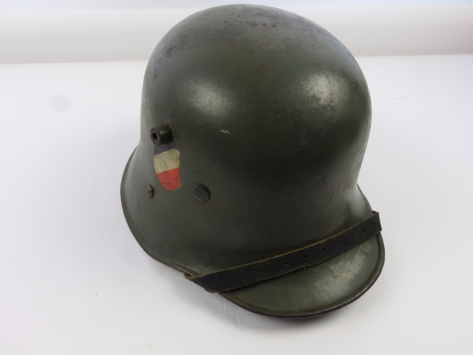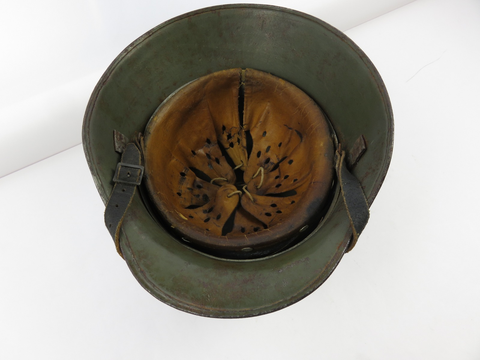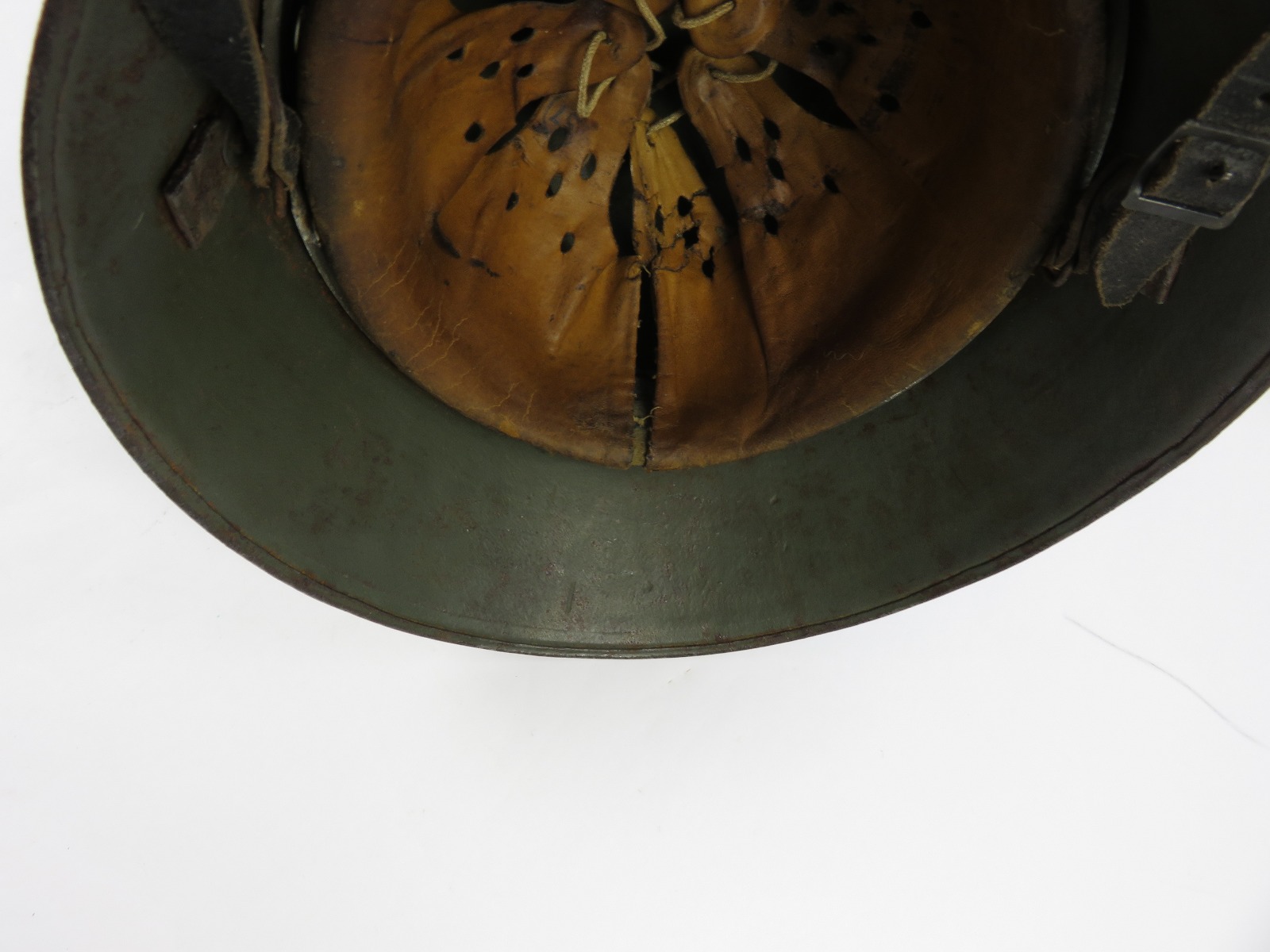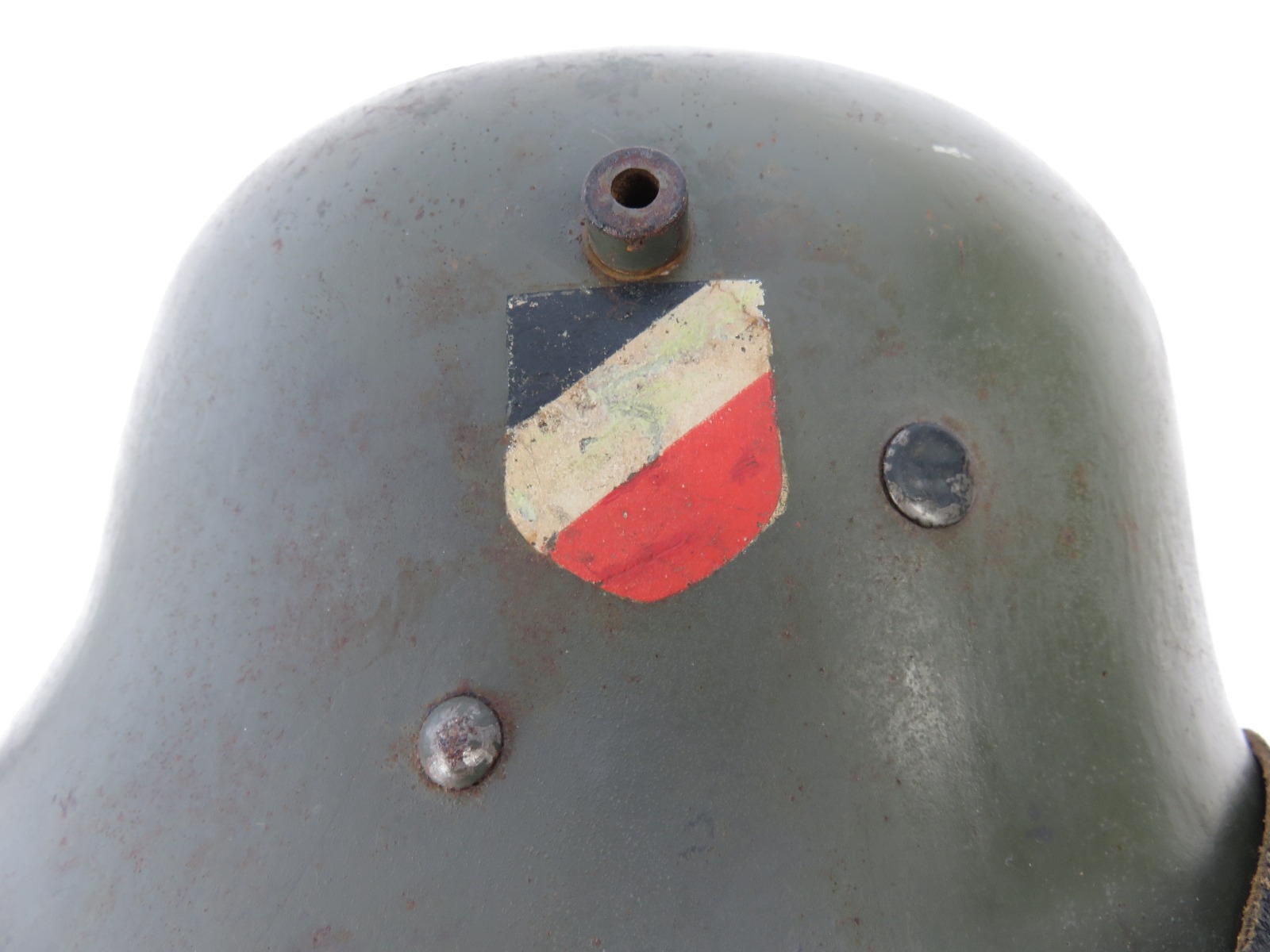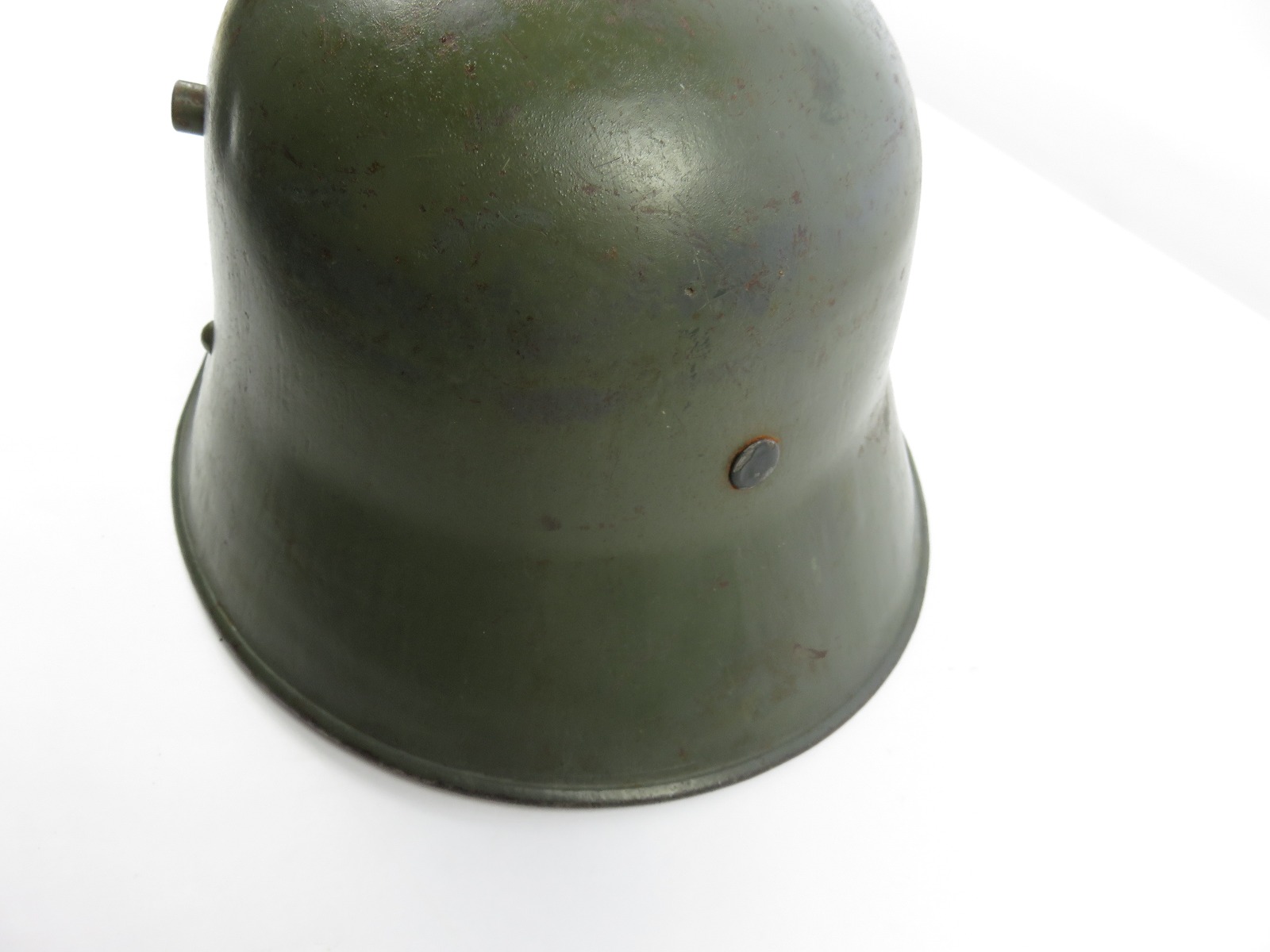 6/21/17 – This is an original, early WW2 double decal German military helmet. The helmet has early WW1 “lugs” on each side of the helmet. These lugs were used to attach a face-sheild for military troops in the first World War. However, soldiers didn’t like the weight and clunky feel of these metal face masks, so they quickly got rid of that and new helmets were lacking these lug nuts. This helmet was later reissued after WW1 for use during WW2. The helmet has a decal on either side, which is another early feature. The paint is also an early “apple green” color which is a lighter shade of green than later helmets. The top of this helmet is stamped “382”. The paint has some normal wear and spotty discoloration, but this is “good” wear that helps prove the authenticity of the paint and metal. The decals are original paint as well with minimal chipping or paint loss. The interior lining is worn, but completely in tact and original.