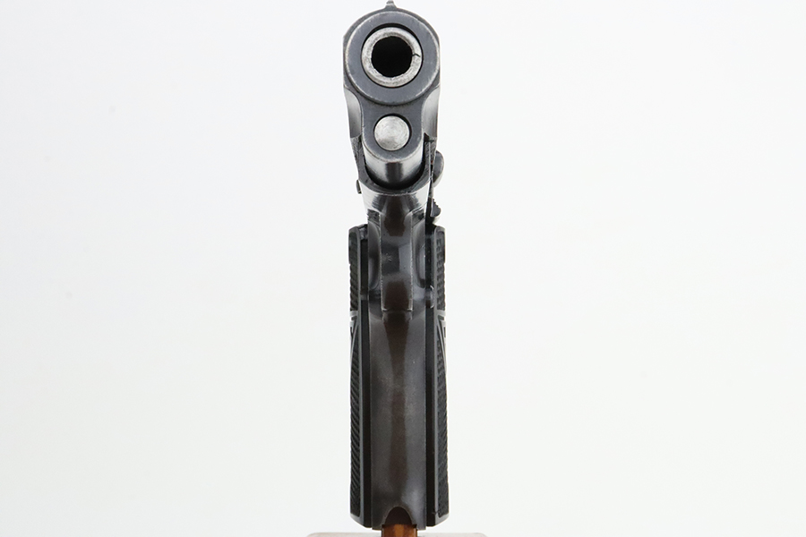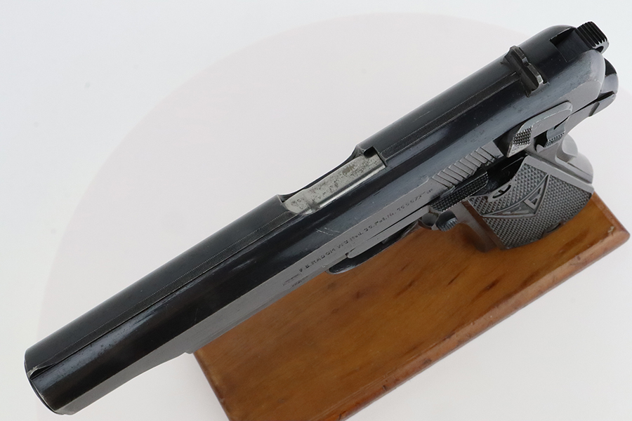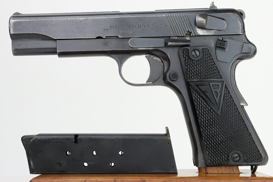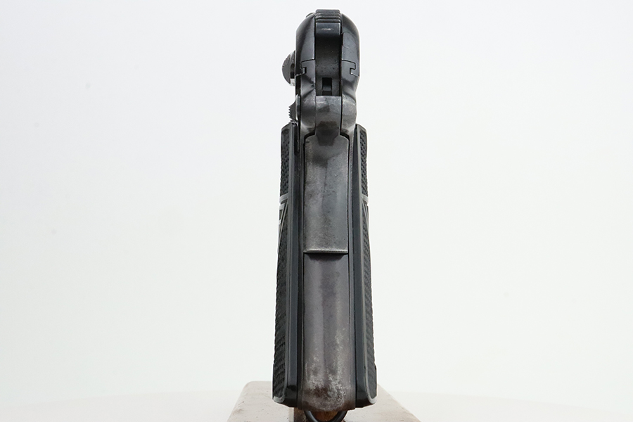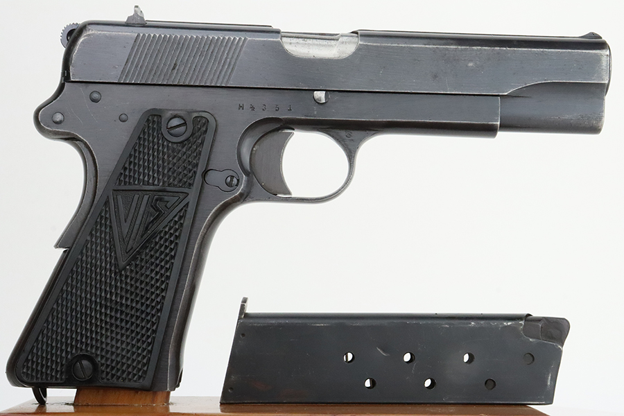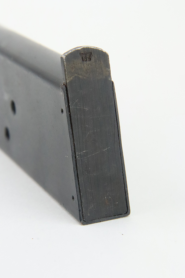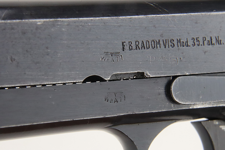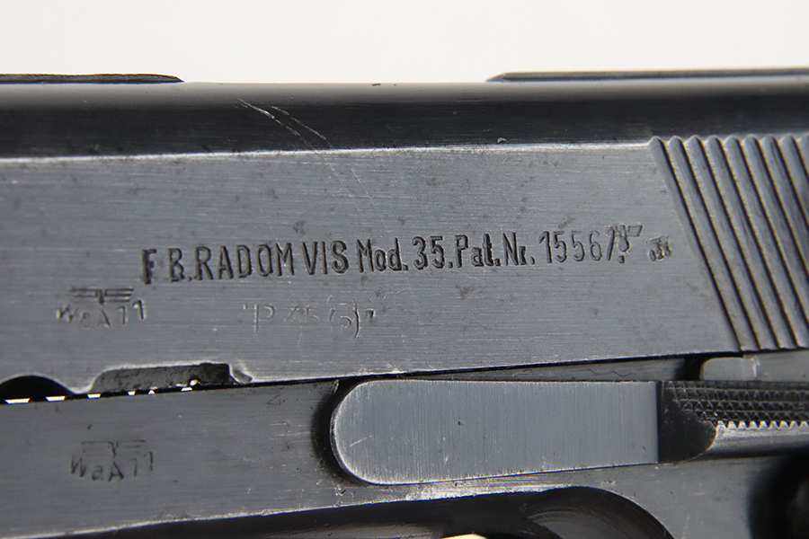 2/13/24 – This is a matching and original example of a Radom VIS P.35 that was issued to the German Army during World War II. Three-lever variation with functional de-cocker. Excellent profile view with standard high edge wear, and the most notable finish loss is found on the bottom of the back strap. Strong, shiny bore. Magazine has waffenamt. Very nice black grips with light handling wear but no cracks or chips.