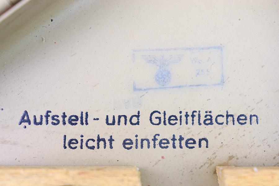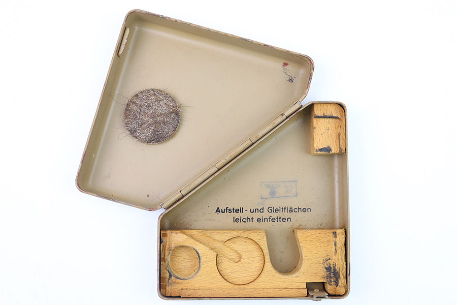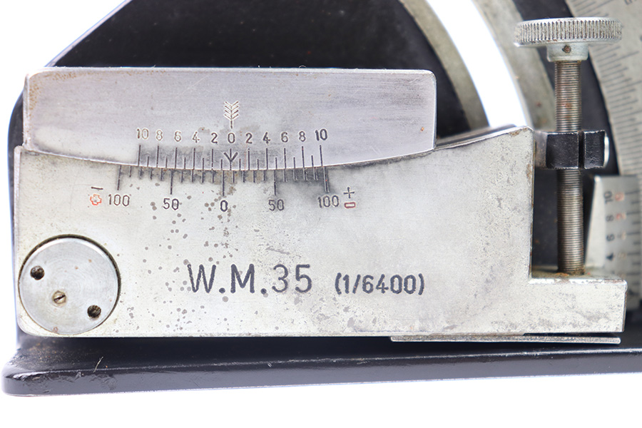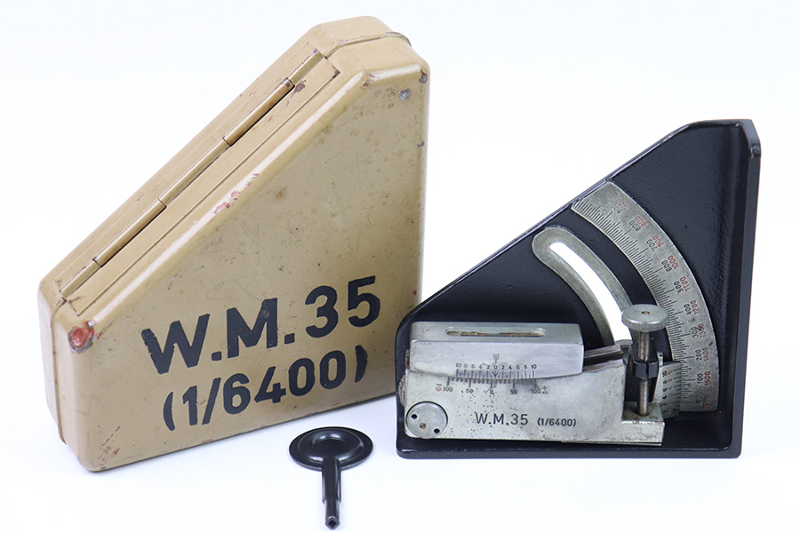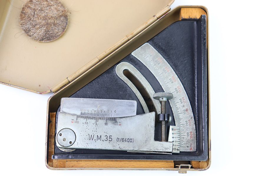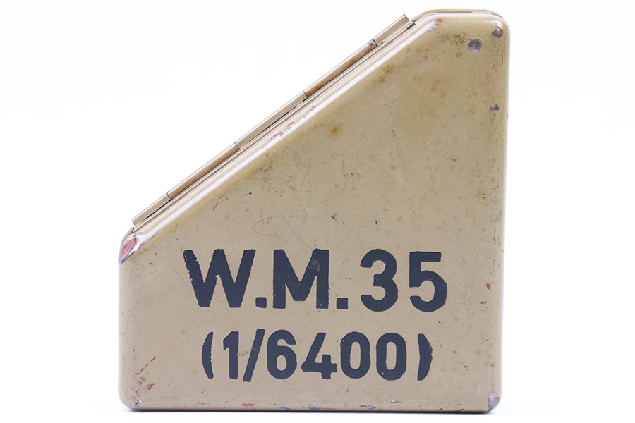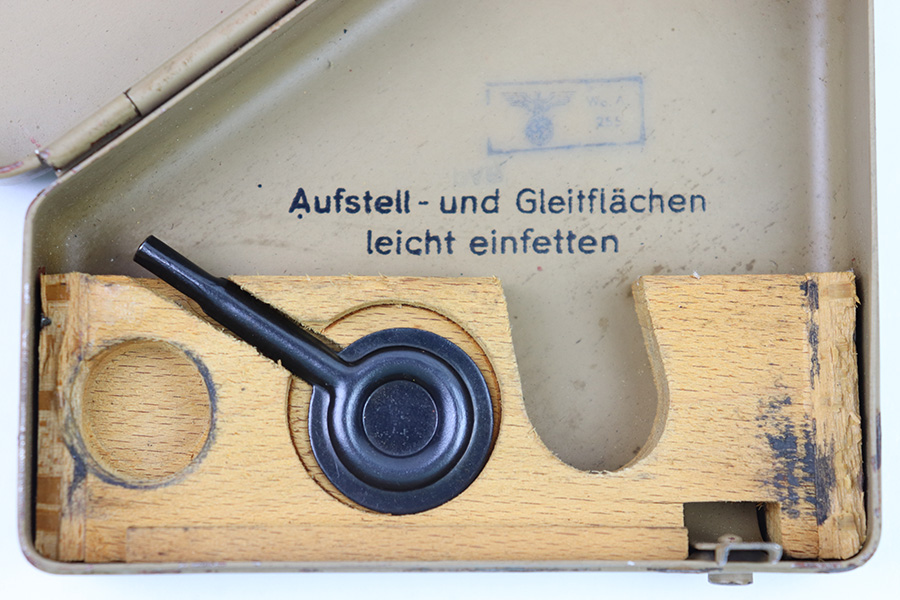 10/5/22 – This is an original German Anti-Aircraft Gunner Chinometer sighting device. The chinometer comes with the original metal case and adjustment tool, as shown. The chinometer and case are both marked “W.M. 35”, which stands for “Winkelmesser 35”. The chinometer is also marked with a maker code “bvu” and a blue triangle, which indicates the grease has been conditioned for cold climates. The device is fully functional with no major issues or notable flaws. The case shows some mild edge wear and signs of aging but no dents and clean paint throughout.