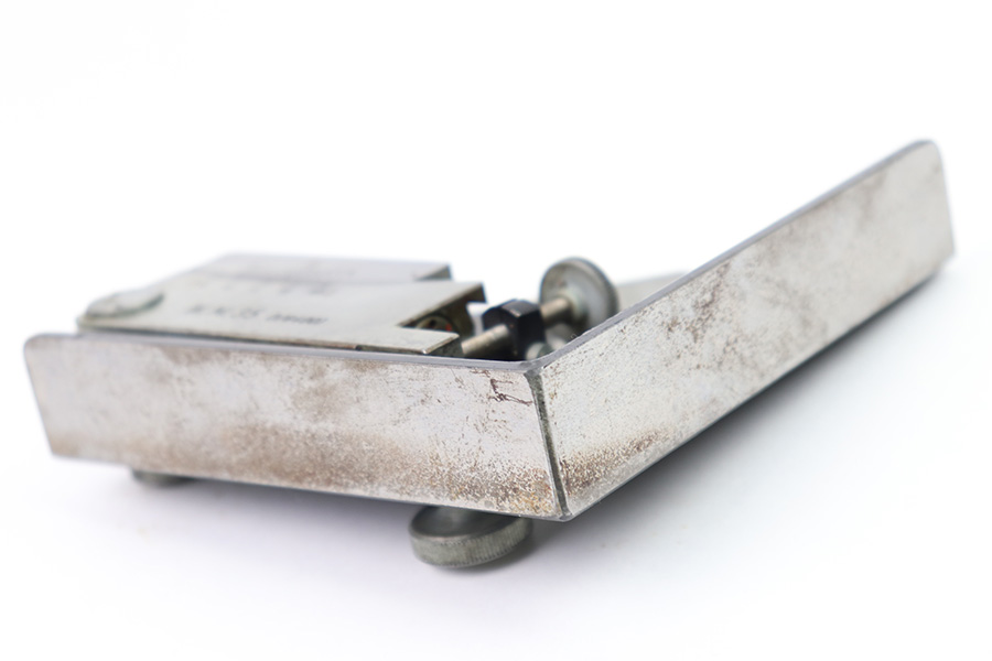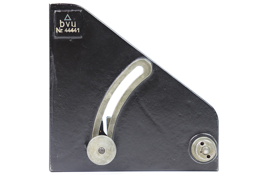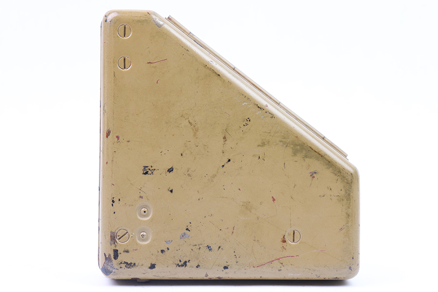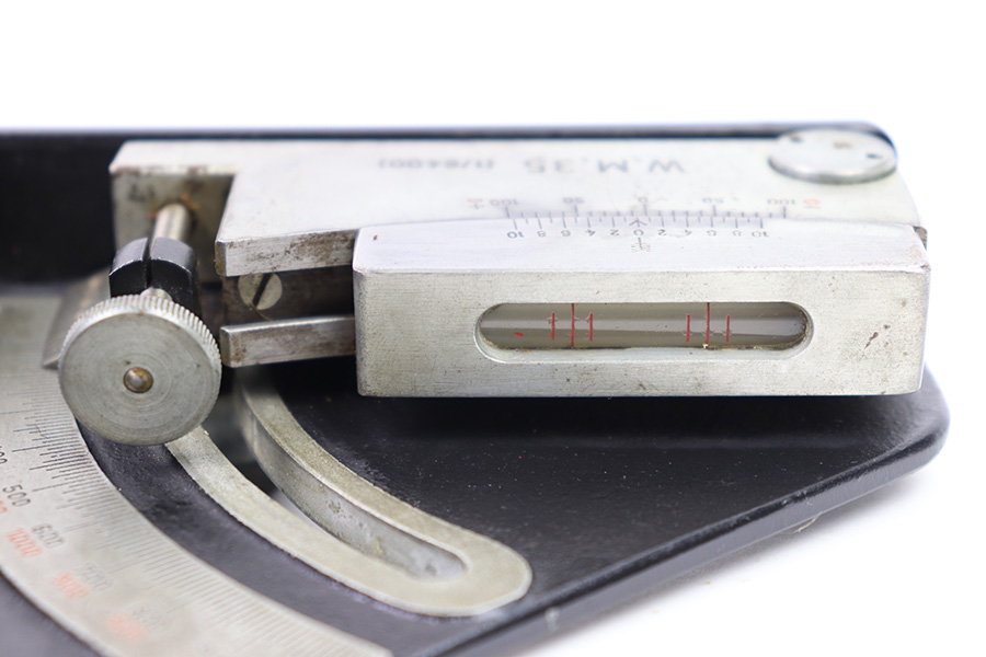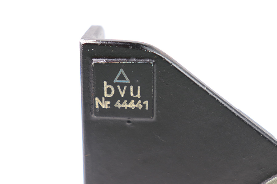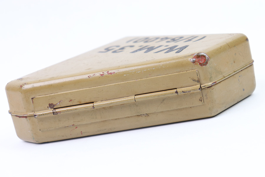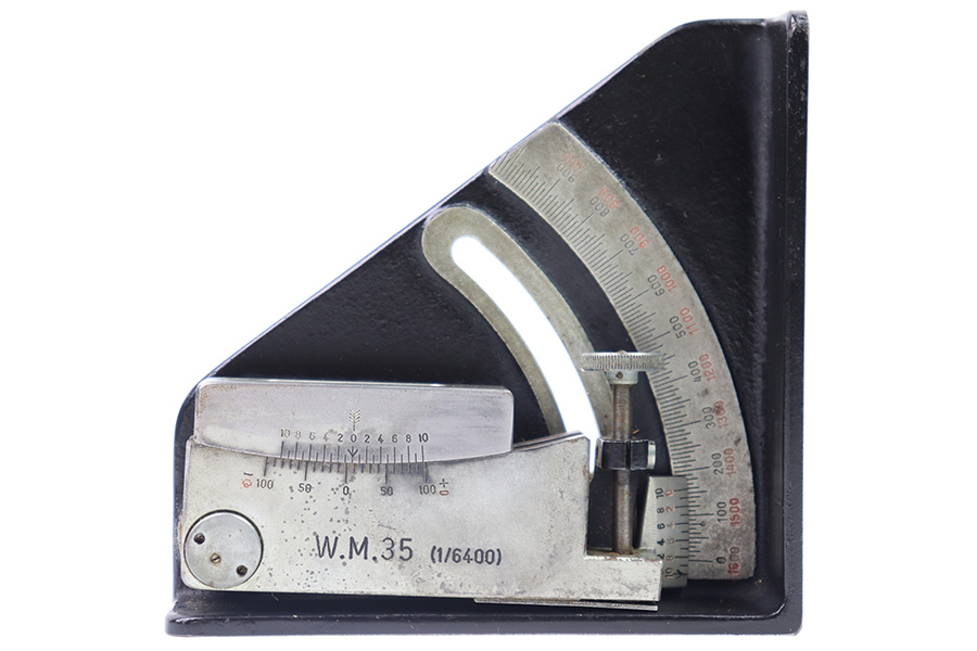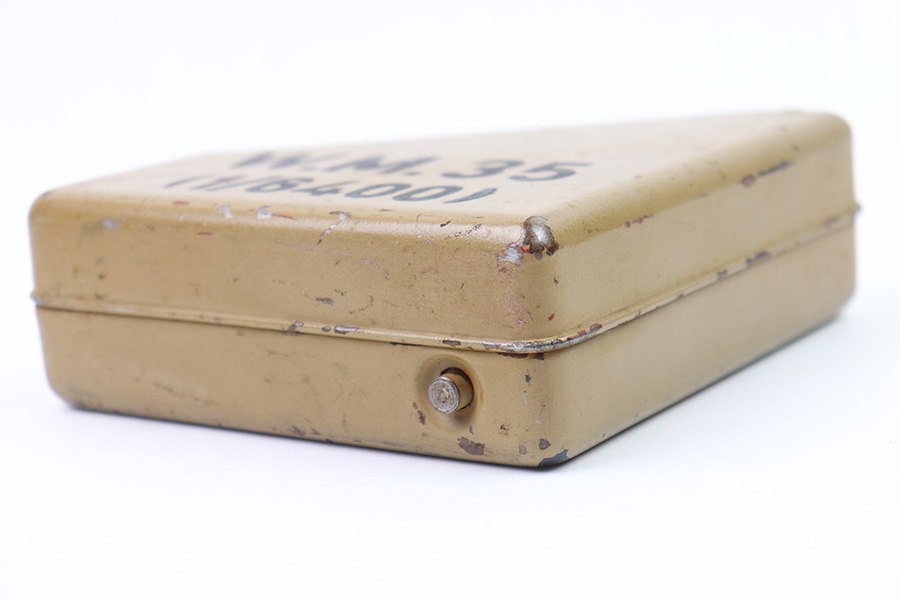 10/5/22 – This is an original German Anti-Aircraft Gunner Chinometer sighting device. The chinometer comes with the original metal case and adjustment tool, as shown. The chinometer and case are both marked “W.M. 35”, which stands for “Winkelmesser 35”. The chinometer is also marked with a maker code “bvu” and a blue triangle, which indicates the grease has been conditioned for cold climates. The device is fully functional with no major issues or notable flaws. The case shows some mild edge wear and signs of aging but no dents and clean paint throughout.