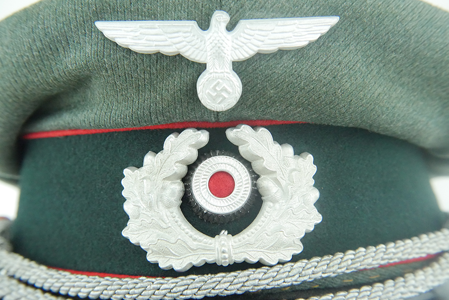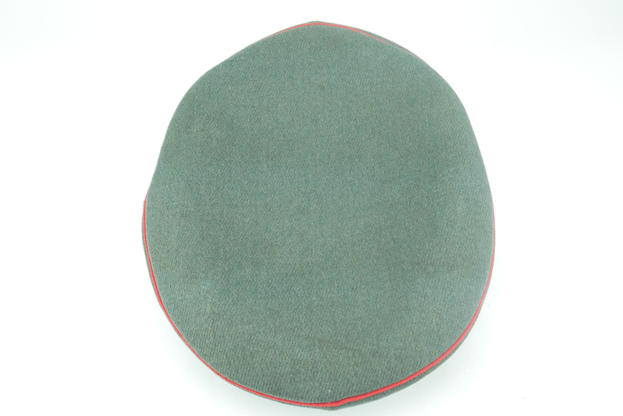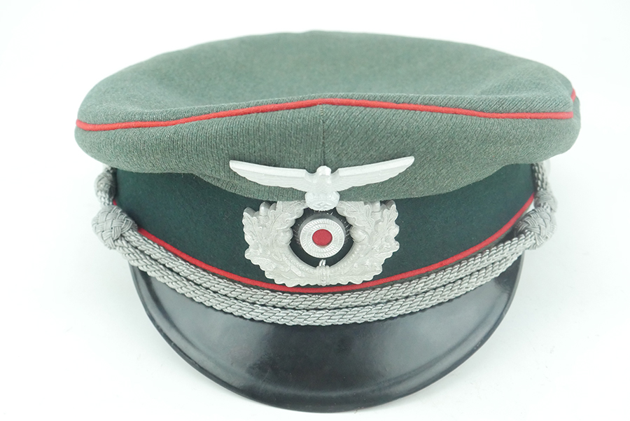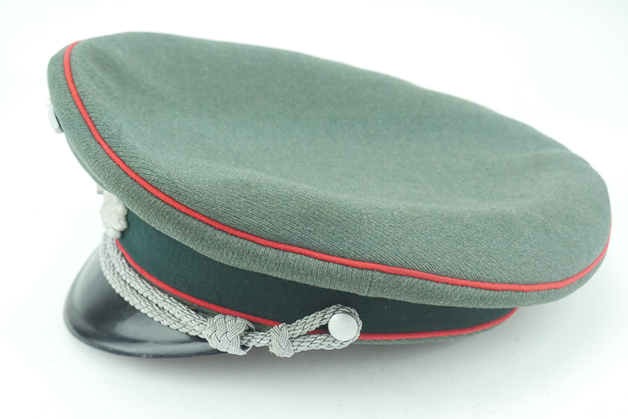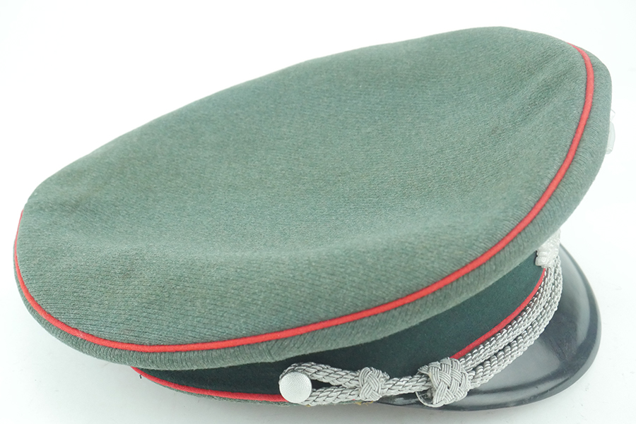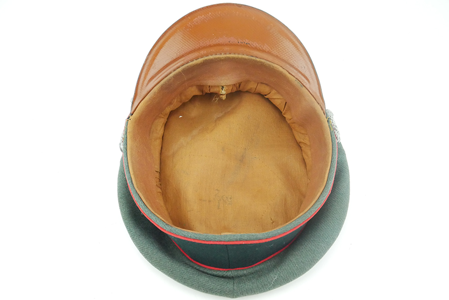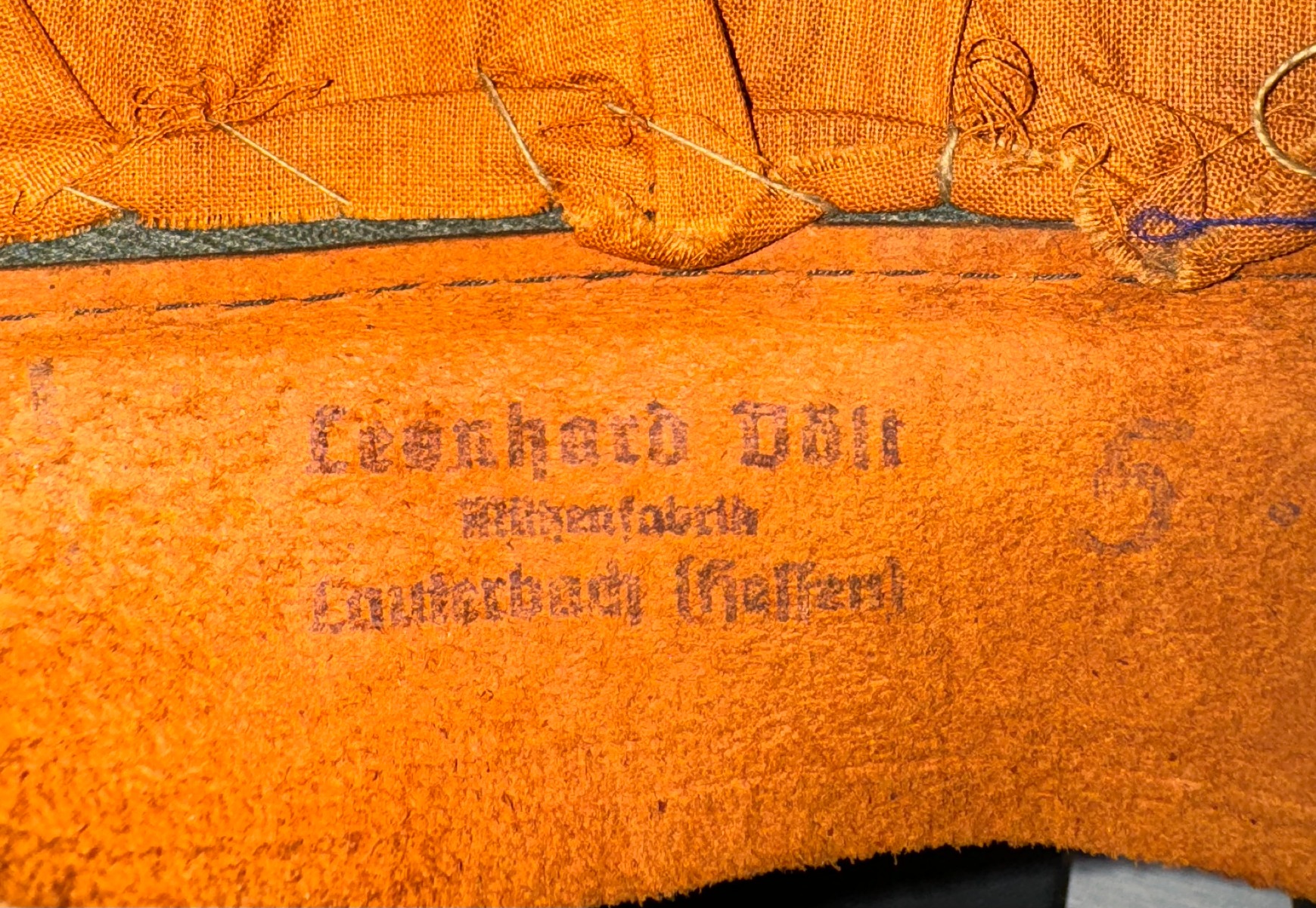 9/12/24 – This is a WW2 German army artillery officer’s visor cap made by Leonhard Dull. The cap is in great condition with no visible moth damage. The visor cap still has it’s leather sweatband intact. The silver cord remains in great condition without any fraying. The makers mark is inside the sweatband of the visor cap, and is still legible. The sizing stamp still remains, this visor cap being a size 58 1/2.