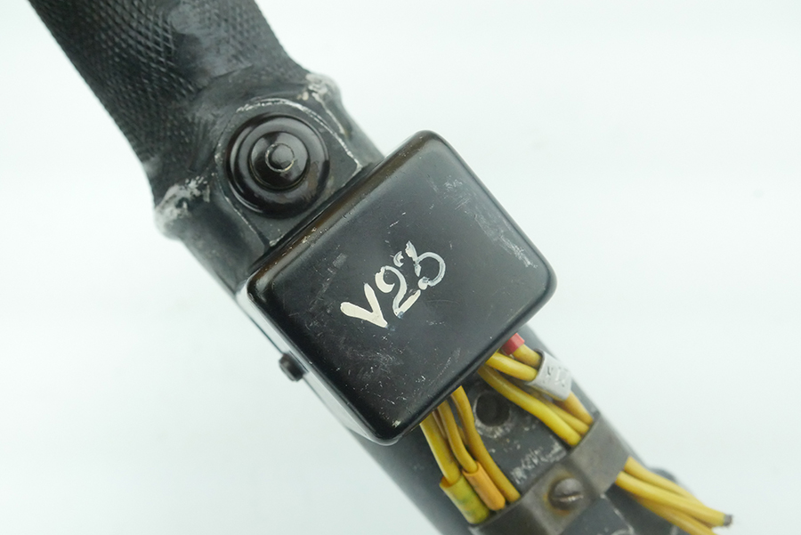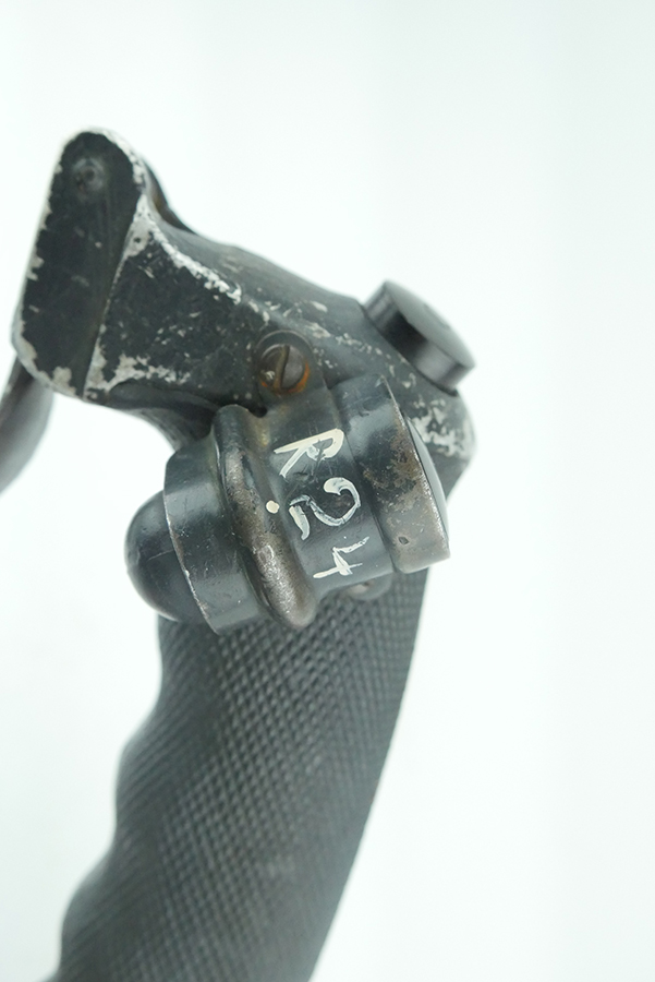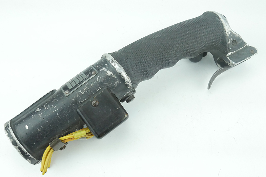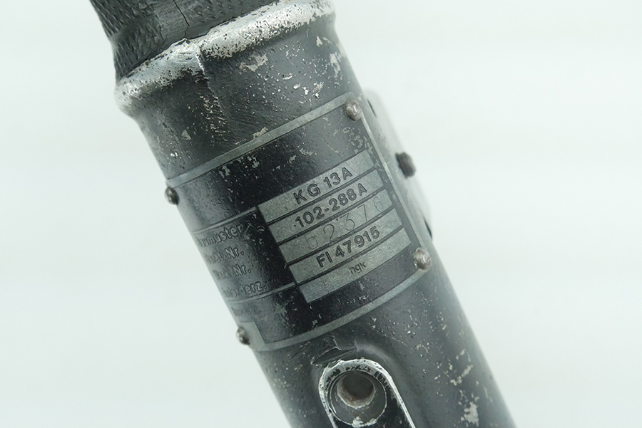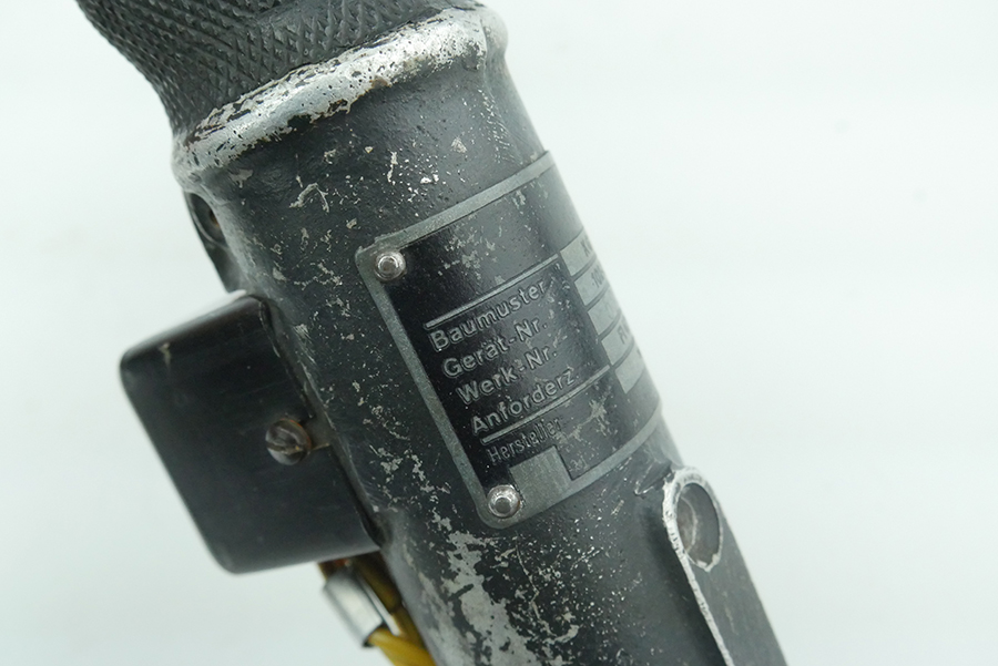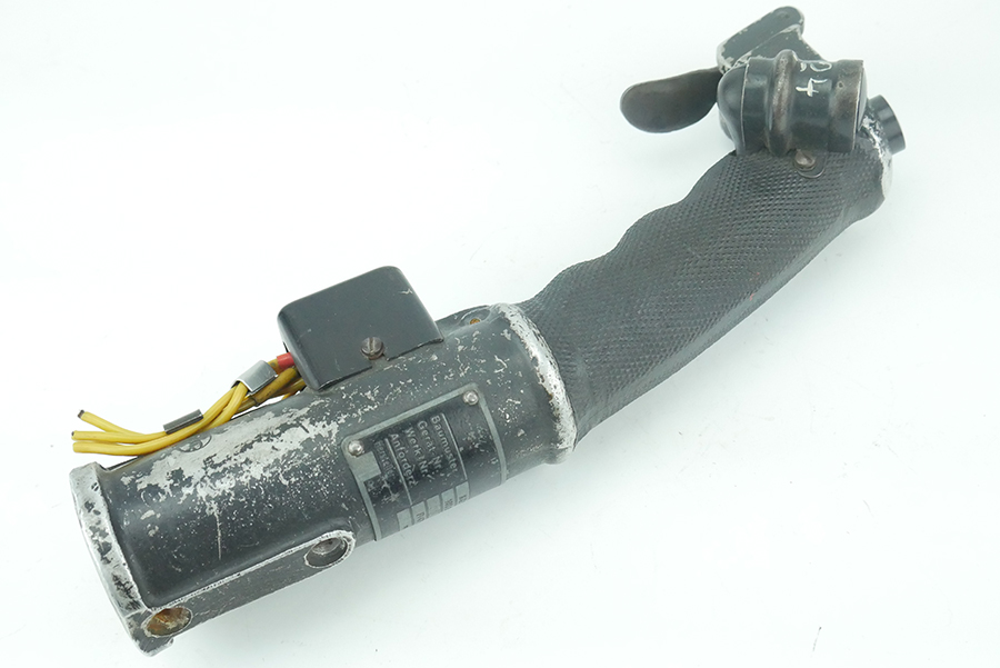9/12/24 – This is a great example of an original WW2 Messerschmitt Bf-109 control stick. The Bf-109 was one of the backbone aircraft of the German Luftwaffe in WW2. The Bf-109 was in service from the late 1939 all the way till the end of the war, and was one of the most advanced and feared fighter aircraft of it’s generation. The Bf-109 was flown by the top German ace of WW2, Erich Hartmann, who was credited with 352 victories. This control stick’s buttons all are capable of being operated and have not seized up. The spring for the machine gun/cannon trigger is still strong. The data plate is still present on this stick and is marked with the following ” Baumuster KG 13A, Gerat-Nr 102-228A, Werk-Nr. 52376, Anforderz FI 47915, Hersteller ngk” . The stick still maintains almost all of its original black paint finish, but does have areas where this paint is missing and chipped away.