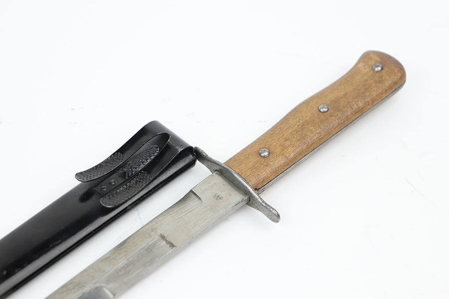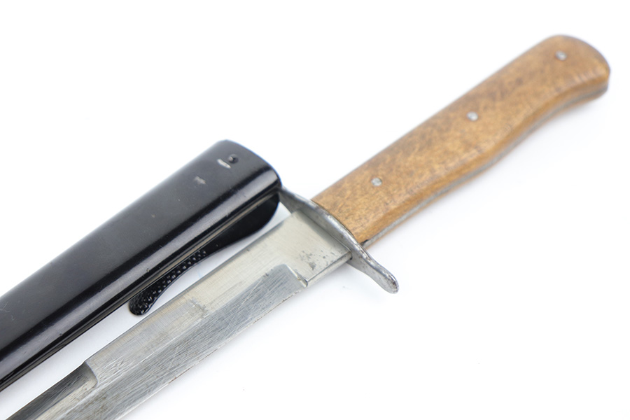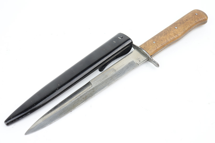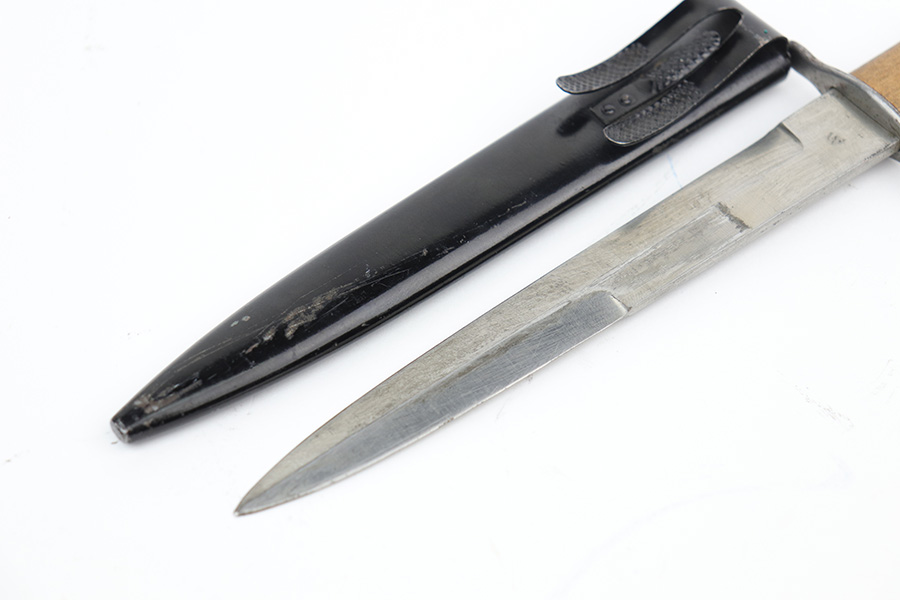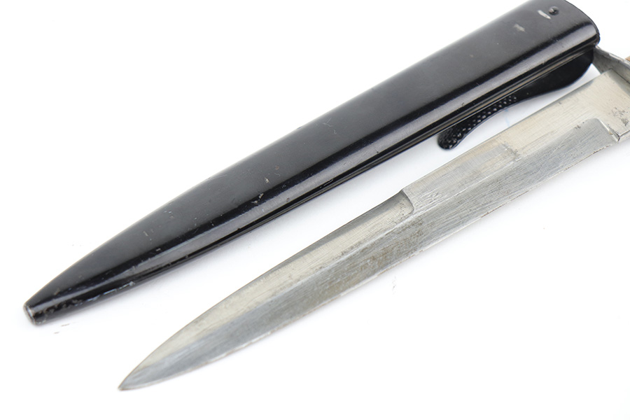 10/18/21 – This is a very nice example of a German boot knife. These boot knives were used by the Germans during WW1 and WW2. This example is somewhat odd, as it’s stamped with a “W” on one side, with no other markings. Most examples we’ve seen are either imperial proof stamped or Luftwaffe stamped. This one is neither, so we reduced the price accordingly. Very nice condition throughout with minimal wear.