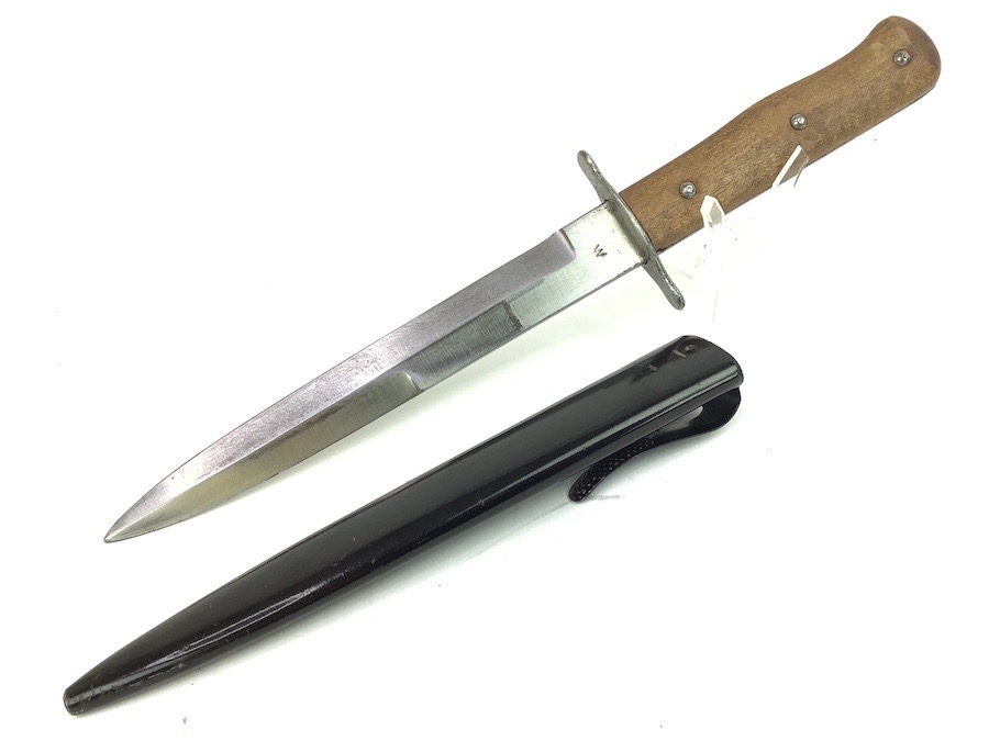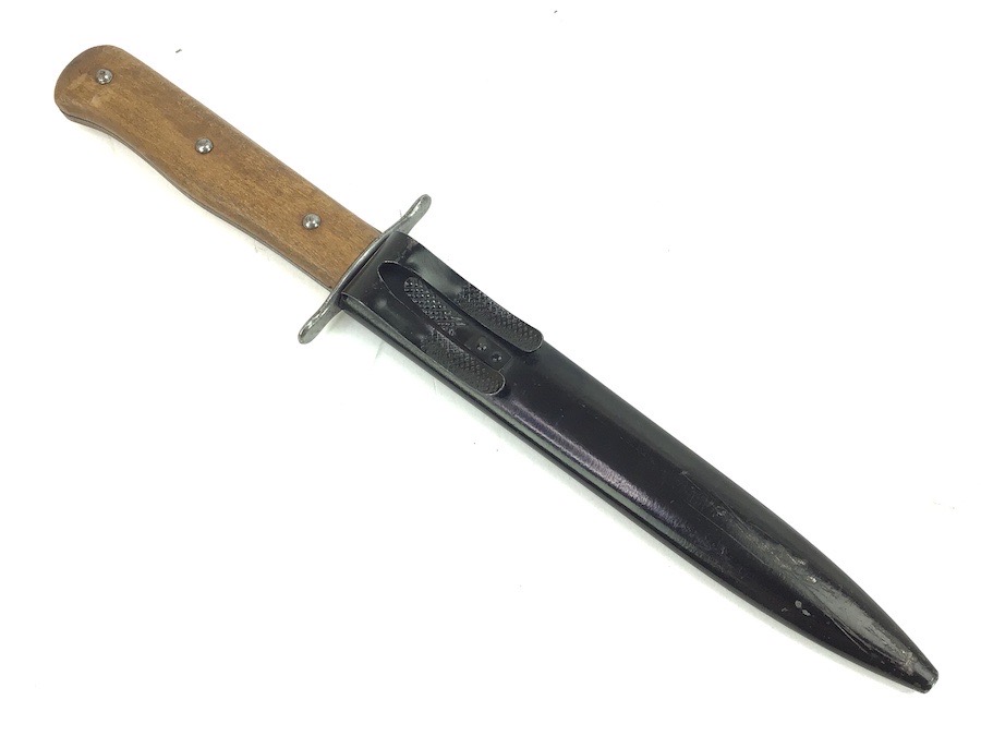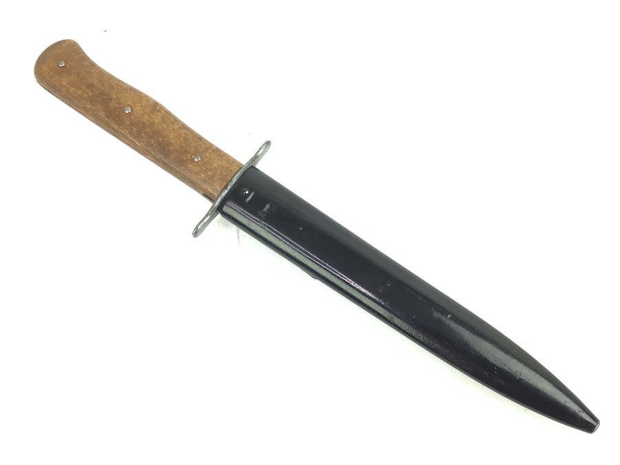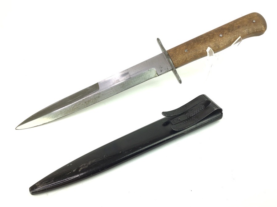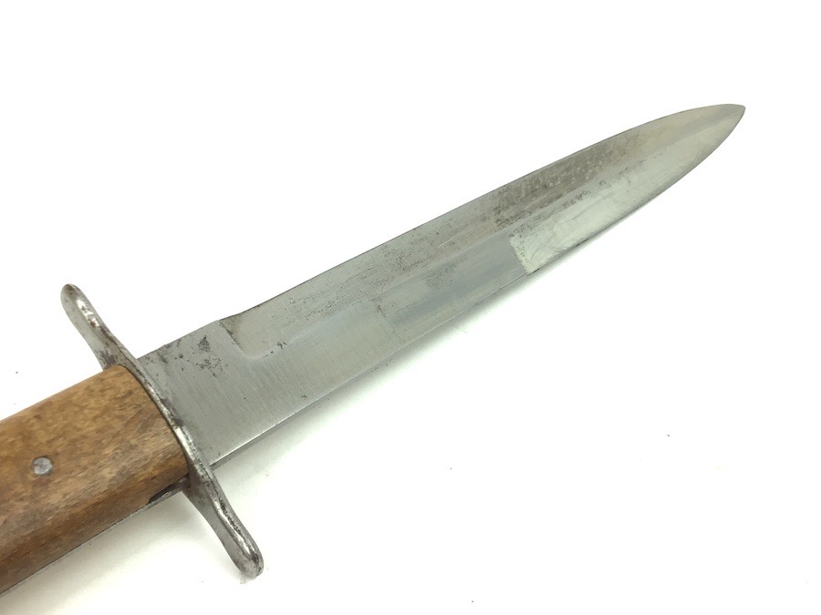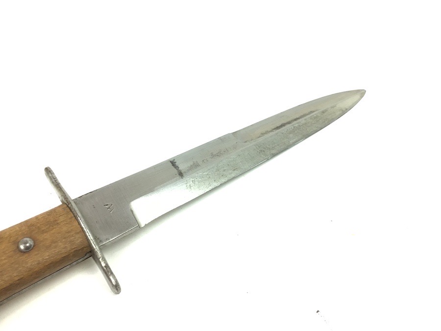 8/27/24 – This is a very nice example of a German boot knife. These boot knives were used by the Germans during WW1 and WW2. This example is somewhat odd, as it’s stamped with a “W” on one side, with no other markings. Most examples we’ve seen are either imperial proof stamped or Luftwaffe stamped. This one is neither, so we reduced the price accordingly. Very nice condition throughout with minimal wear.