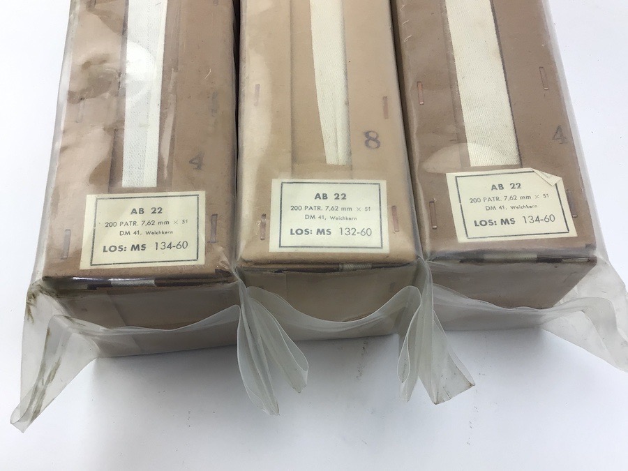 5/1/23 – Price is for one, 200 round field crate. Sealed 200 round German 7.62 x 51mm NATO Battle Packs. Label is marked AB 22 200 PATR DM 41 Weichkern LOS: MS 134-60.