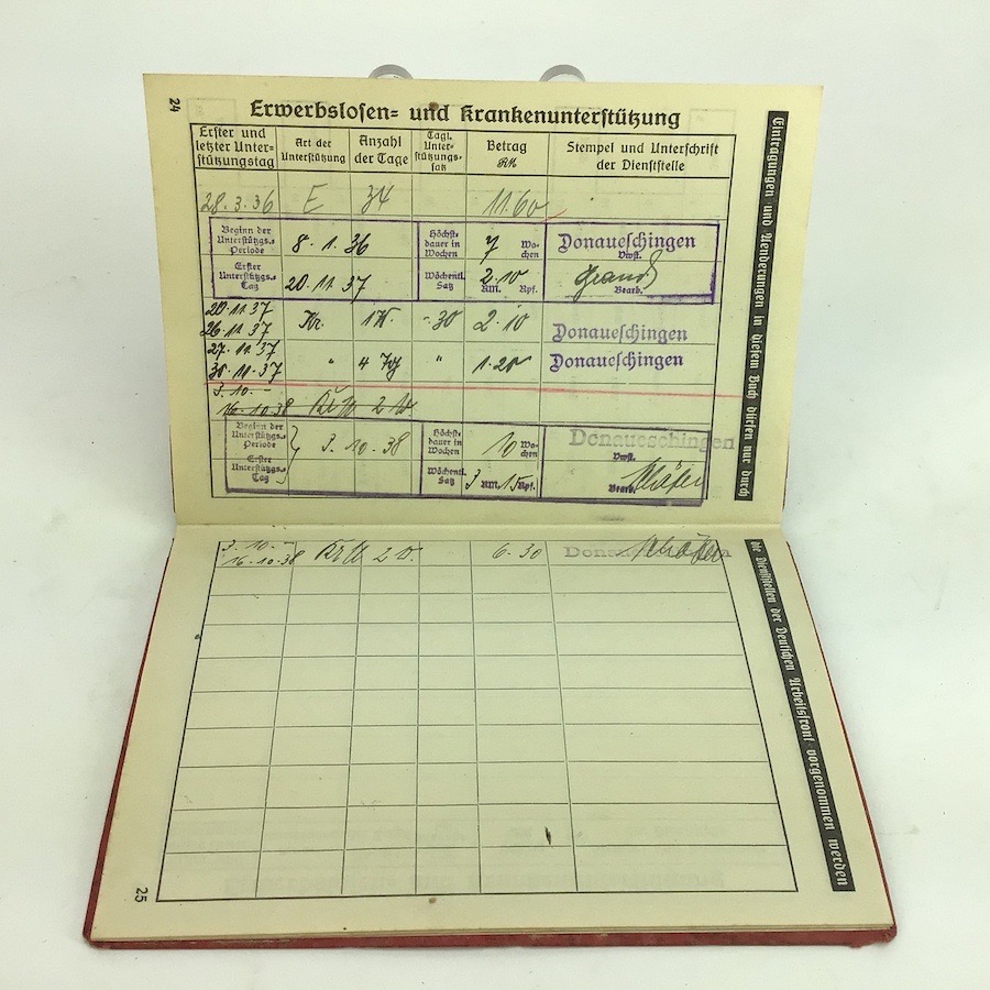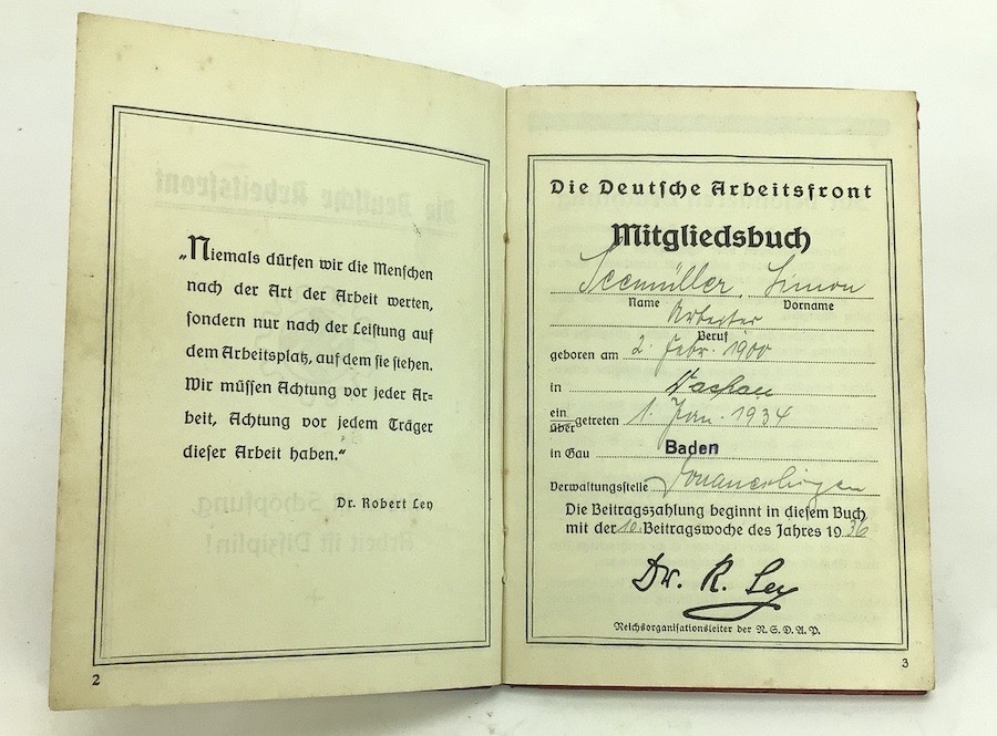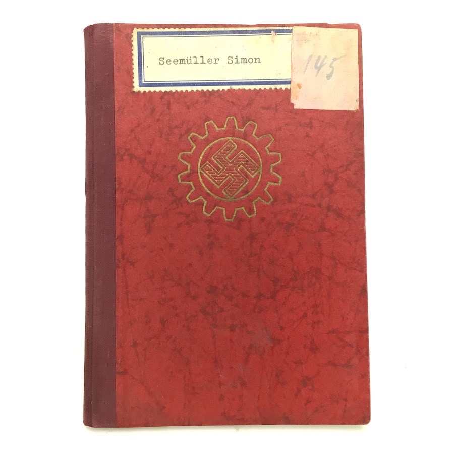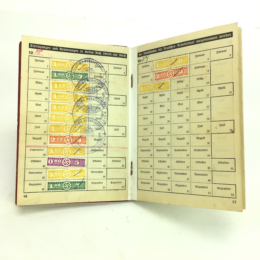4/30/24 – Authentic and great condition, German WWII Labor Front Membership booklet. Measuring approximately 4” x 6”, this red booklet bears the symbol of the D.A.F. showing the infamous swastika within a gear. The booklet lists the union member’s name, birth date, city of birth and date of initial membership. Several pages have various stamps documents, emitting their work.