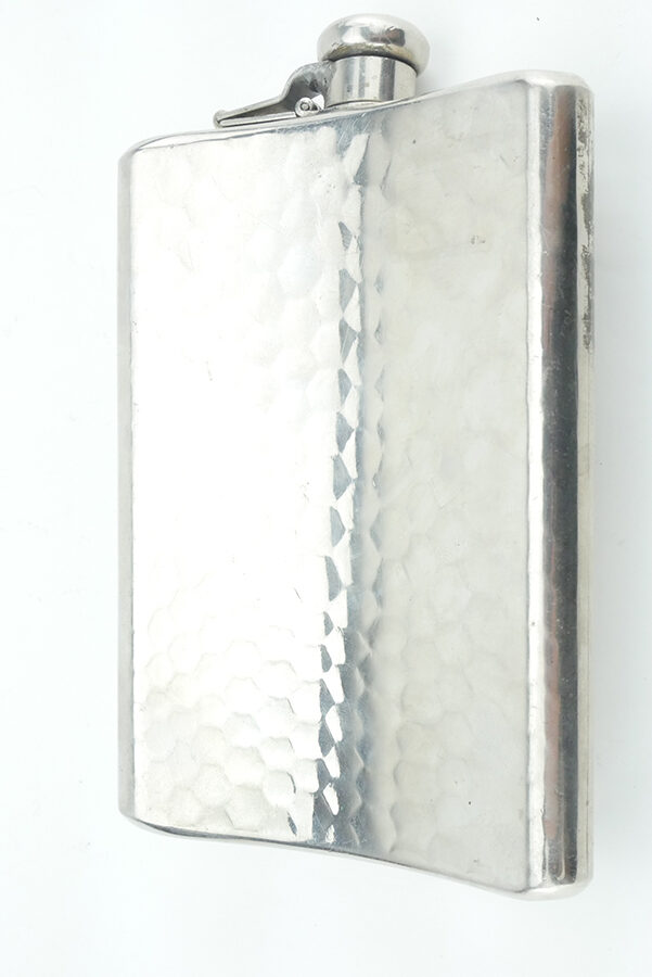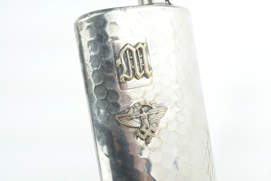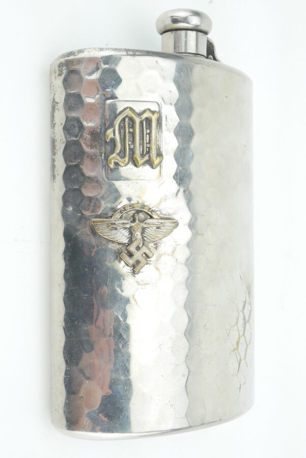 8/20/24 – This is a hammered, nickel-plated hip flask made in Germany in about the 1940’s. It has a pull (non-screw) top. The front of the flask has been embellished with a letter “M” and a Nazi NSFK insignia. The NSFK was the National Socialist Flyers Corps and conducted military aviation training in gliders and private airplanes. The flask is in very nice condition overall.