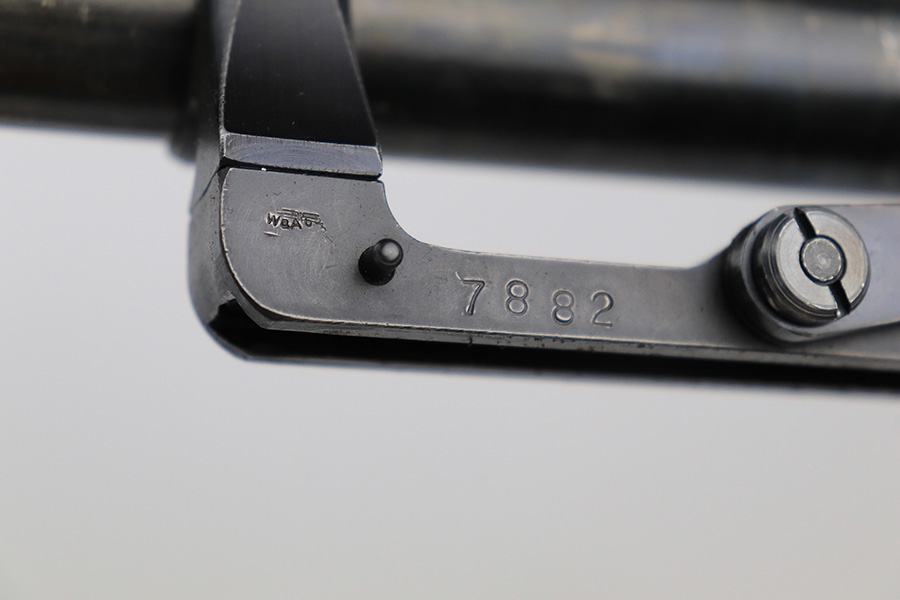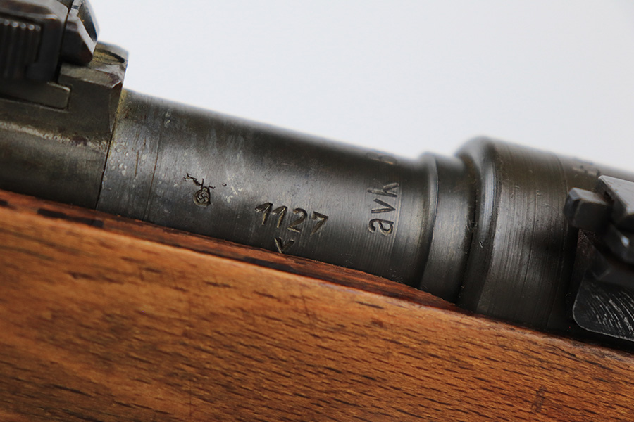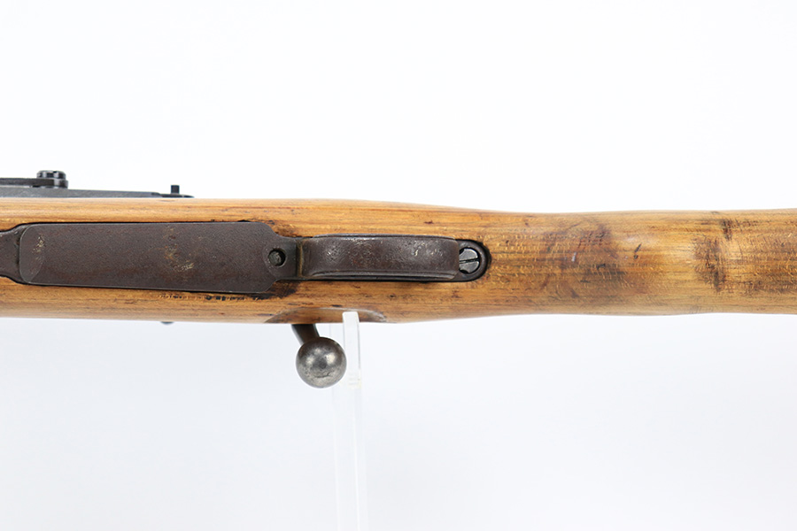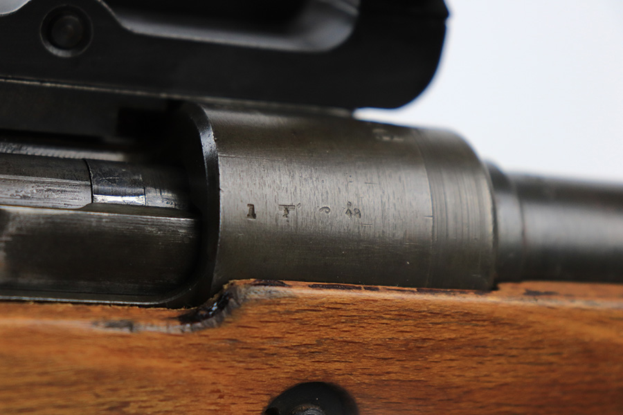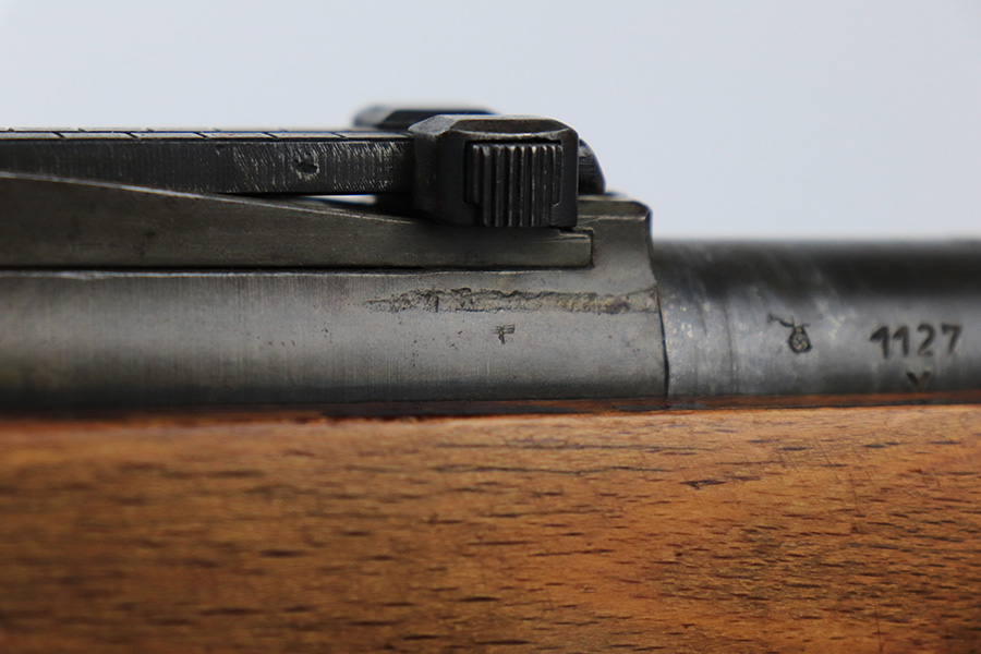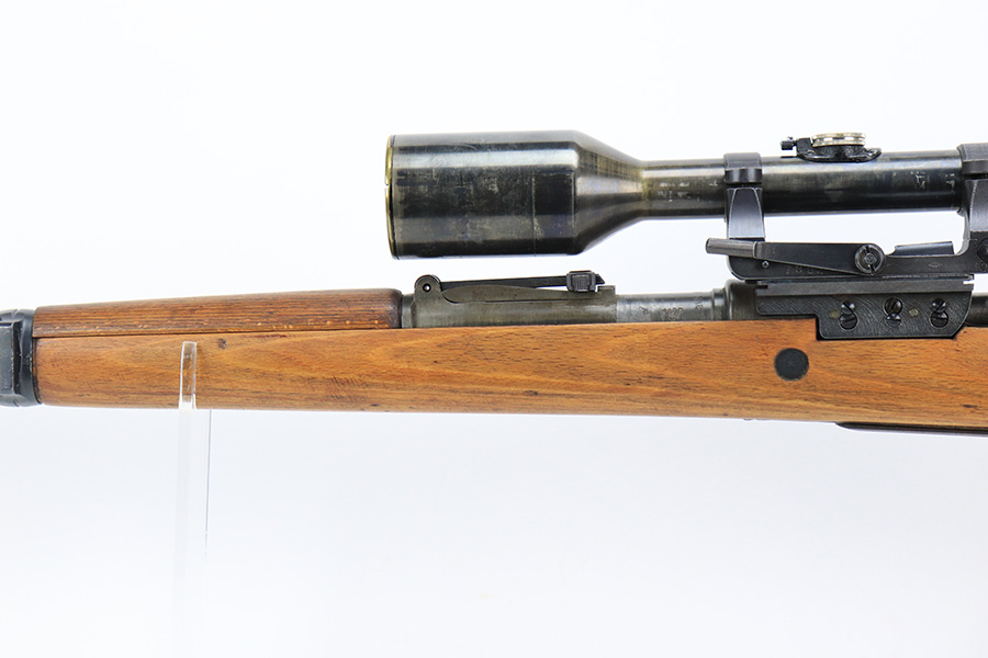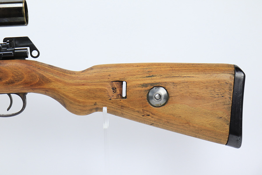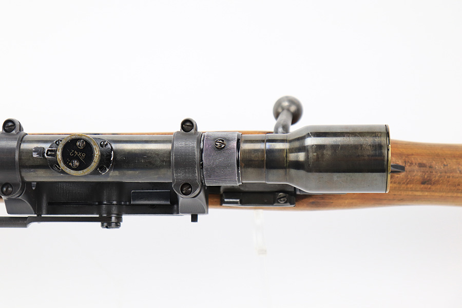 7/14/23 – This is a cool Gustloff Werke K98 that was built into a long side rail style sniper rifle. The base rifle/receiver has an excellent, original phosphate finish. The bands are refinished, as is the trigger housing/floorplate. The rifle has a vintage commercial scope that is marked 8×42 and has clear optics. The stock is in great shape with waffenamt on right face, but was lightly sanded at some point.