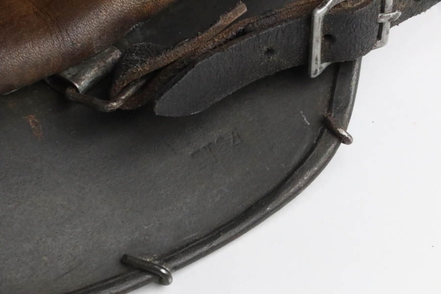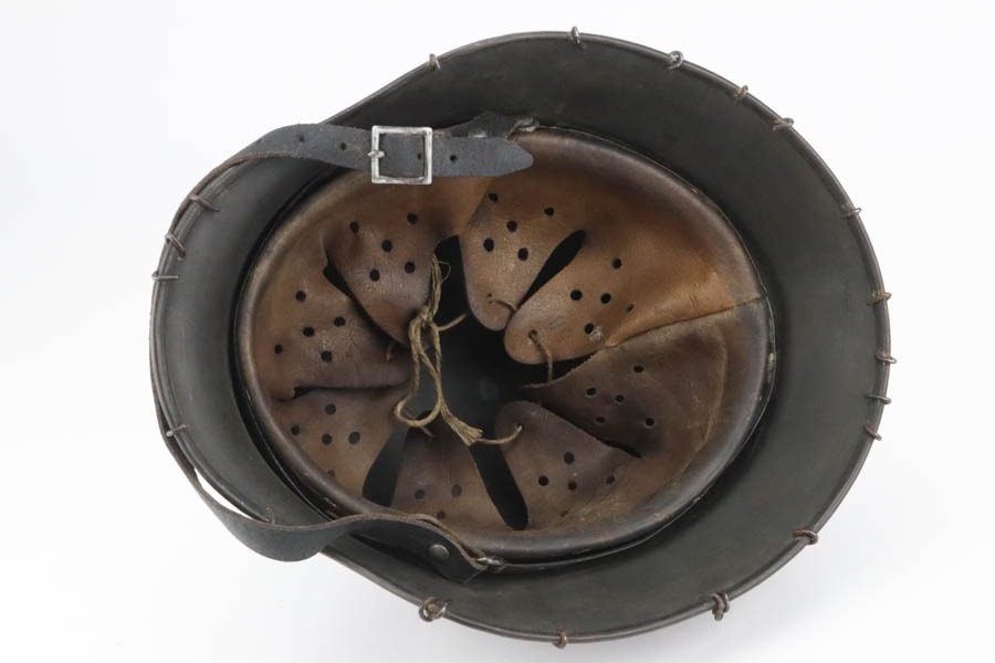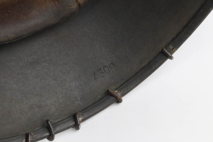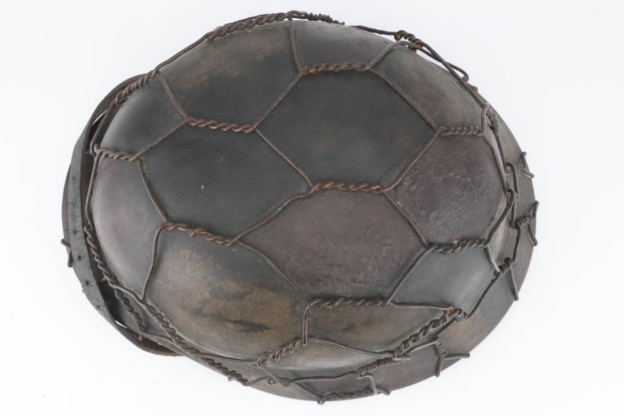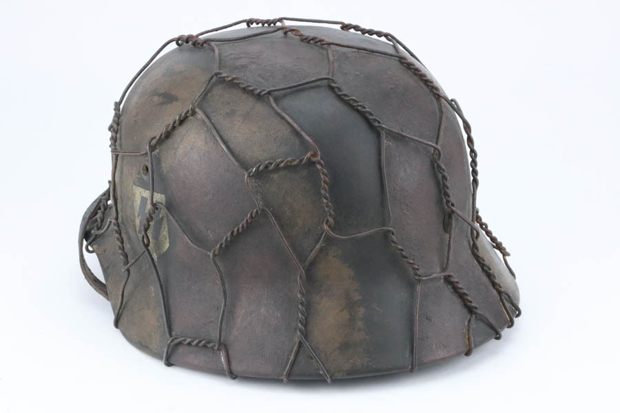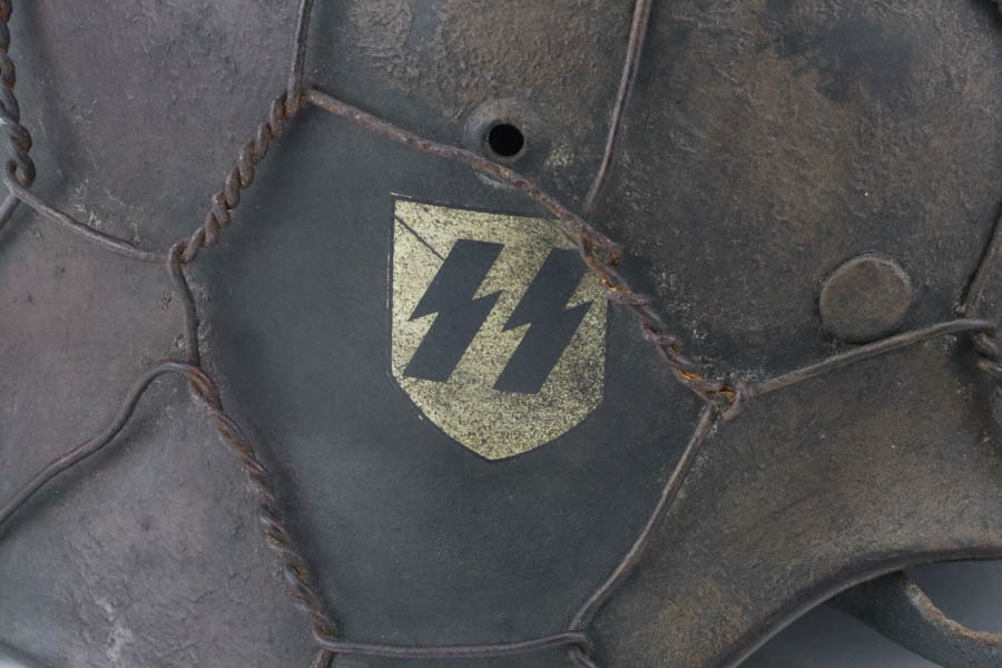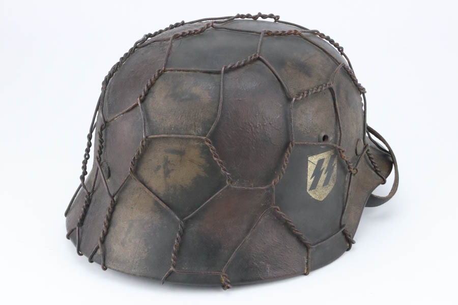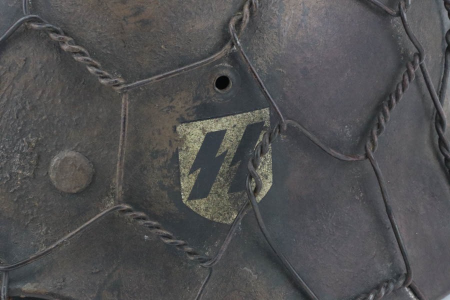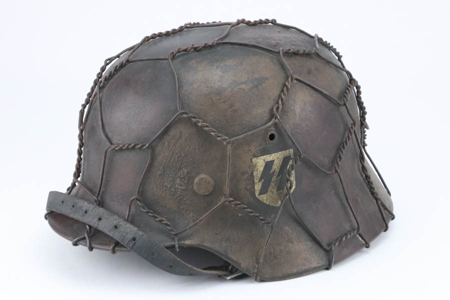10/31/24 – This is a great example of a WW2, M35 German helmet made by Eisenhüttenwerk Thale. This helmet is in great overall condition with no major dents or damage to the helmet shell. This helmet also maintains it’s original leather interior, the leather is still intact and pliable. This helmet has been embellished with reproduction SS runes on both sides of the helmet. To our knowledge and research, there were never double SS decal helmets. Additionally this helmet was examined by an industry leader in SS helmet authentication and he concluded the same results as we did. This helmet is also embellished with what we believe to be a reproduction “Chicken Wire” outer wrap. This style of outer wrap was something that was done by the Germans during WW2 and allowed the soldier to camouflage his helmet easier. This helmet would make a fantastic piece for any reenactor or as a display piece. This helmet was featured in one of our YouTube videos, that can be viewed HERE.