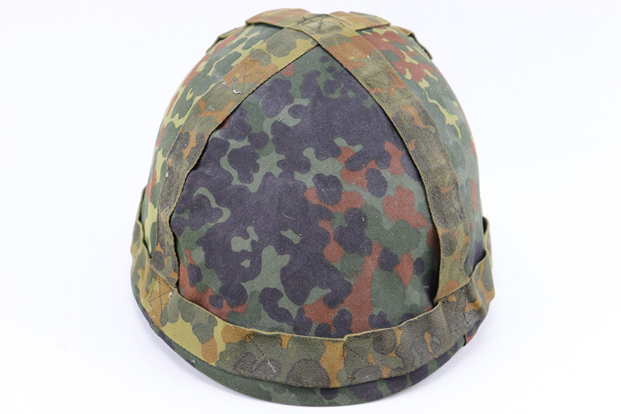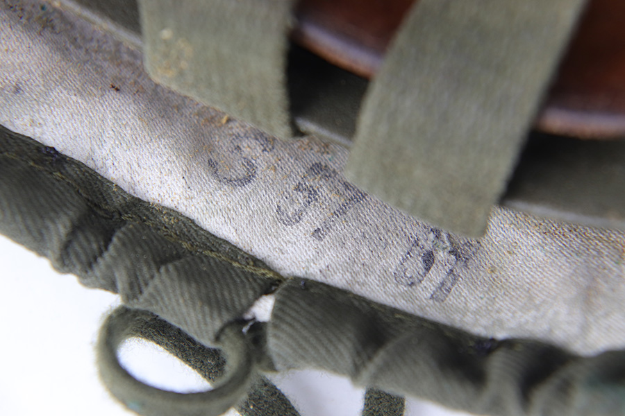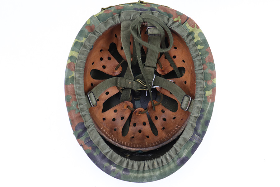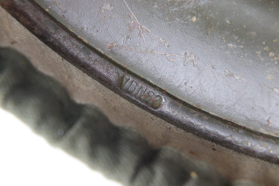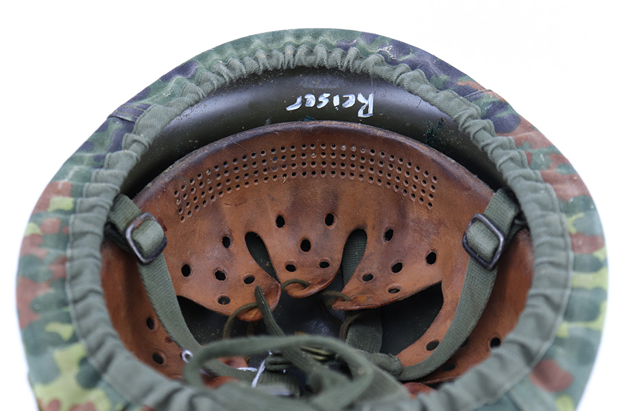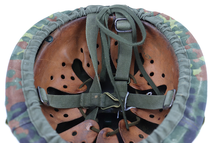 7/18/23 – This is a post WW2 production German M60 steel helmet. Interestingly, the helmet is more like the US M1 style helmet than the other German predecessors. The helmet comes with a camo cloth helmet cover, original leather liner, and canvas chin strap. The camo cover is 1 sided and ink stamped “S 57-61” on the interior. No holes or notable issues and great overall condition. The shell has some mild surface scuffs and typical aging wear but no dents or major issues. The interior shell is stamped on the folded brim “VDN83”, and the interior shell is size marked “55-57”. The leather liner is also ink stamped with the same size stamp. Excellent condition leather with some mild wrinkling and light use wear. No issues with the chin strap either.