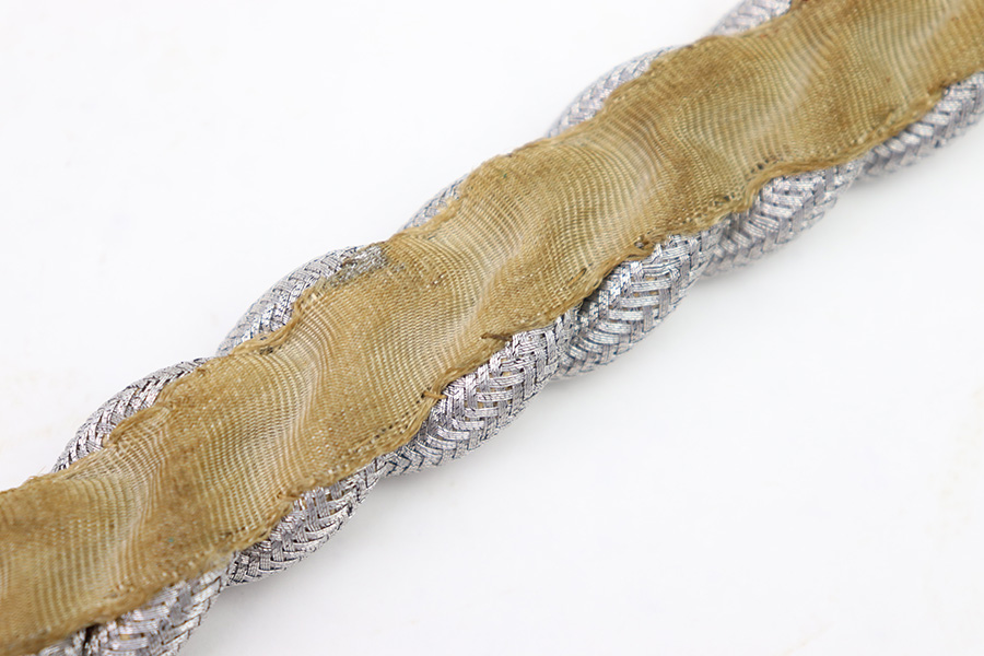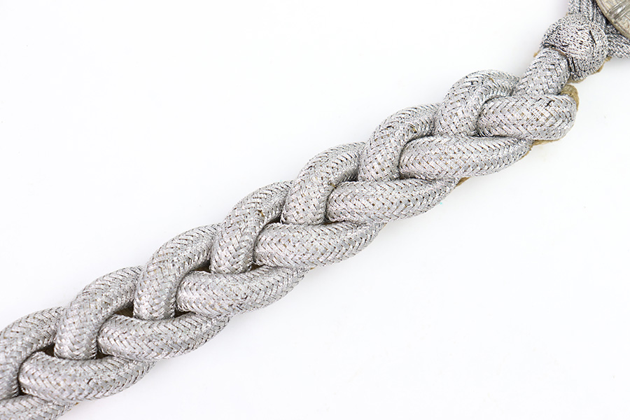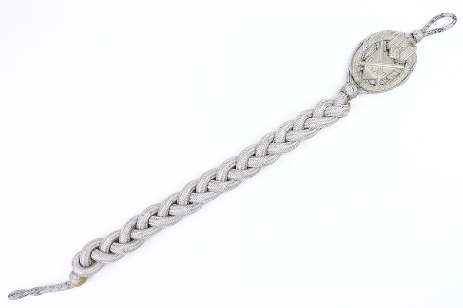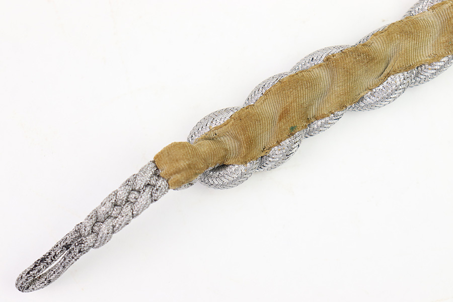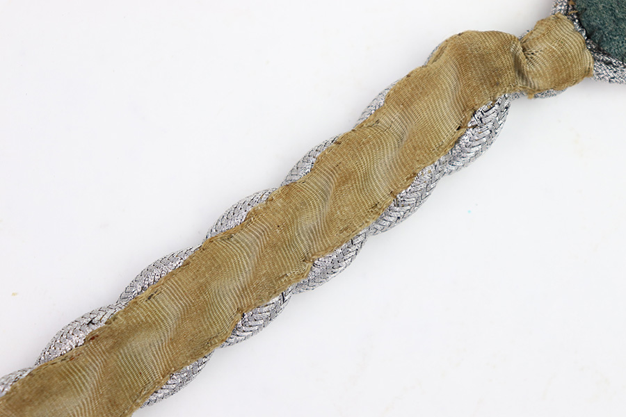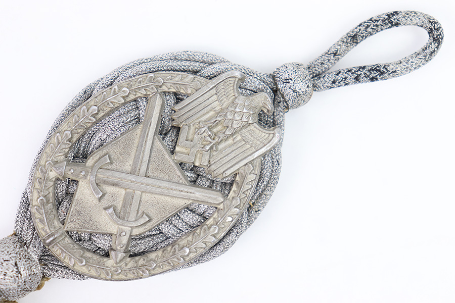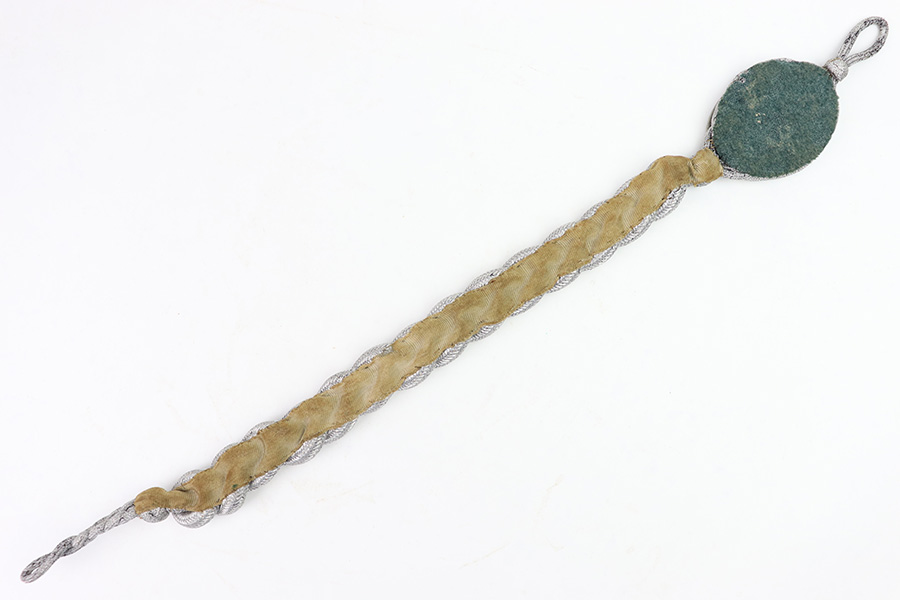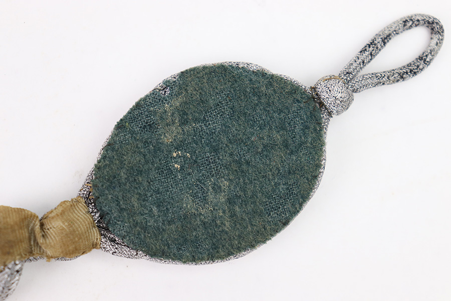 8/10/22 – This is an original German Marksmanship Lanyard / Chord. Grade 1 with silver twisted chord that’s tight and intact. There’s some mild surface darkening and aging, but no major issues, nor any fraying. Cloth backing is intact as well despite being yellowed with age, as shown. There’s some wear on the green backing of the badge but this is mild.