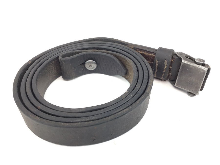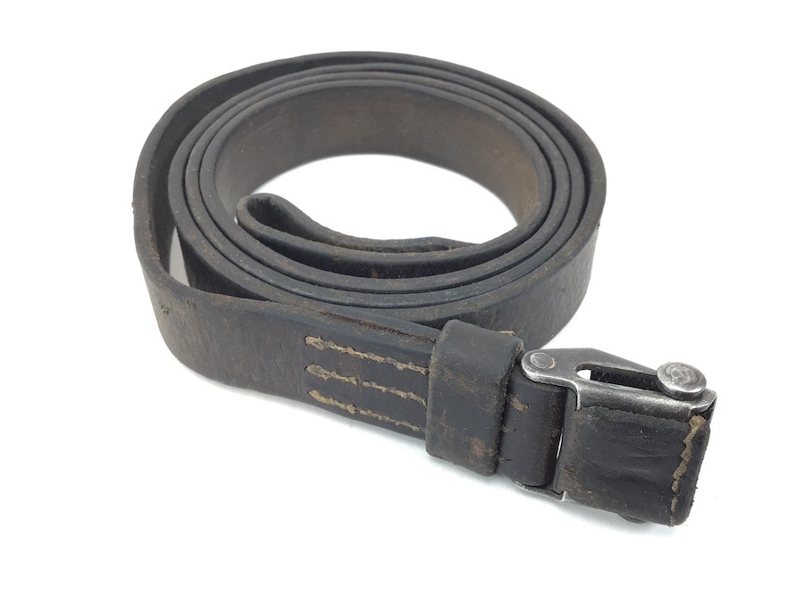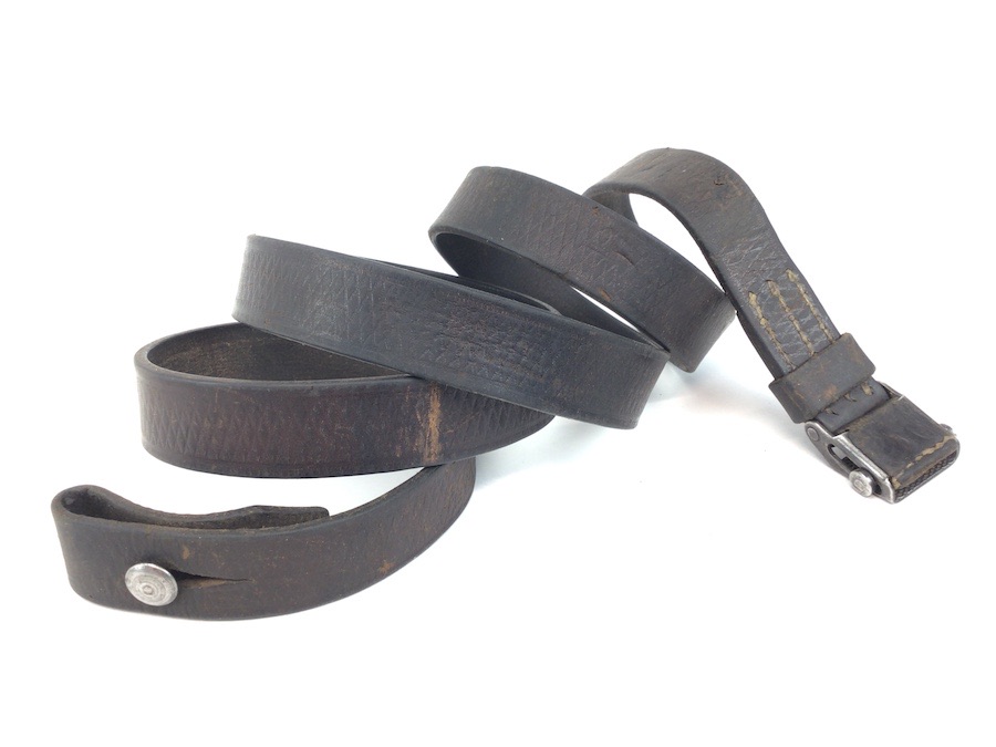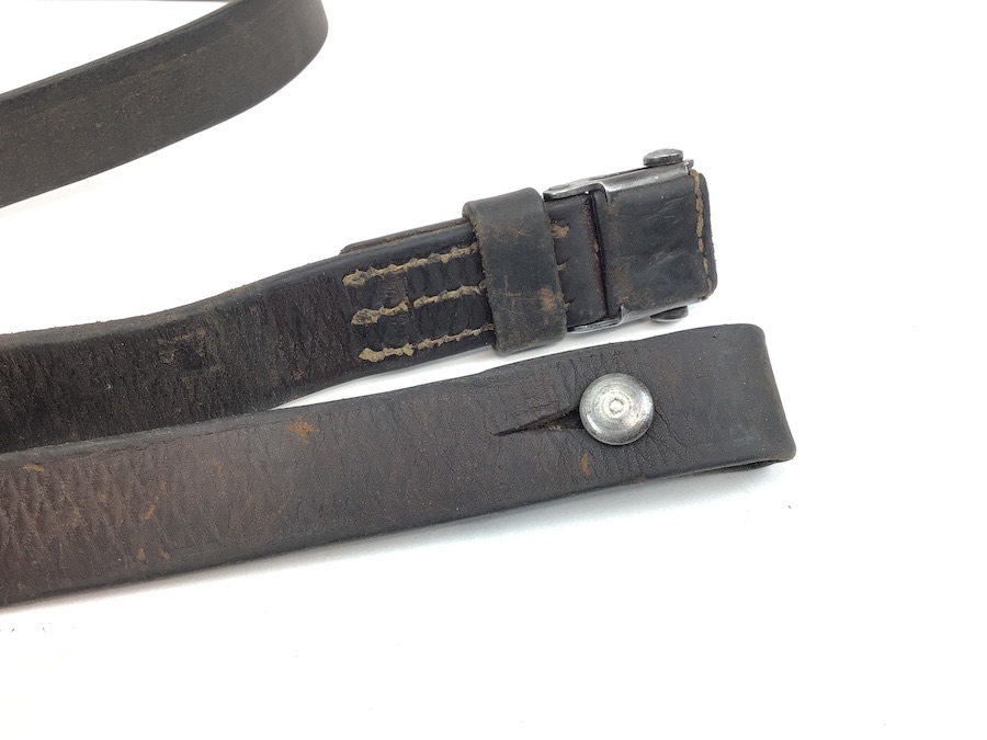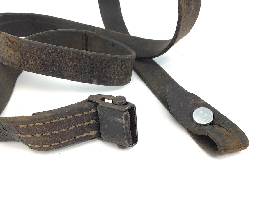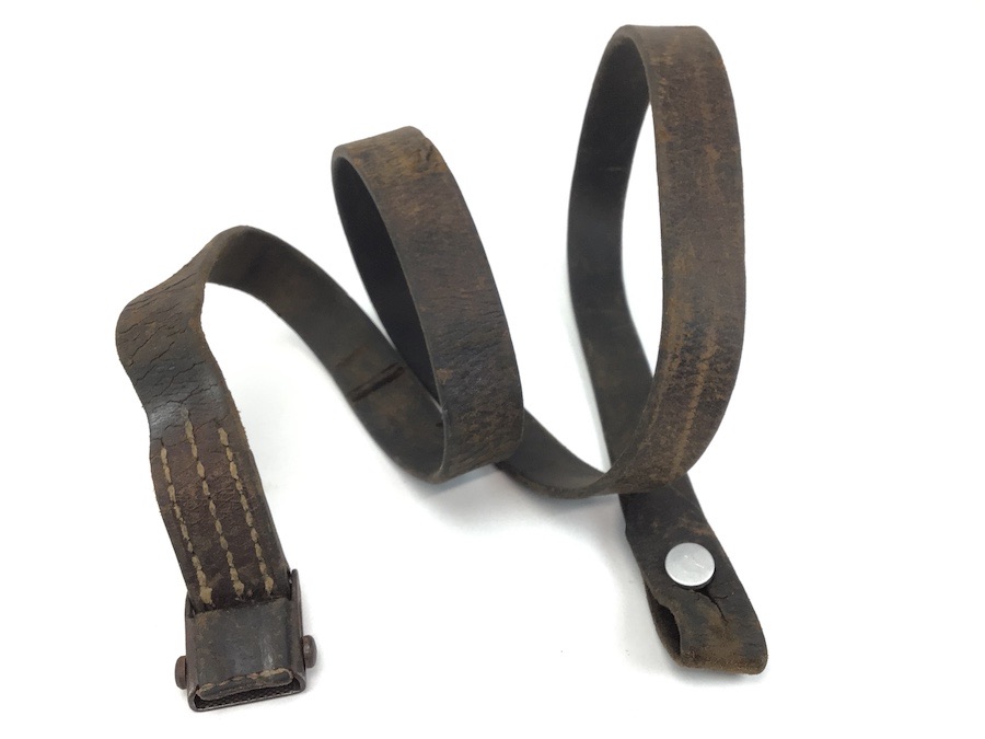 4/28/22 – This is an original German WWII manufactured, leather sling for the MP-38/40 Machine Guns. Comes complete with just TWO holes on one end of the sling with its original steel “collar button” in place. Stitching is intact and secure.