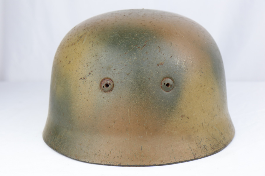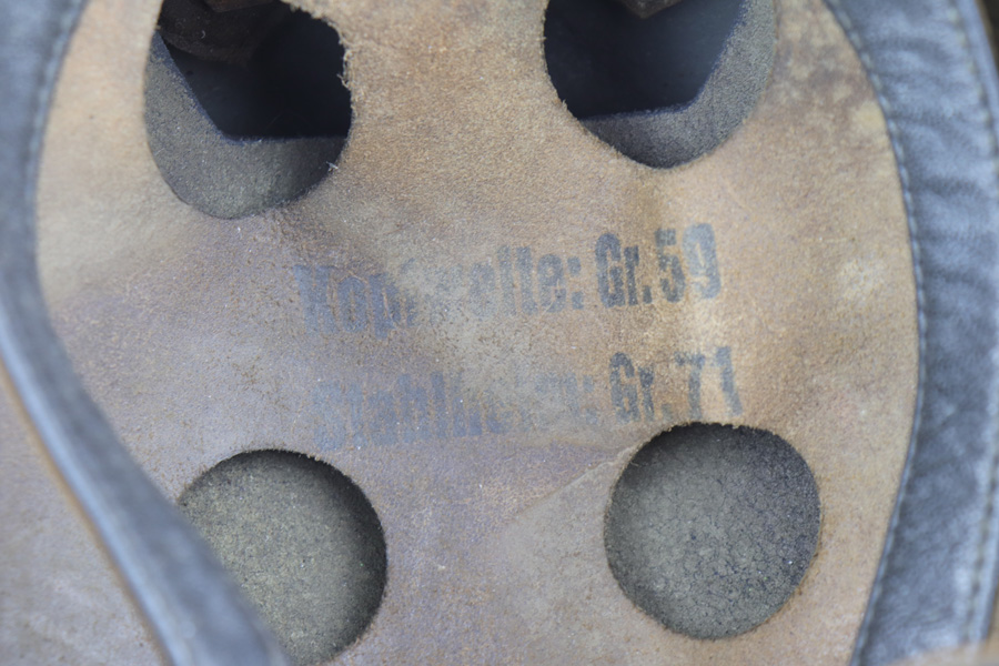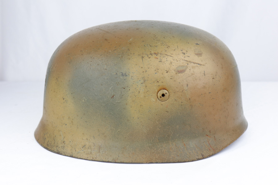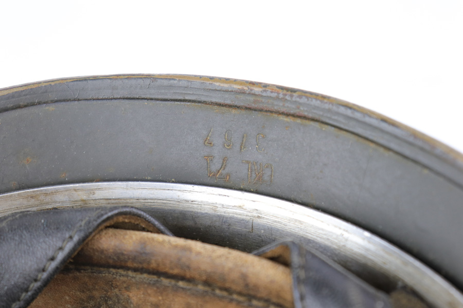 8/4/20 – This is a very high quality “museum copy” reproduction German Luftwaffe / Paratrooper Helmet. Known as the Fallschirmjager helmet in German. This helmet has a camo exterior that looks aged and lightly worn, but excellent. There are no dents or issues. The interior is size “71” and “CKL” maker stamped with a serial number. The interior leather and chinstrap is excellent with a nice aged look. See photos – the interior leather is ink stamped with similar sizing information “71”. See photos. Priced as a very high quality reproduction, or “place holder” not original from WW2.
