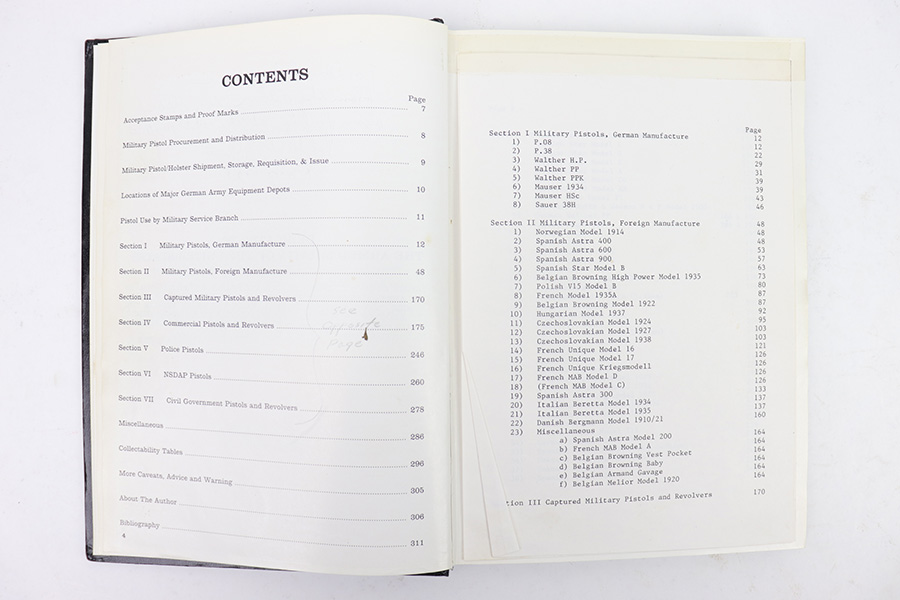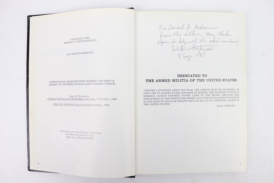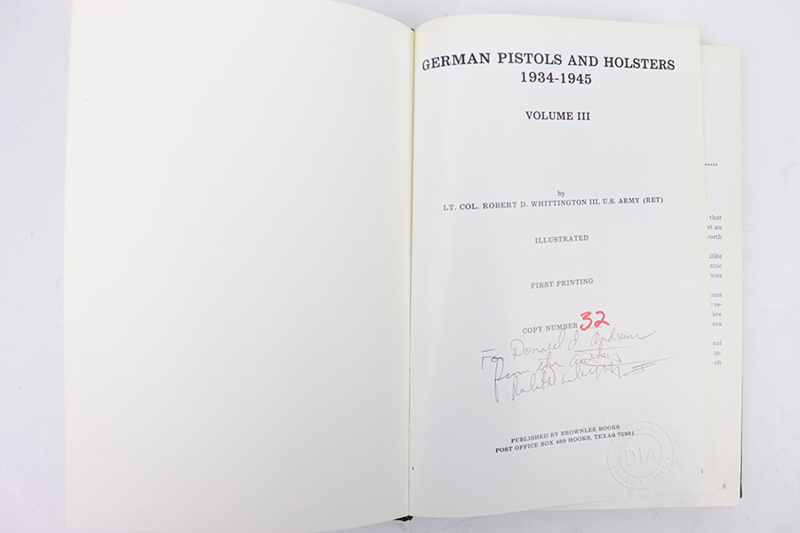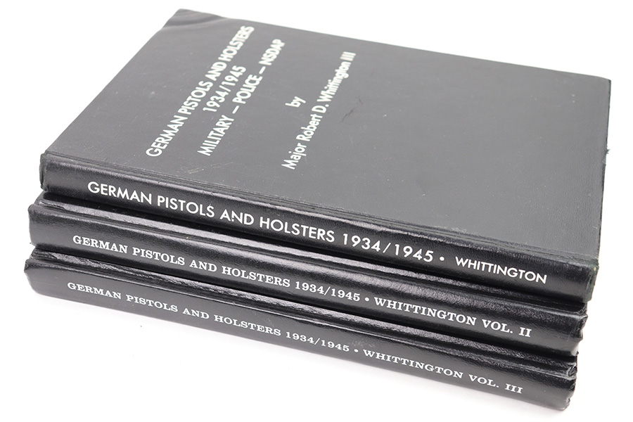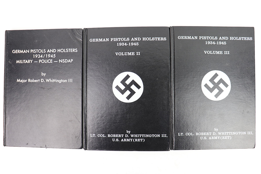 2/28/23 – These are Volumes 1-3 of Robert D. Whittington’s resource books, “German Pistols and Holsters 1934/1945”. The hardcover books are in good overall condition, although there is some wear and damage on the corners as shown. Volume 1 showing the most damage. The first Volume is numbered out of the first 2000 printed, and the other two Volumes are signed by the author and numbered. All pages are intact and in great condition despite some mild yellowing and aging.