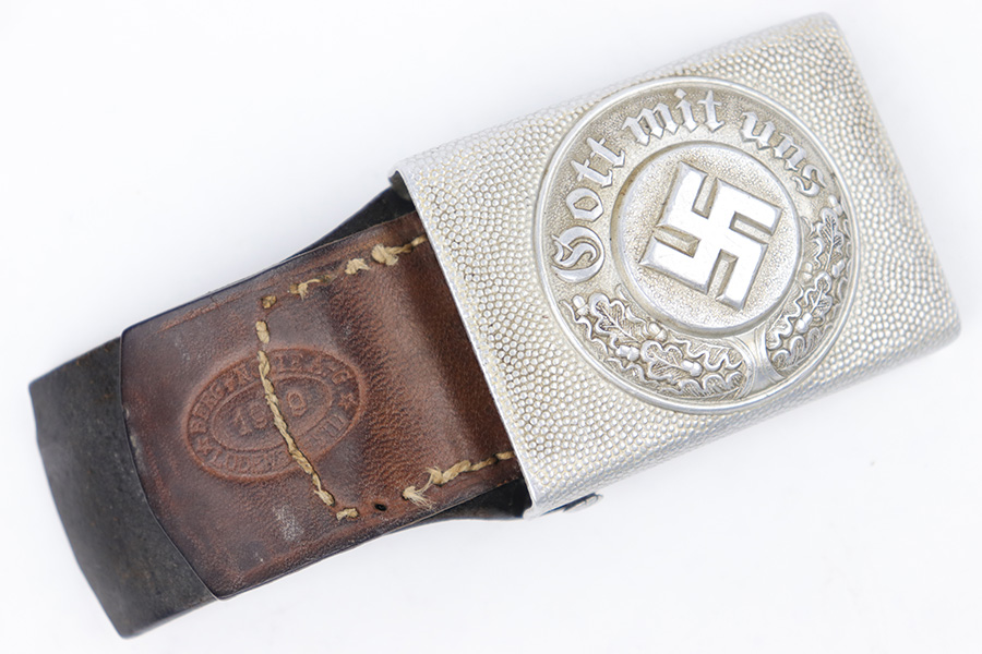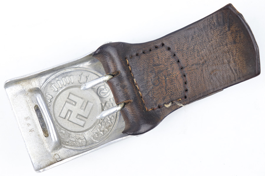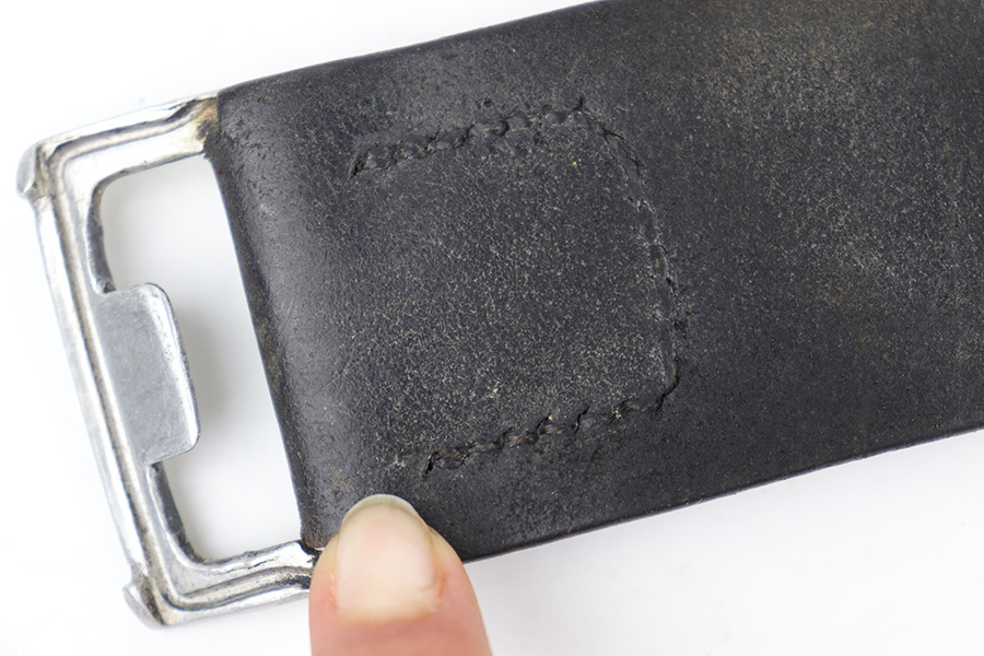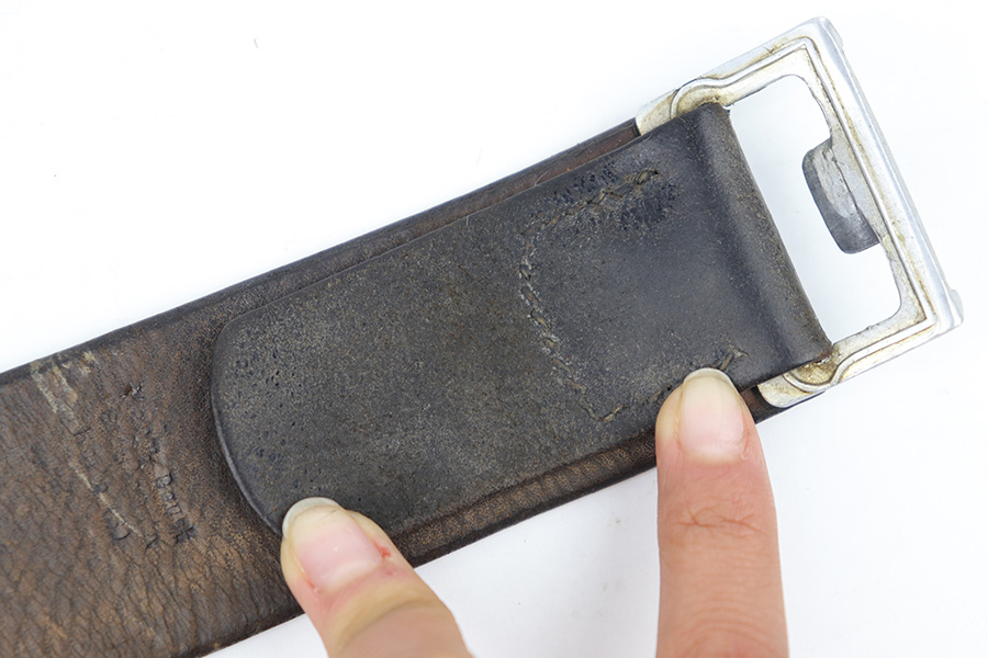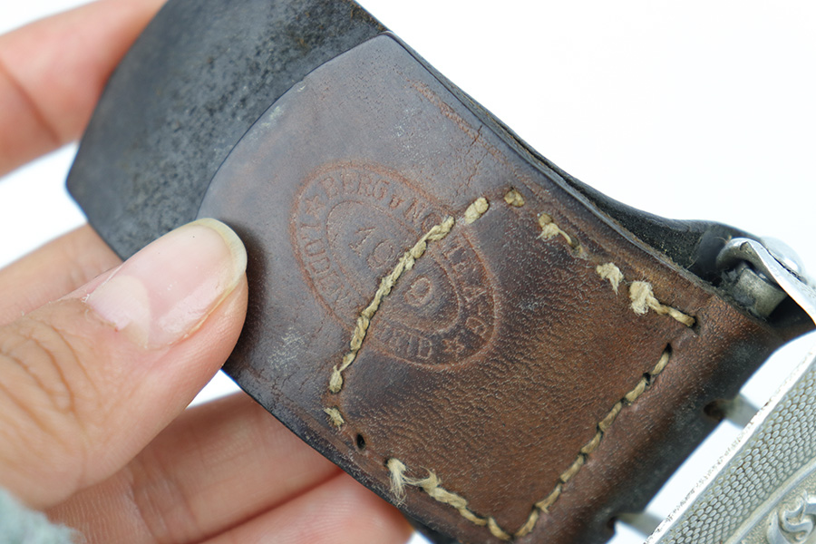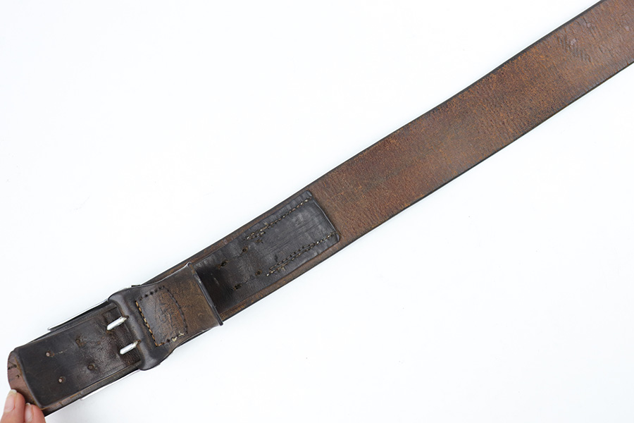 3/27/23 – This is an original WW2 German Police belt and buckle. The buckle is aluminum with typical surface patina throughout and natural aging wear with no excessive damage. Maker stamped on the interior of the buckle. The attached leather tab is maker stamped with a 1939 date. The leather belt is in very good overall condition with nice leather that has no cracking or major issues and mild surface wear throughout. The size-adjustment leather tab has been re-stitched to the belt, but otherwise the stitching is original.