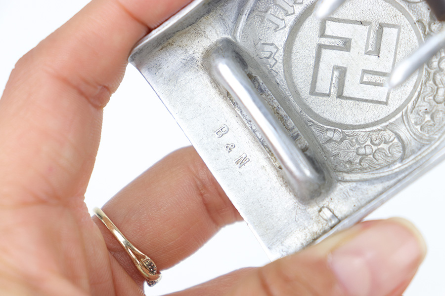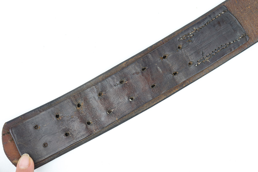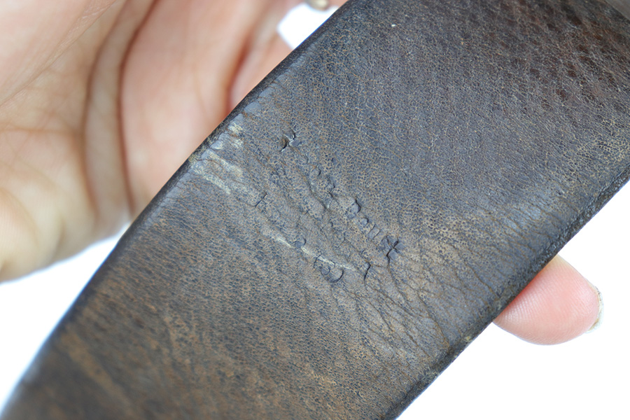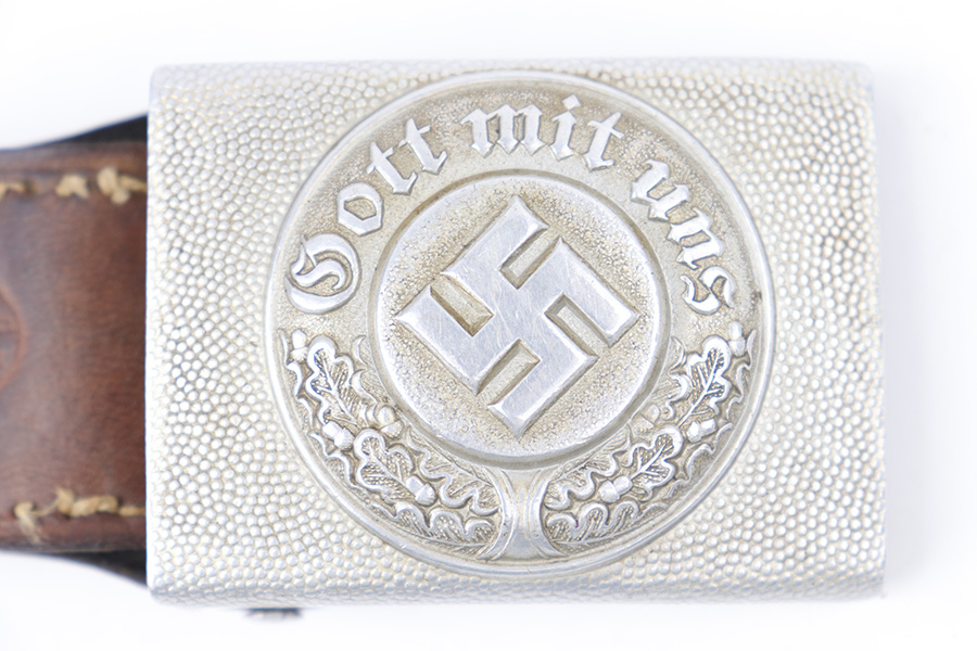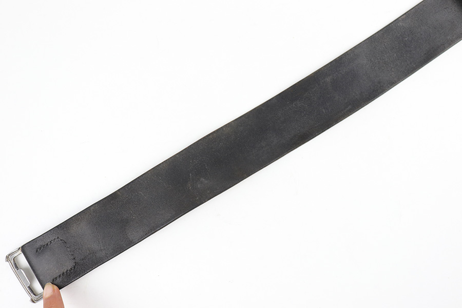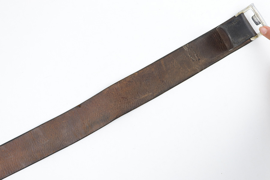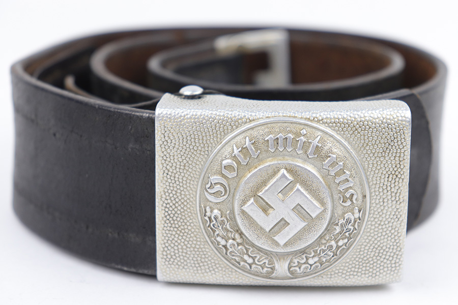3/27/23 – This is an original WW2 German Police belt and buckle. The buckle is aluminum with typical surface patina throughout and natural aging wear with no excessive damage. Maker stamped on the interior of the buckle. The attached leather tab is maker stamped with a 1939 date. The leather belt is in very good overall condition with nice leather that has no cracking or major issues and mild surface wear throughout. The size-adjustment leather tab has been re-stitched to the belt, but otherwise the stitching is original.