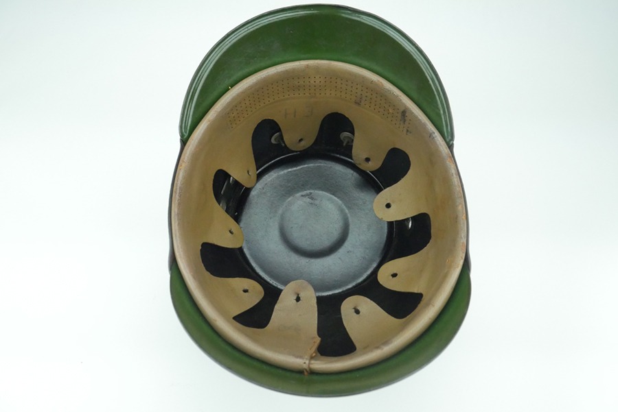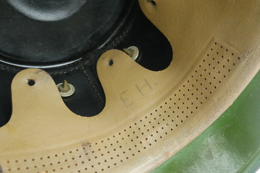 10/2/24 – This is a good example of a German police Shako hat from WW2. This particular shako is in overall good condition with little wear to the felt and leather that make up the shako. The shako does overall have discoloration to the felt and metal fittings that is consistent with nicotine staining from being in a smokey environment, giving it a dull yellowish/gold look. The inside of the Shako is missing the manufactures sticker, but still has it’s original leather liner intact. The liner is marked “E.H.”, possibly the initials of a prior owner. Overall, this Shako is in good condition, with all of the leather intact and still pliable.