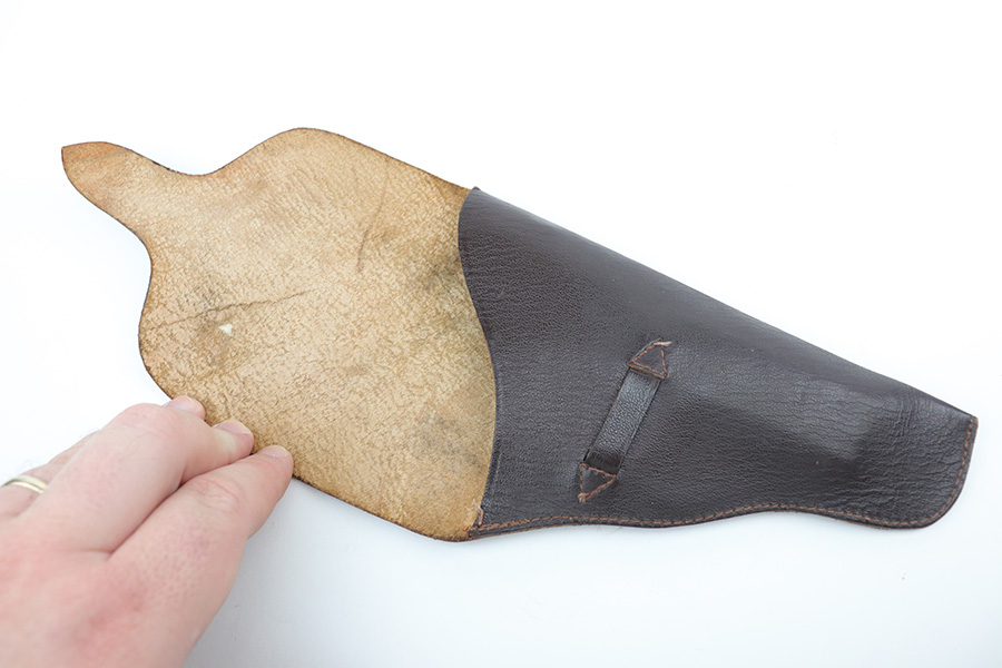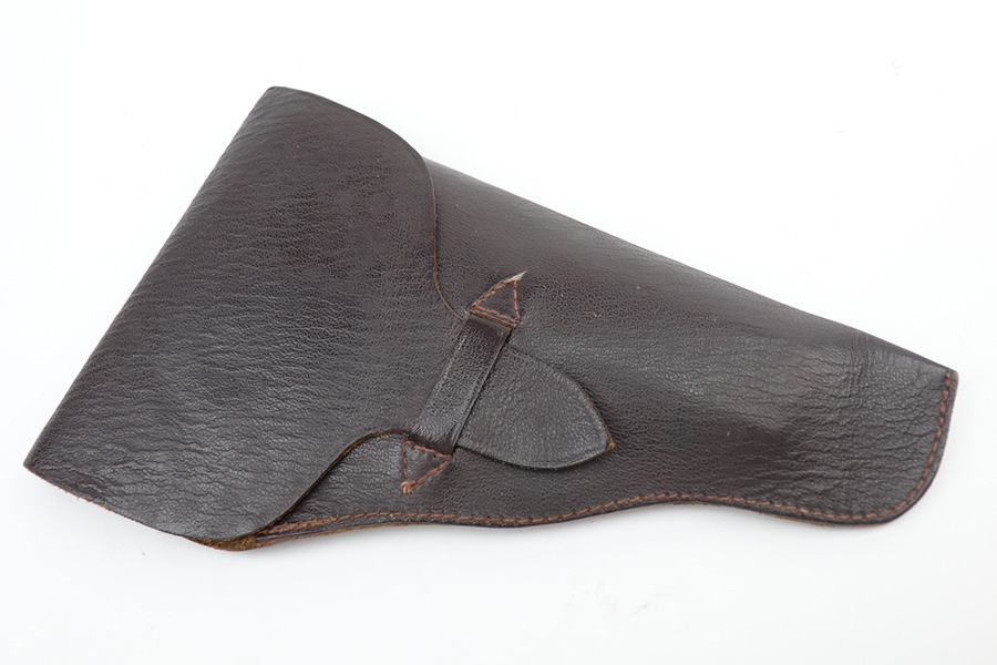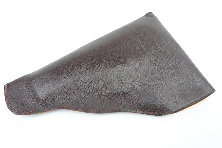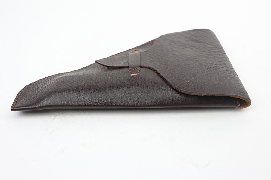 8/30/21 – This holster is made of soft brown leather and was produced before WW2. The lack of belt loop points to the fact that it was used primarily for the storage of, as opposed to carrying, a firearm. This particular holster fits either a Walther PP or PPK.